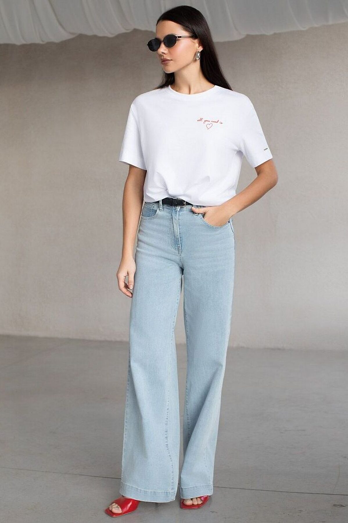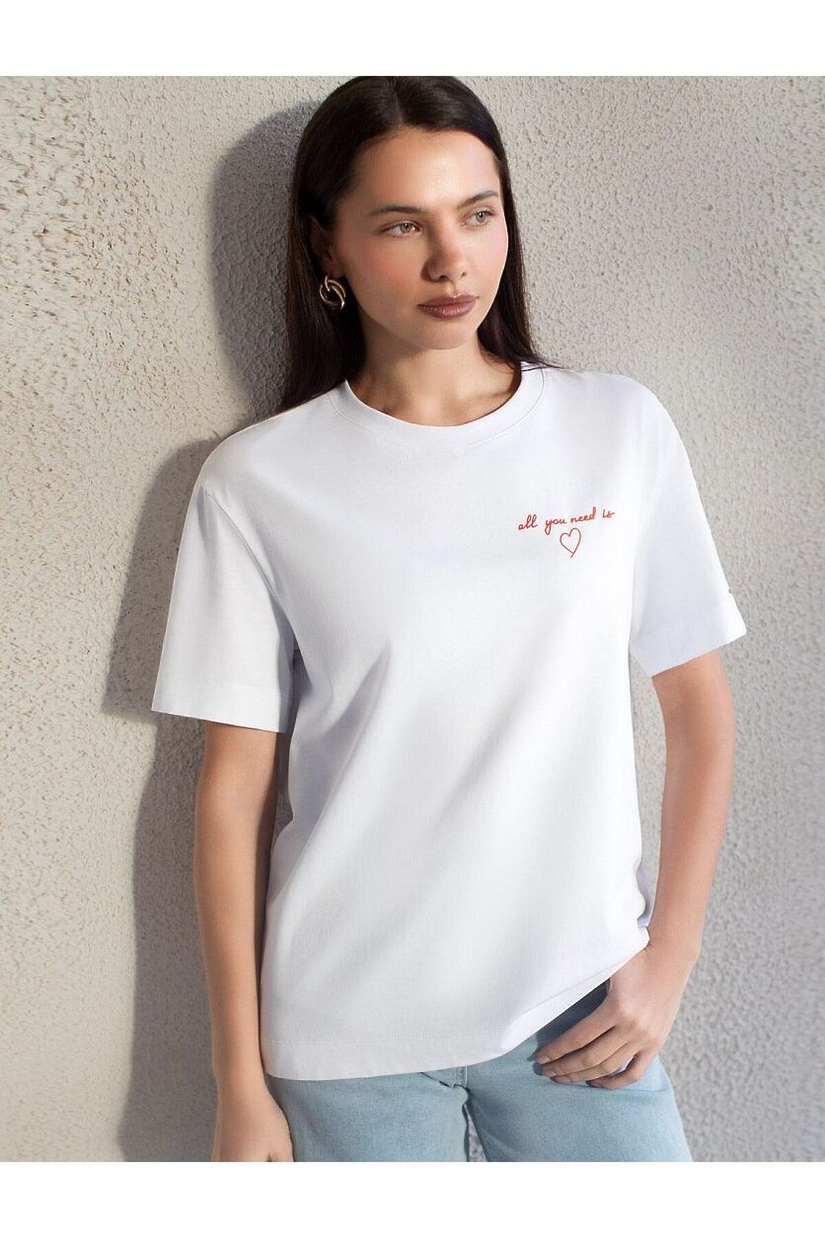 Модная футболка белого цвета привлекает внимание своим интересным дизайном и ярким принтом. Благодаря прямому крою изделие комфортно садится на любую фигуру, в том числе на большие размеры, и не сковывает движений. Круглый вырез подчеркивает современный стиль, а натуральный материал из хлопка с добавлением эластана обеспечивает удобство в повседневной носке и приятные тактильные ощущения. Прочность и износостойкая структура позволяют сохранять свежий внешний вид после множества стирок. Принт в виде надписи и сердца нанесен красками с устойчивым покрытием, перевод надписи: Al you need is love- Все, что вам нужно это любовь. Стильная футболка гармонично вписывается в любой гардероб и подойдет для прогулок, отдыха или неформальных встреч. Благодаря особенностям кроя модель хорошо сидит, скрывая недостатки и подчеркивая достоинства. Яркая футболка идеально сочетается с базовыми вещами, позволяя создавать новые интересные образы каждый день.