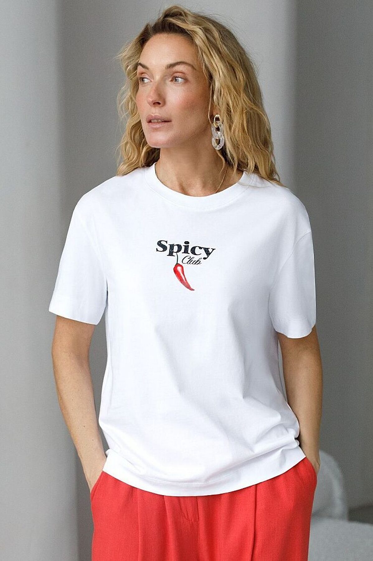 Модная футболка белого цвета привлекает внимание своим интересным дизайном и ярким принтом. Благодаря прямому крою изделие комфортно садится на любую фигуру, в том числе на большие размеры, и не сковывает движений. Круглый вырез подчеркивает современный стиль, а натуральный материал из хлопка с добавлением эластана обеспечивает удобство в повседневной носке и приятные тактильные ощущения. Прочность и износостойкая структура позволяют сохранять свежий внешний вид после множества стирок. Принт в виде перчика и надписи нанесен красками с устойчивым покрытием, перевод надписи: Spice club - Клуб специй. Стильная футболка гармонично вписывается в любой гардероб и подойдет для прогулок, отдыха или неформальных встреч. Благодаря особенностям кроя модель хорошо сидит, скрывая недостатки и подчеркивая достоинства. Яркая футболка идеально сочетается с базовыми вещами, позволяя создавать новые интересные образы каждый день.