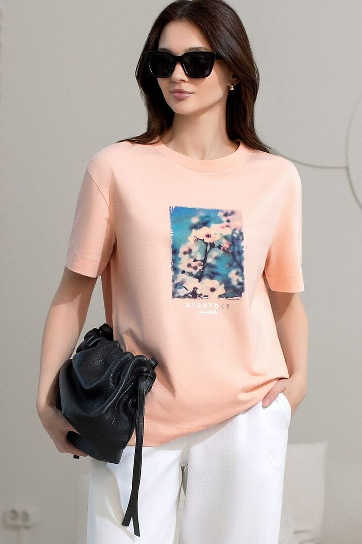 Модная футболка пудрового цвета привлекает внимание своим интересным дизайном и ярким принтом. Благодаря прямому крою изделие комфортно садится на любую фигуру, в том числе на большие размеры, и не сковывает движений. Круглый вырез подчеркивает современный стиль, а натуральный материал из хлопка с добавлением эластана обеспечивает удобство в повседневной носке и приятные тактильные ощущения. Прочность и износостойкая структура позволяют сохранять свежий внешний вид после множества стирок. Принт в виде цветов и надписи нанесен красками с устойчивым покрытием, перевод надписи: Everyday essentials - Повседневные вещи, которые необходимы., Стильная футболка гармонично вписывается в любой гардероб и подойдет для прогулок, отдыха или неформальных встреч. Благодаря особенностям кроя модель хорошо сидит, скрывая недостатки и подчеркивая достоинства. Яркая футболка идеально сочетается с базовыми вещами, позволяя создавать новые интересные образы каждый день.