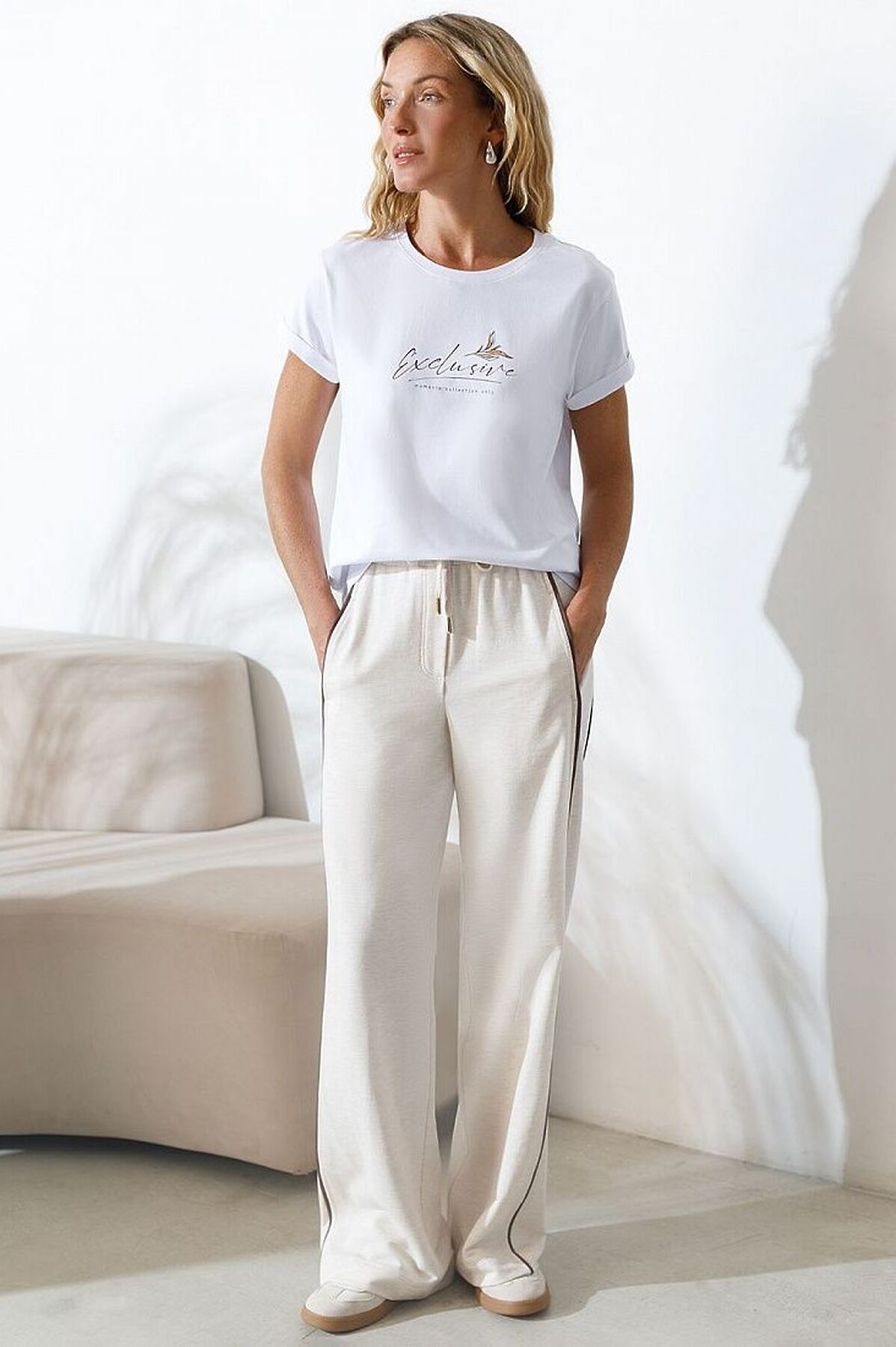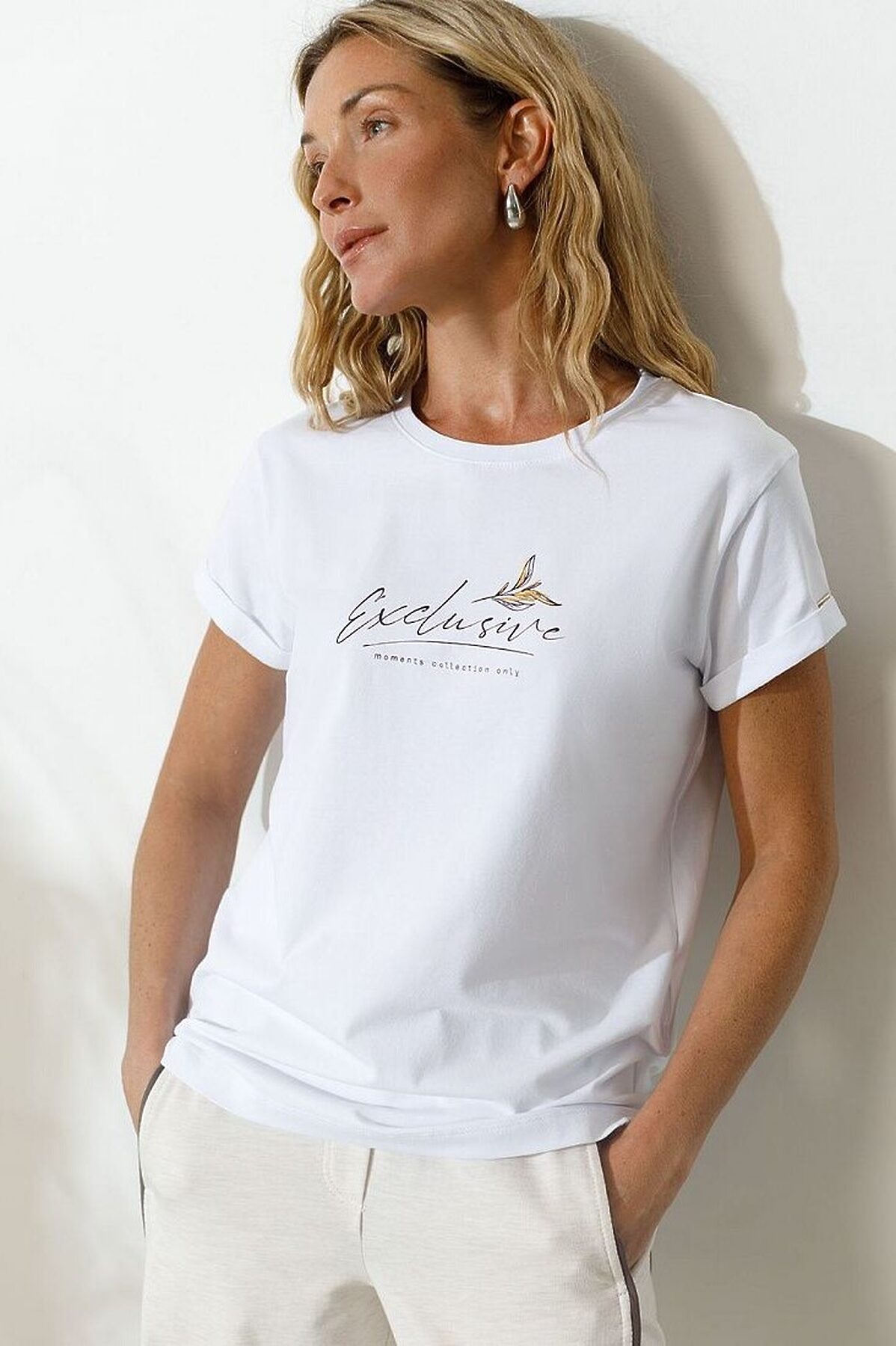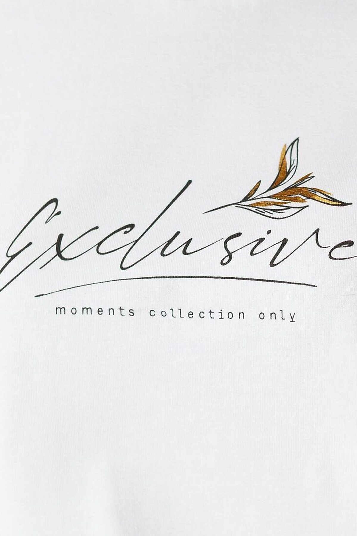Модная футболка белого цвета привлекает внимание своим интересным дизайном и ярким принтом. Благодаря прямому крою изделие комфортно садится на любую фигуру, в том числе на большие размеры, и не сковывает движений. Круглый вырез подчеркивает современный стиль, а натуральный материал из хлопка с добавлением эластана обеспечивает удобство в повседневной носке и приятные тактильные ощущения. Прочность и износостойкая структура сохраняет первоначальную форму футболки после множества стирок. Рукава имеют аккуратные подгибы, что придает изделию завершенность и помогает сохранять аккуратный внешний вид. Принт в виде надписи нанесен красками с устойчивым покрытием, перевод надписи: Exluzive moments collection only - Только коллекция эксклюзивных моментов. Стильная футболка гармонично вписывается в любой гардероб и подойдет для прогулок, отдыха дома или неформальных встреч. Благодаря особенностям кроя модель хорошо сидит, скрывая недостатки и подчеркивая достоинства. Удобная футболка идеально сочетается с базовыми вещами, позволяя создавать новые интересные образы каждый день.