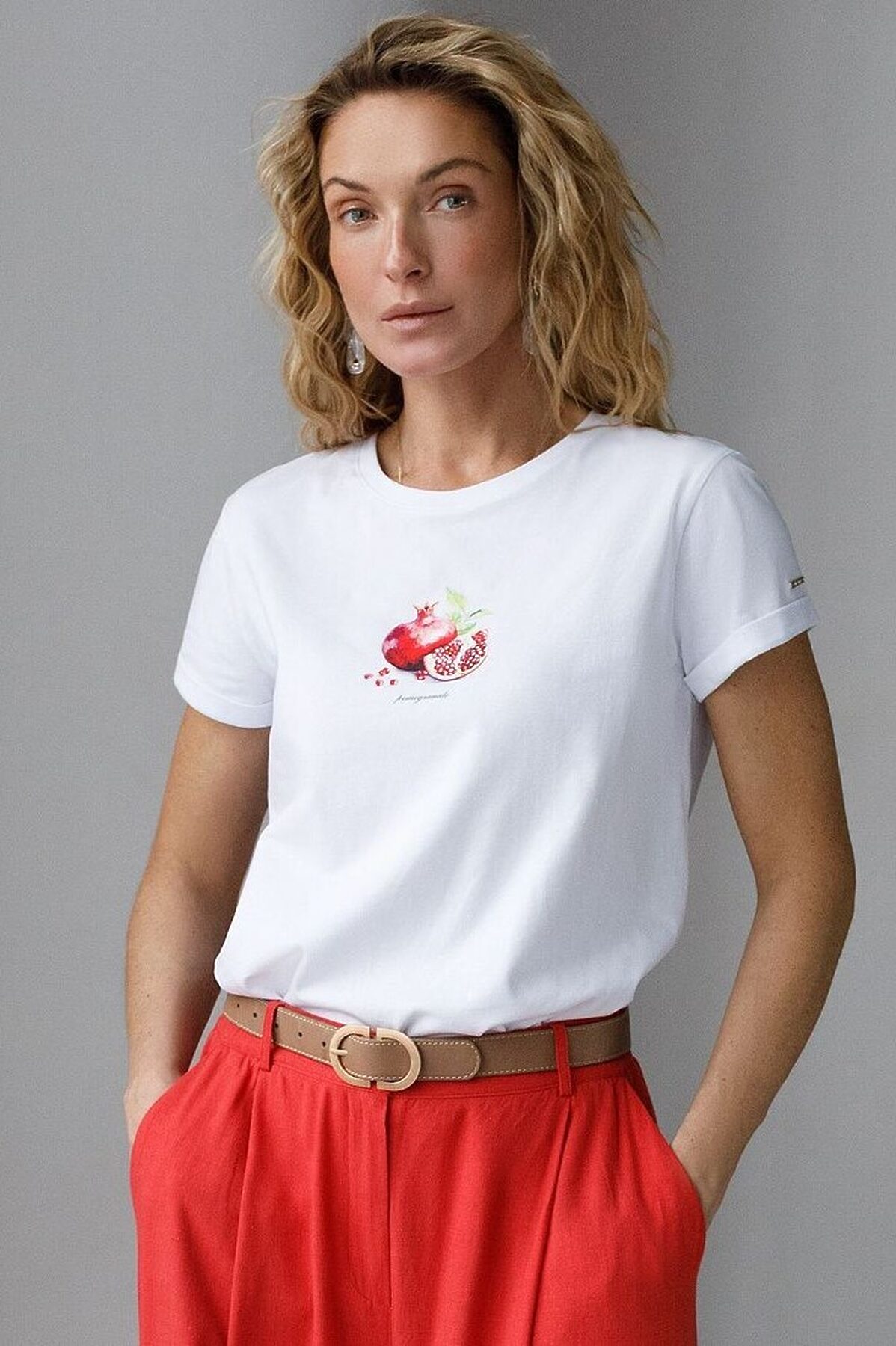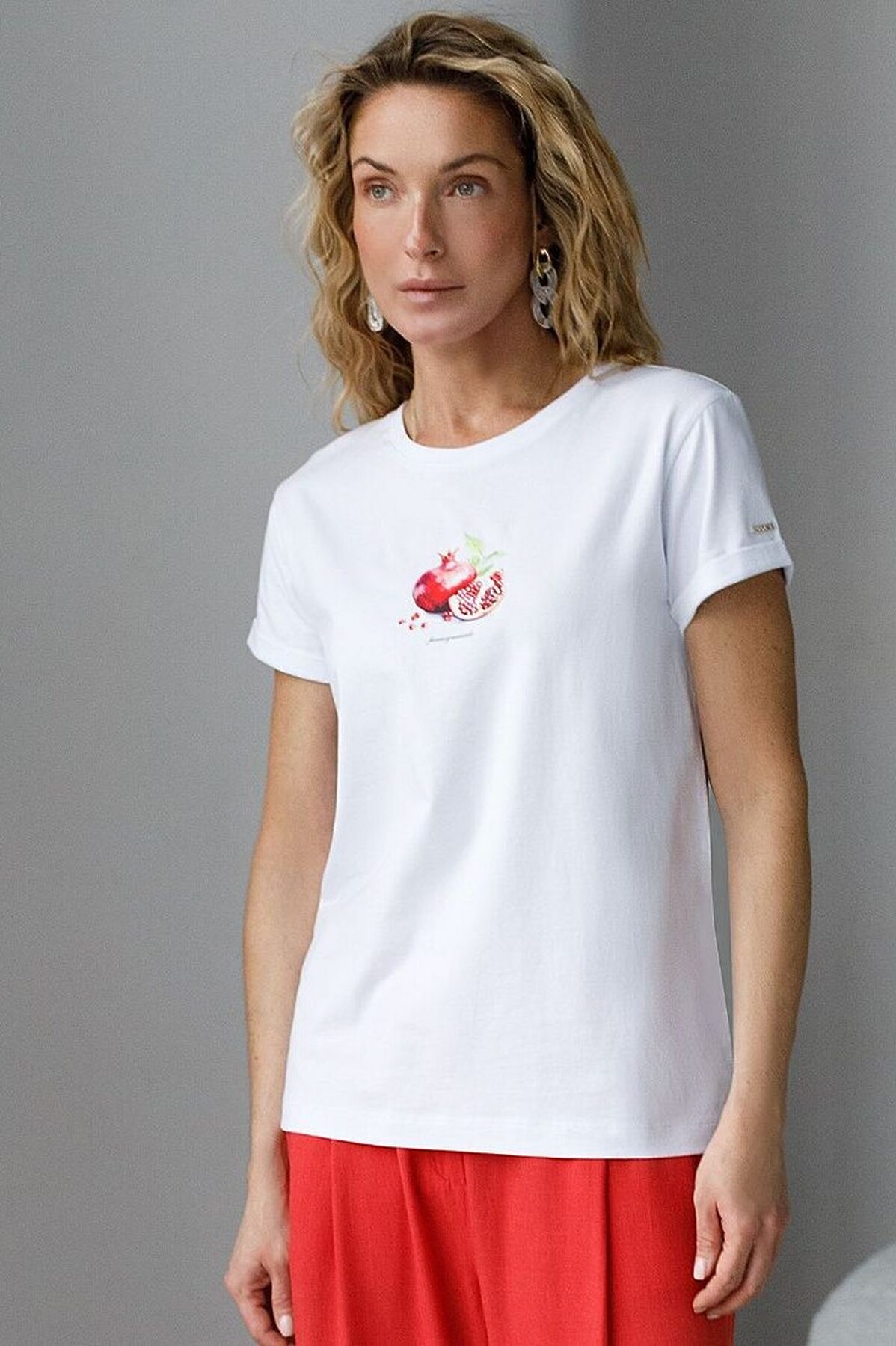 Модная футболка белого цвета привлекает внимание своим интересным дизайном и ярким принтом. Благодаря прямому крою изделие комфортно садится на любую фигуру, в том числе на большие размеры, и не сковывает движений. Круглый вырез подчеркивает современный стиль, а натуральный материал из хлопка с добавлением эластана обеспечивает удобство в повседневной носке и приятные тактильные ощущения. Прочность и износостойкая структура сохраняет первоначальную форму футболки после множества стирок. Рукава имеют аккуратные подгибы, что придает изделию завершенность и помогает сохранять аккуратный внешний вид. Принт в виде фрукта гранат нанесен красками с устойчивым покрытием. Стильная футболка гармонично вписывается в любой гардероб и подойдет для прогулок, отдыха дома или неформальных встреч. Благодаря особенностям кроя модель хорошо сидит, скрывая недостатки и подчеркивая достоинства. Удобная футболка идеально сочетается с базовыми вещами, позволяя создавать новые интересные образы каждый день.