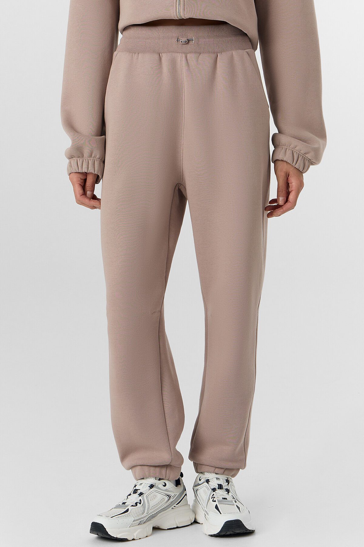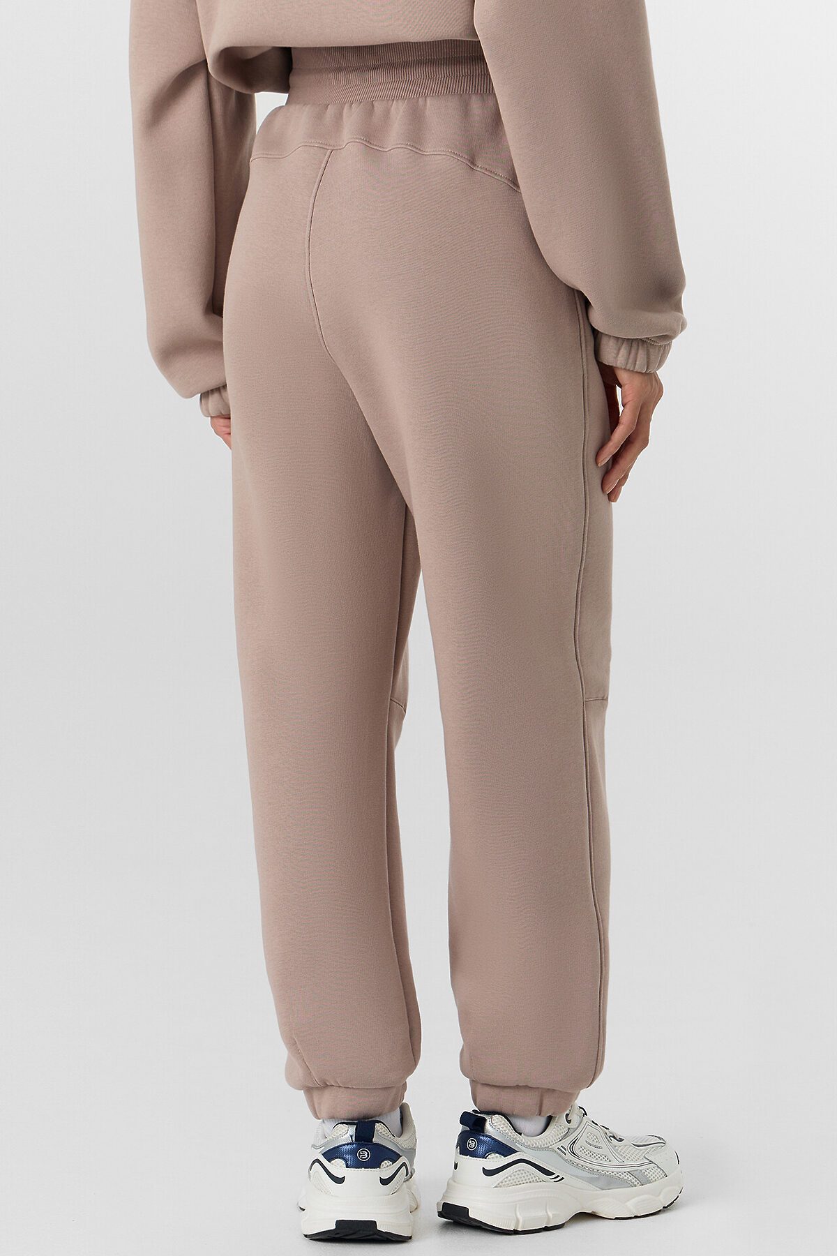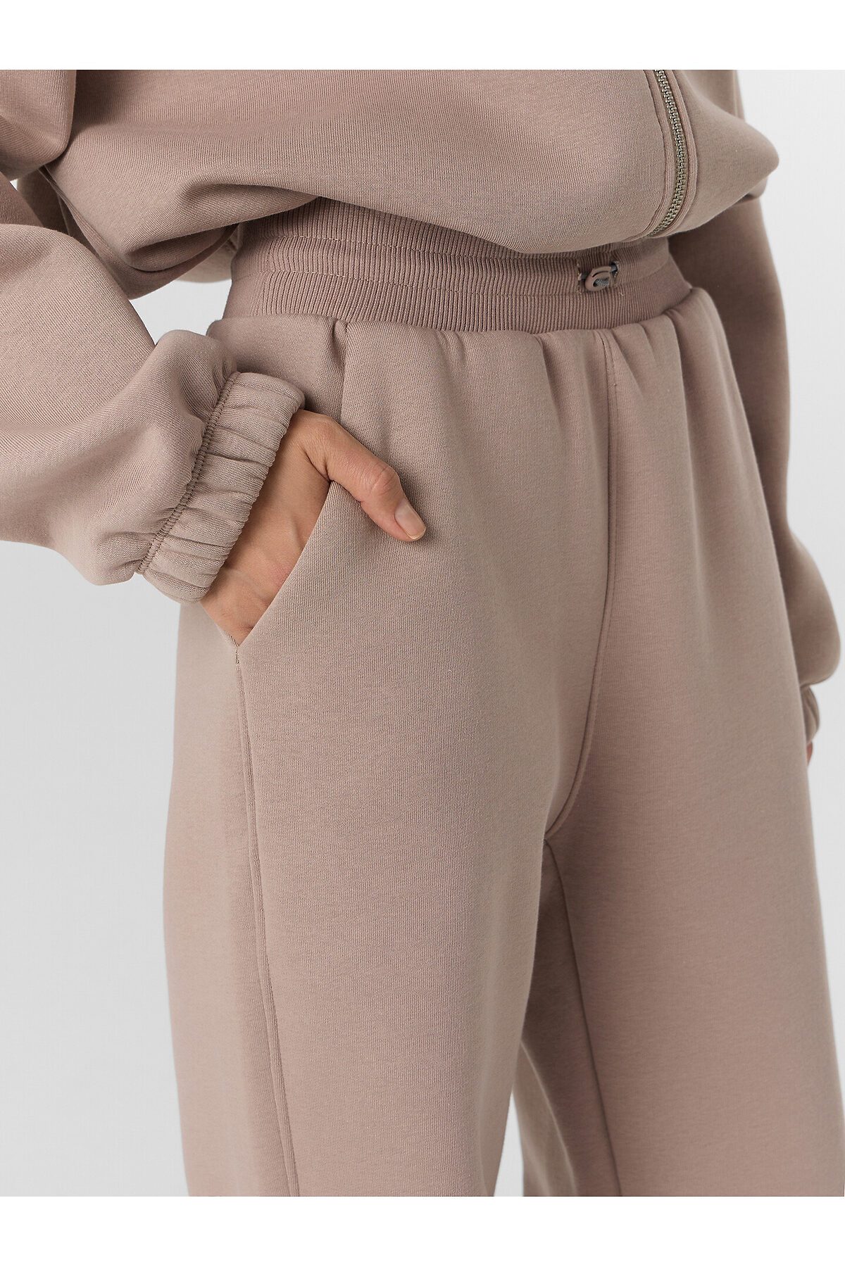 Брюки женские из трикотажного полотна футер. Силуэт свободный. Карманы в боковых швах, подкладка карманов из кулирного полотна. Пояс отрезной из рибаны, внутри эластичная тесьма 60RV, по центру присборен на шляпную резинку (SFKR-1, 2,8mm) с фиксатором (SFFKR-1, 15мм х12мм) . По спинке отрезная кокетка. По поясу проложены отделочные строчки. Низ брюк с отрезной манжетой из основного полотна, с эластичной тесьмой внутри (30RV).