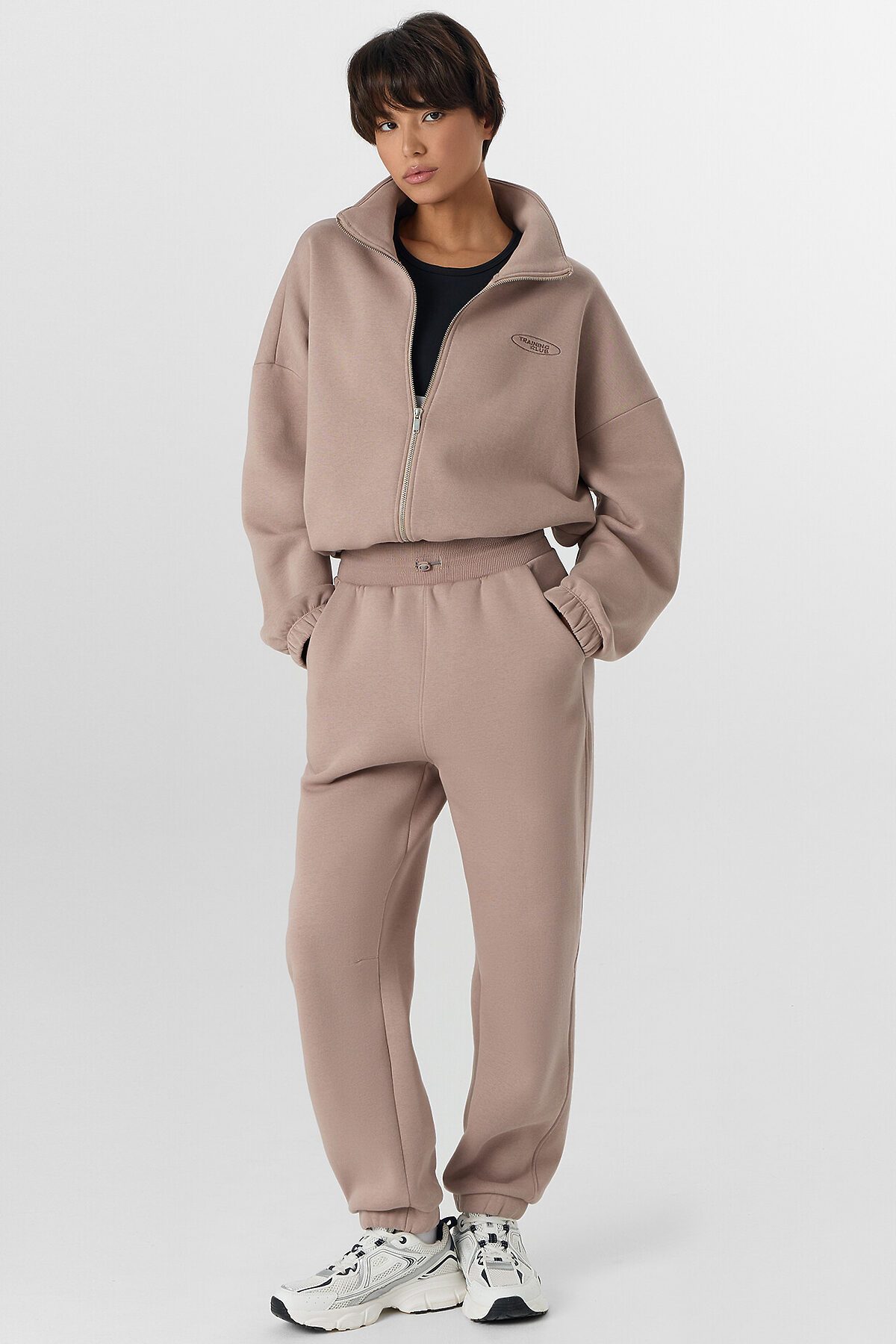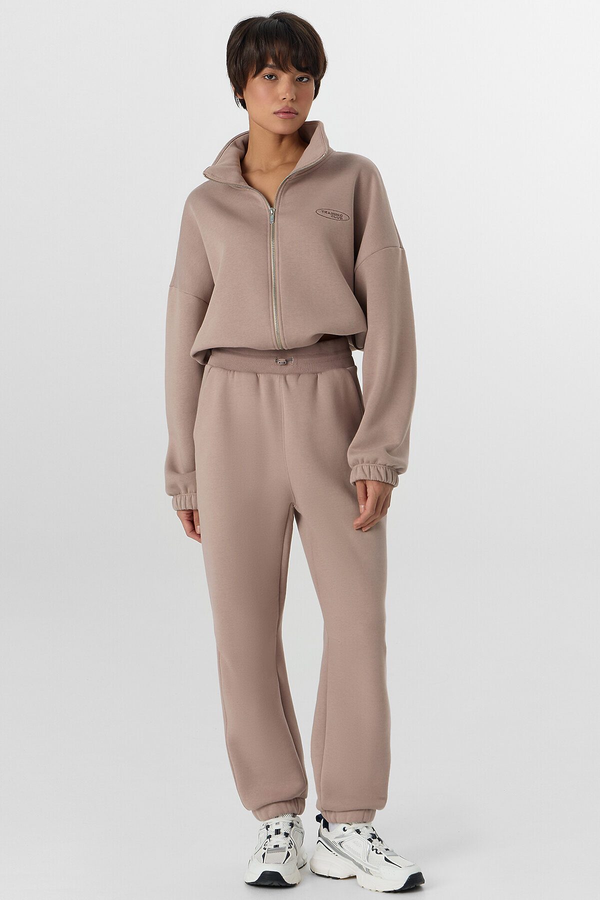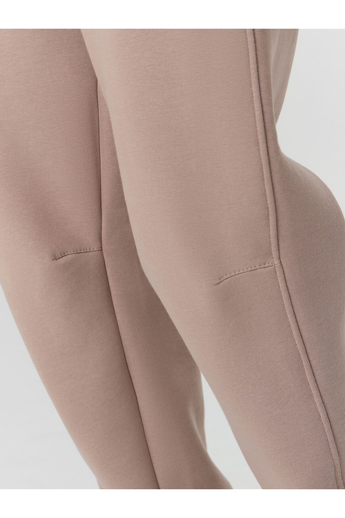 Брюки женские из трикотажного полотна футер. Силуэт свободный. Карманы в боковых швах, подкладка карманов из кулирного полотна. Пояс отрезной из рибаны, внутри эластичная тесьма 60RV, по центру присборен на шляпную резинку (SFKR-1, 2,8mm) с фиксатором (SFFKR-1, 15мм х12мм) . По спинке отрезная кокетка. По поясу проложены отделочные строчки. Низ брюк с отрезной манжетой из основного полотна, с эластичной тесьмой внутри (30RV).