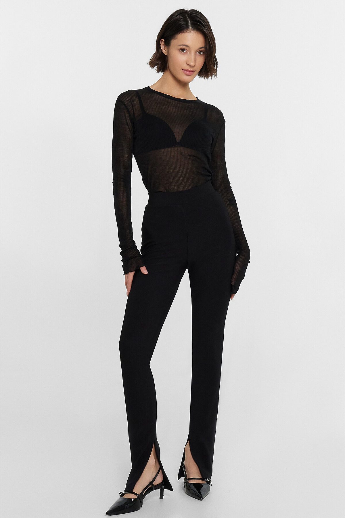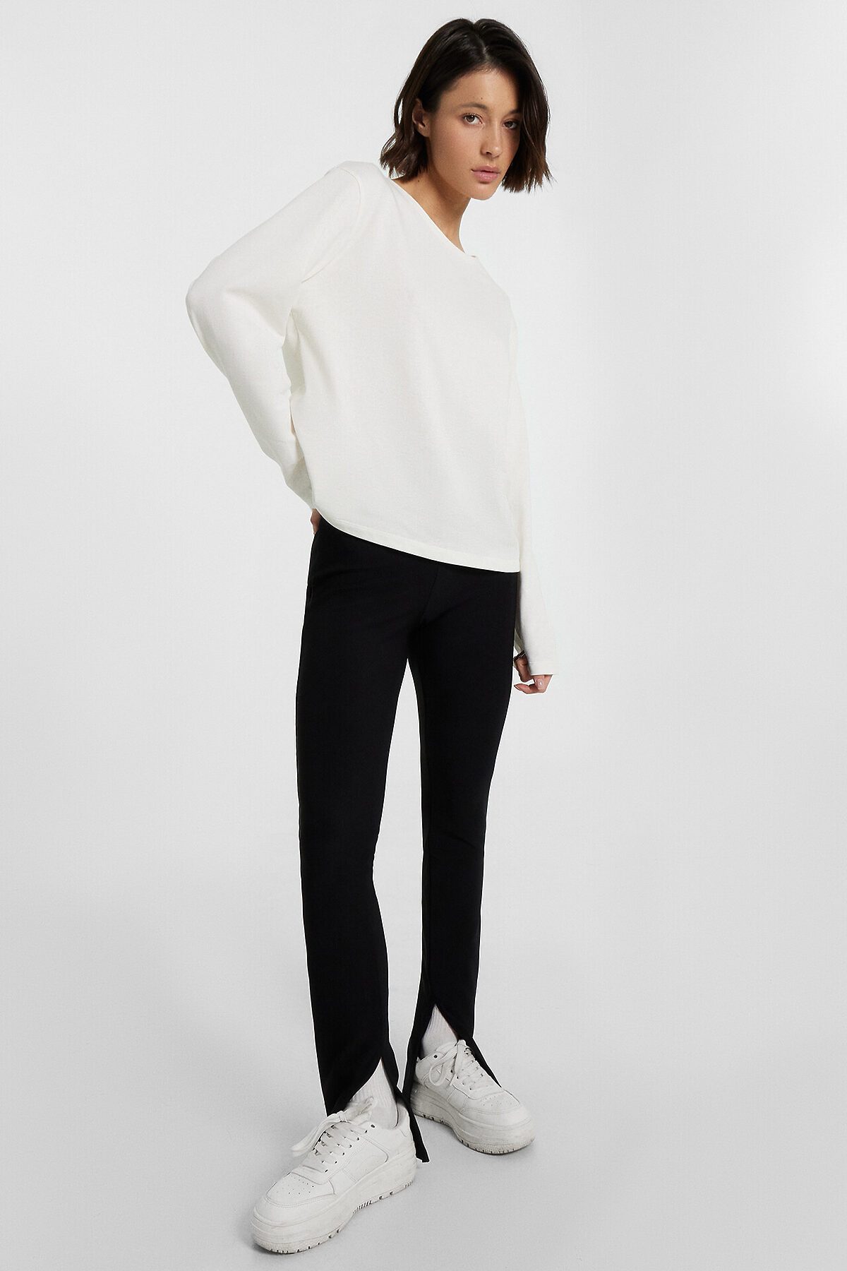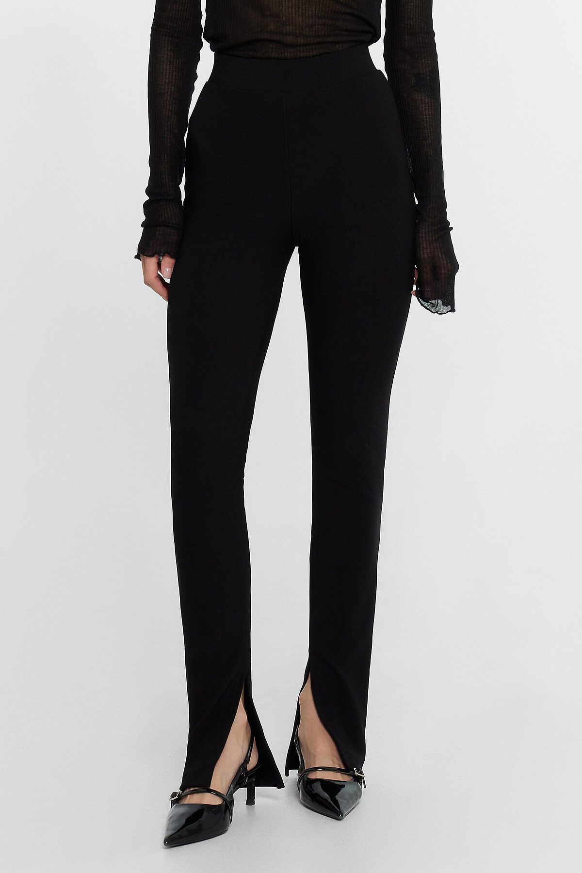 Брюки женские прилегающего силуэта из полотна трикотажного интерлок. Пояс отрезной с эластичной тесьмой внутри. В шагвом шве внизу обработан разрез. Брюки полной длины.