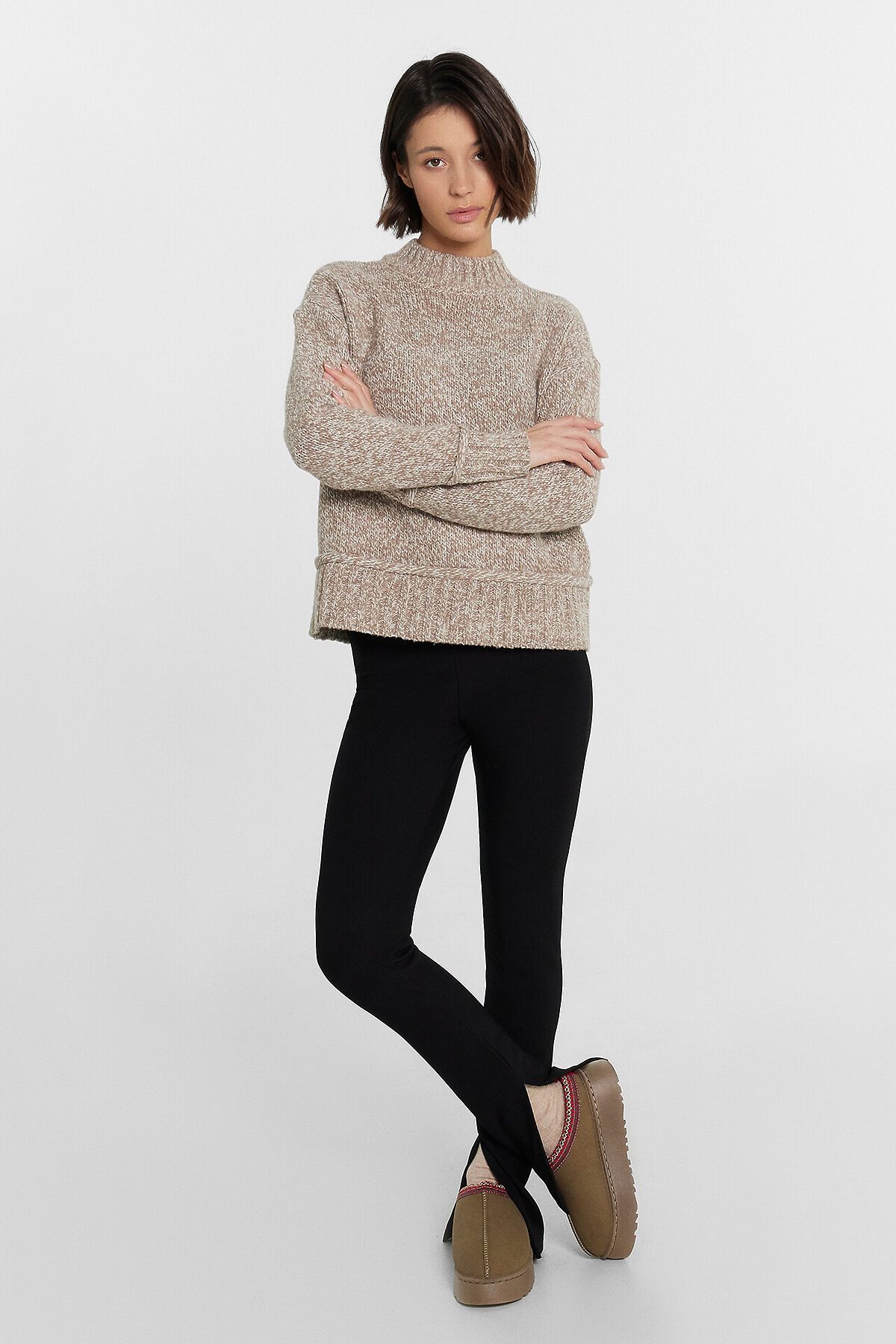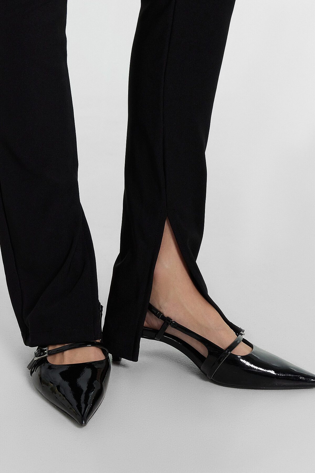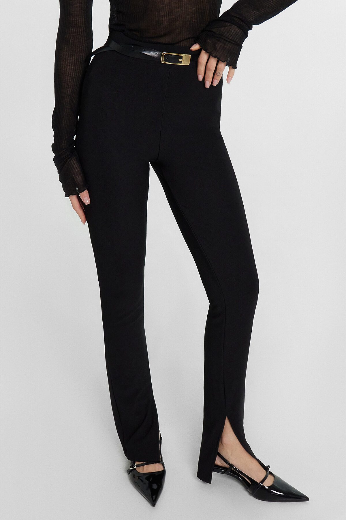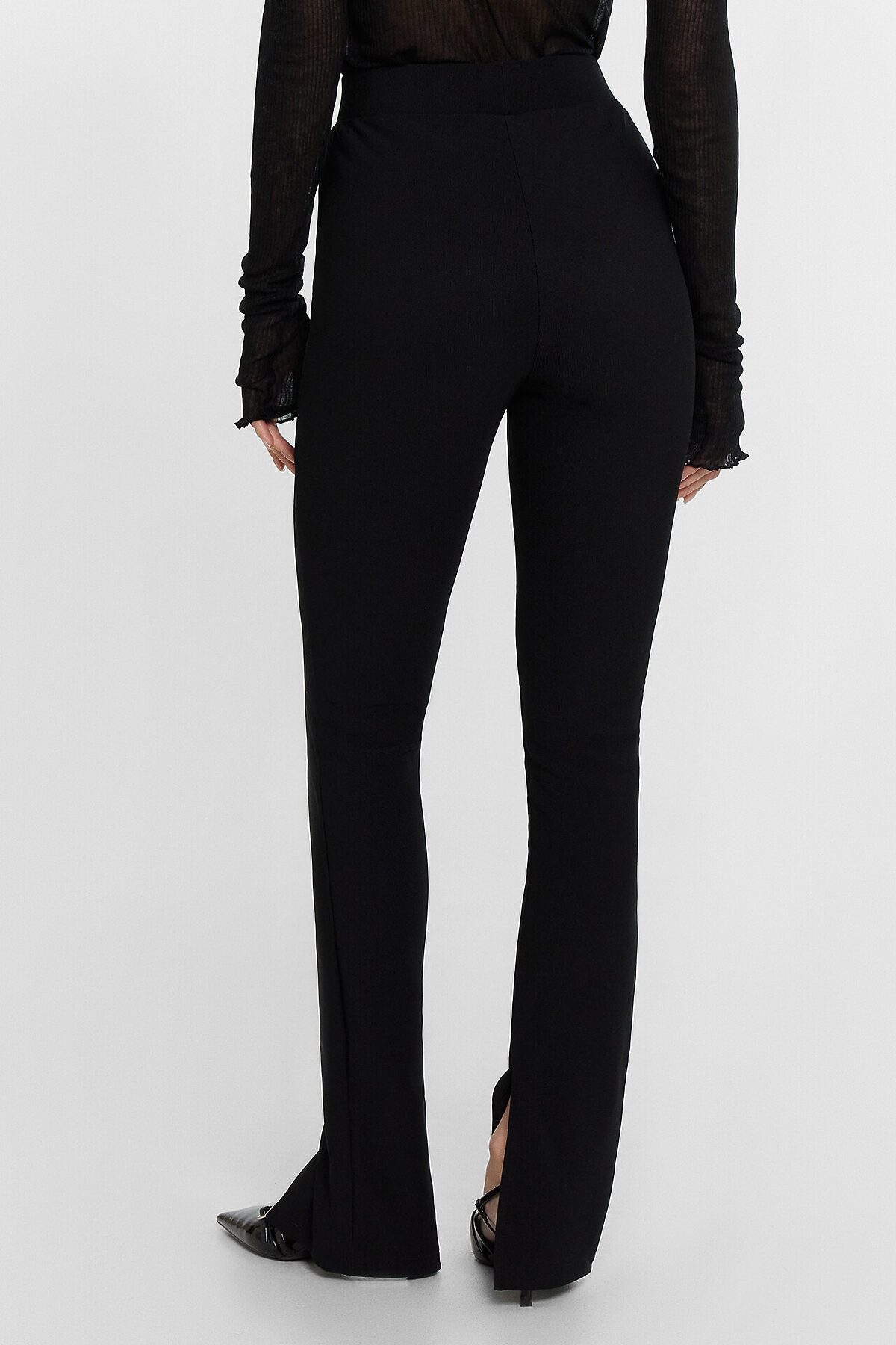 Брюки женские прилегающего силуэта из полотна трикотажного интерлок. Пояс отрезной с эластичной тесьмой внутри. В шагвом шве внизу обработан разрез. Брюки полной длины.