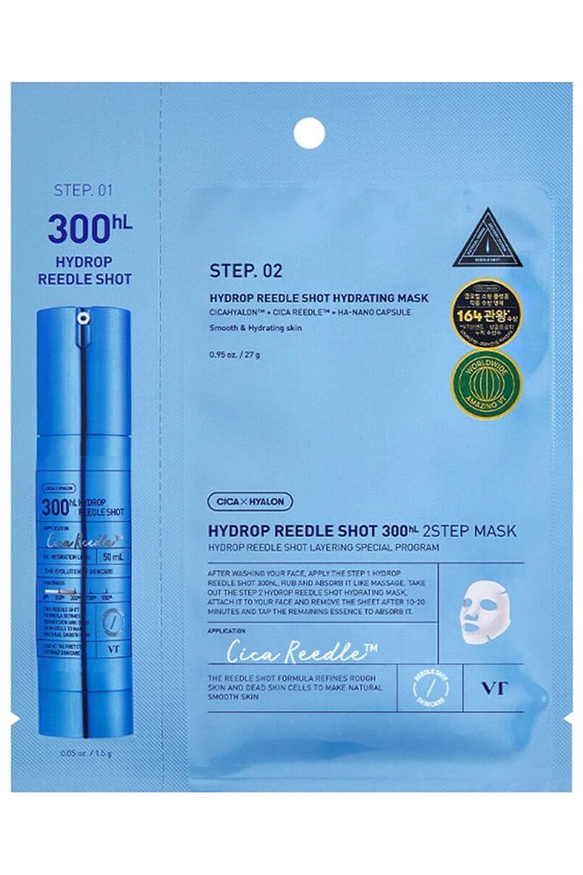 Маска — это 2 средства, которые интенсивно увлажняют глубокие слои кожи за счёт особой системы доставки компонентов. Двухфазная маска представляет собой бустер-сыворотку с микроиглами и плотное тканевое лекало, которое сделано из экологичного материала — биоразлагаемой целлюлозы. Продукт устраняет сухость, шелушение и чувство стянутости, разглаживает рельеф, придаёт упругость и здоровое сияние. Основные действующие компоненты: HA-Nano Capsule — капсулы гиалуроновой кислоты. За счёт маленького размера 300 Da капсулы проникают глубоко в роговой слой, обеспечивая интенсивное увлажнение. Cica Reedle™ — микроиглы, которые обеспечивают доставку активных компонентов глубоко в кожу. Состоят из кремния. Проникают в поры, стимулируют клеточное обновление. Cicahyalon™ — компонент, состоящий из экстракта зелёного прополиса, комплекса центеллы (мадекассосид, мадекассовая кислота, азиатикозид и азиатиковая кислота) и гиалуроновой кислоты. Успокаивает раздражение, увлажняет, поддерживает эластичность. Полиглутаминовая кислота (PGA) — аминокислотный полимер. Интенсивно увлажняет, устраняет шелушение и чувство стянутости. Улучшает способность клеток удерживать влагу, поддерживает синтез гиалуроновый кислоты, а также усиливает действие активных компонентов. Аллантоин смягчает, ускоряет заживление, оказывает антиоксидантное действие, снижает чувствительность. Эритритол дарит средству освежающий эффект, обладает успокаивающим действием, борется с зудом и раздражением, способствует удержанию влаги. Подходит для всех типов кожи. Способ применения: После умывания нанесите бустер-сыворотку на сухую кожу (шаг 1). Затем нанесите на лицо тканевую маску (шаг 2). Снимите маску через 10-20 минут, лёгкими похлопывающими движениями помогите впитаться остаткам эссенции. Внимание! Продукт может вызывать ощущение покалывания после нанесения. Меры предосторожности: не используйте одновременно с пилингами или скрабами, а также со средствами с ретинолом, AHA, BHA, витамином C в высокой концентрации. Не рекомендуется использование после дерматологических процедур, травмирующих роговой слой эпидермиса: пилингов, аппаратной косметологии, инъекций. Состав: Water, Glycerin, Dipropylene Glycol, Niacinamide, 1,2-hexanediol, Trehalose, Betaine, Erythritol, Acrylates/c10-30 Alkyl Acrylate Crosspolymer, Allantoin, Tromethamine, Hydroxyacetophenone, Caprylyl Glycol, Adenosine, Ethylhexylglycerin, Butylene Glycol, Disodium EDTA, Melia Azadirachta (Neem) Leaf Extract, Melia Azadirachta (Neem) Flower Extract, Ivy God Fruit Extract, Sodium Hyaluronate, Solanum Melongena (Eggplant) Fruit Extract, Bottle Grass Extract, Ocimum Tenuiflorum (Holy Basil) Leaf Extract, Coral Horse Extract, Curcuma Longa (Turmeric) Root Extract, Polyglutamic Acid, Silica, Phenyl Trimethicone, Polyglyceryl-10 Laurate, Polyglyceryl-10 Myristate, Hydrolyzed Sodium Hyaluronate, Hydrogenated Lecithin, Propolis Extract, Asiaticoside, Asiatic Acid, Madecassic Acid, Madecassoside, Decapeptide-40