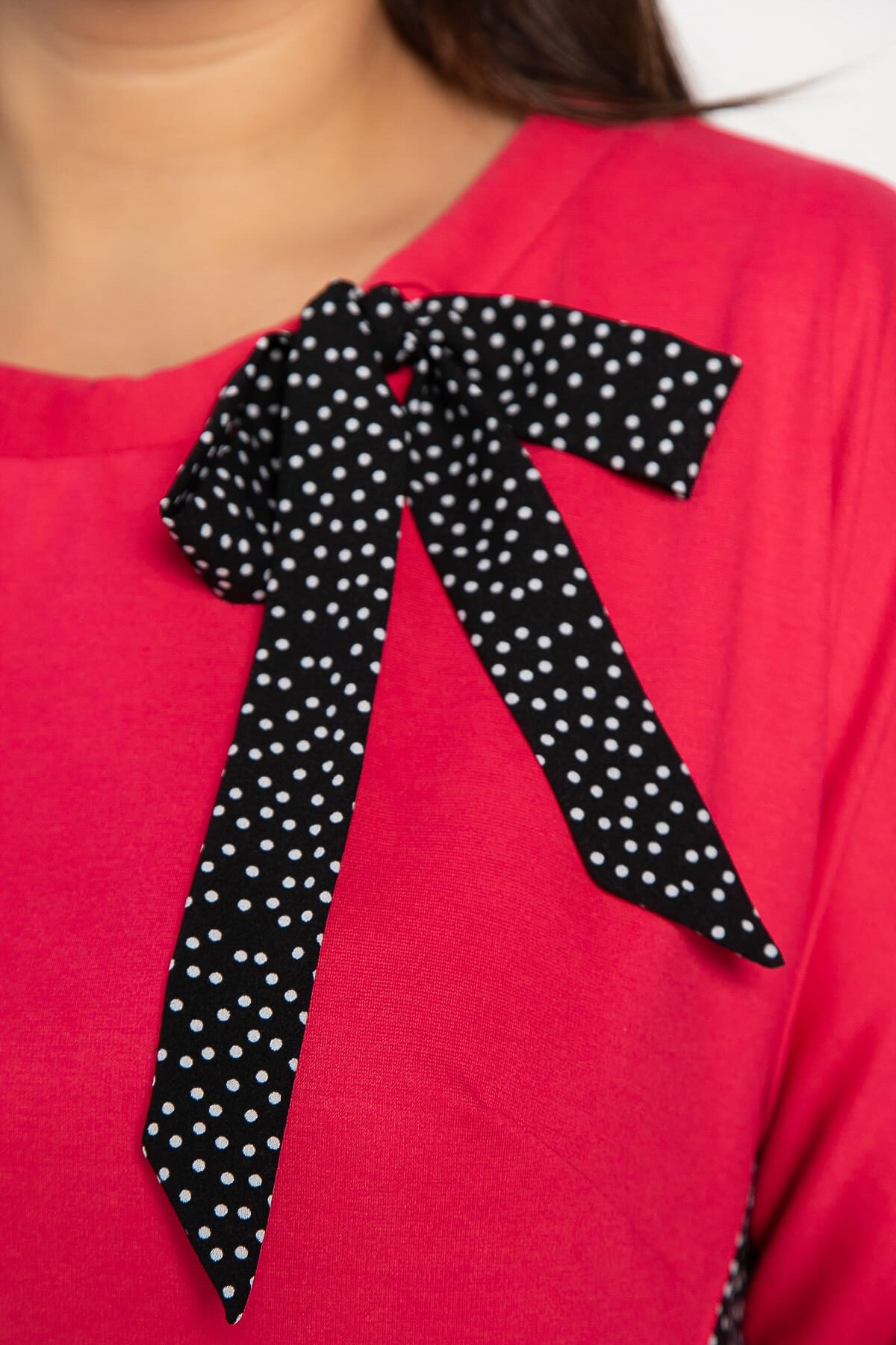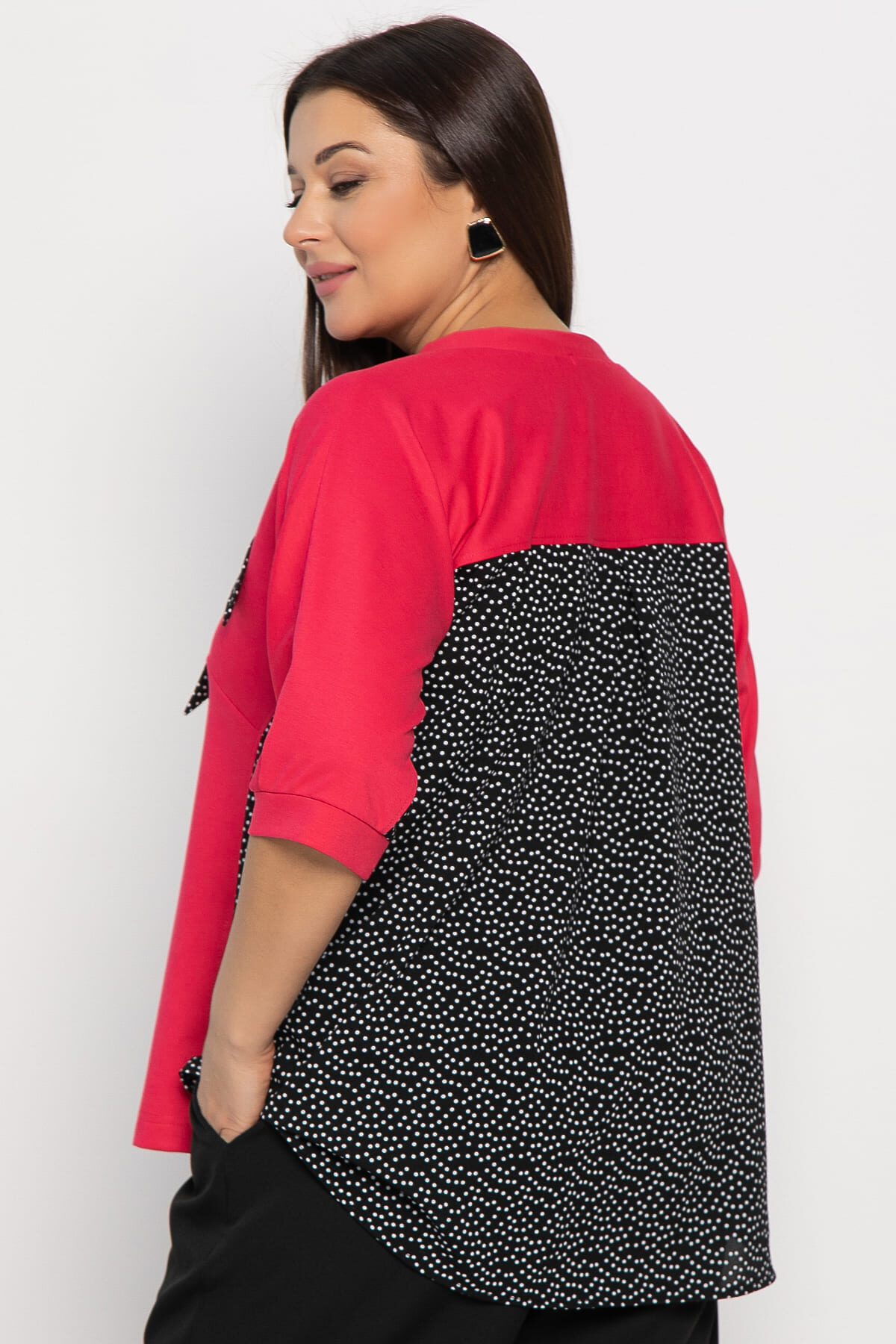 Изящная блуза в малиново-черной гамме и элегантном А-силуэте станет прекрасным дополнением вашего гардероба. Эта модель, созданная из двух видов ткани, сочетает комфорт и утонченность. Передняя часть выполнена из трикотажа, а спинка имеет трикотажную планку, которая переходит во второй вид ткани со встречной складкой, придавая блузе уникальный вид. Цельнокроеные рукава заканчиваются манжетом из основной ткани, что добавляет образу завершенности. Завершающим акцентом служит бант вдоль горловины, придающий блузе романтичный и женственный характер. Эта блуза идеально подходит как для повседневных, так и для более торжественных образов.