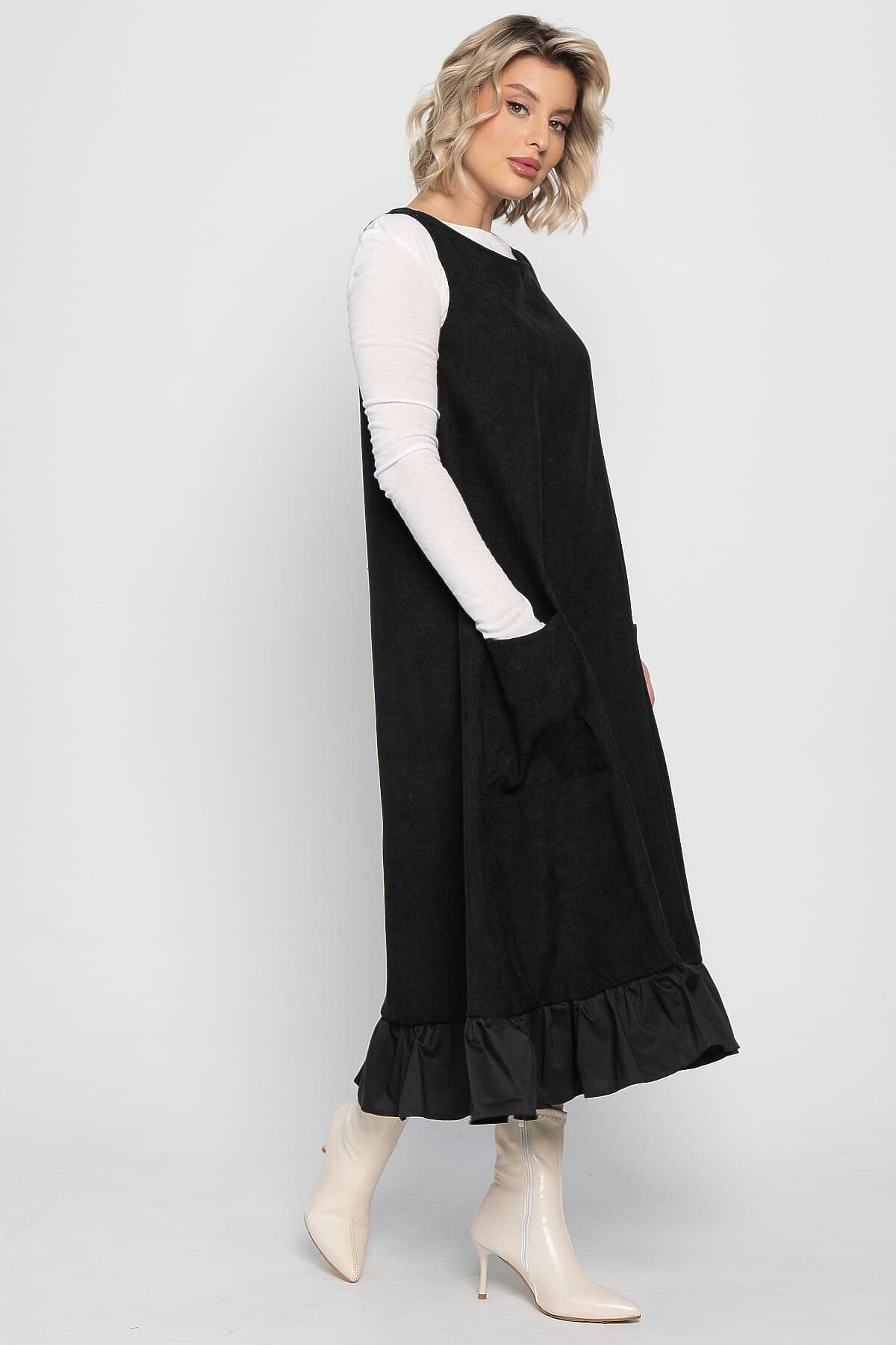 Стильный женский сарафан бохо из красивого вельвета в черном цвете. Форма длинного сарафана нестандартная: объёмный вверх и зауженный к низу. У сарафана заниженные объёмные накладные карманы и широкие бретели. В нашем платье-сарафане вы не останетесь незамеченной! Такая женская одежда прекрасно сочетается как со строгой рубашкой так и с обычной водолазкой!