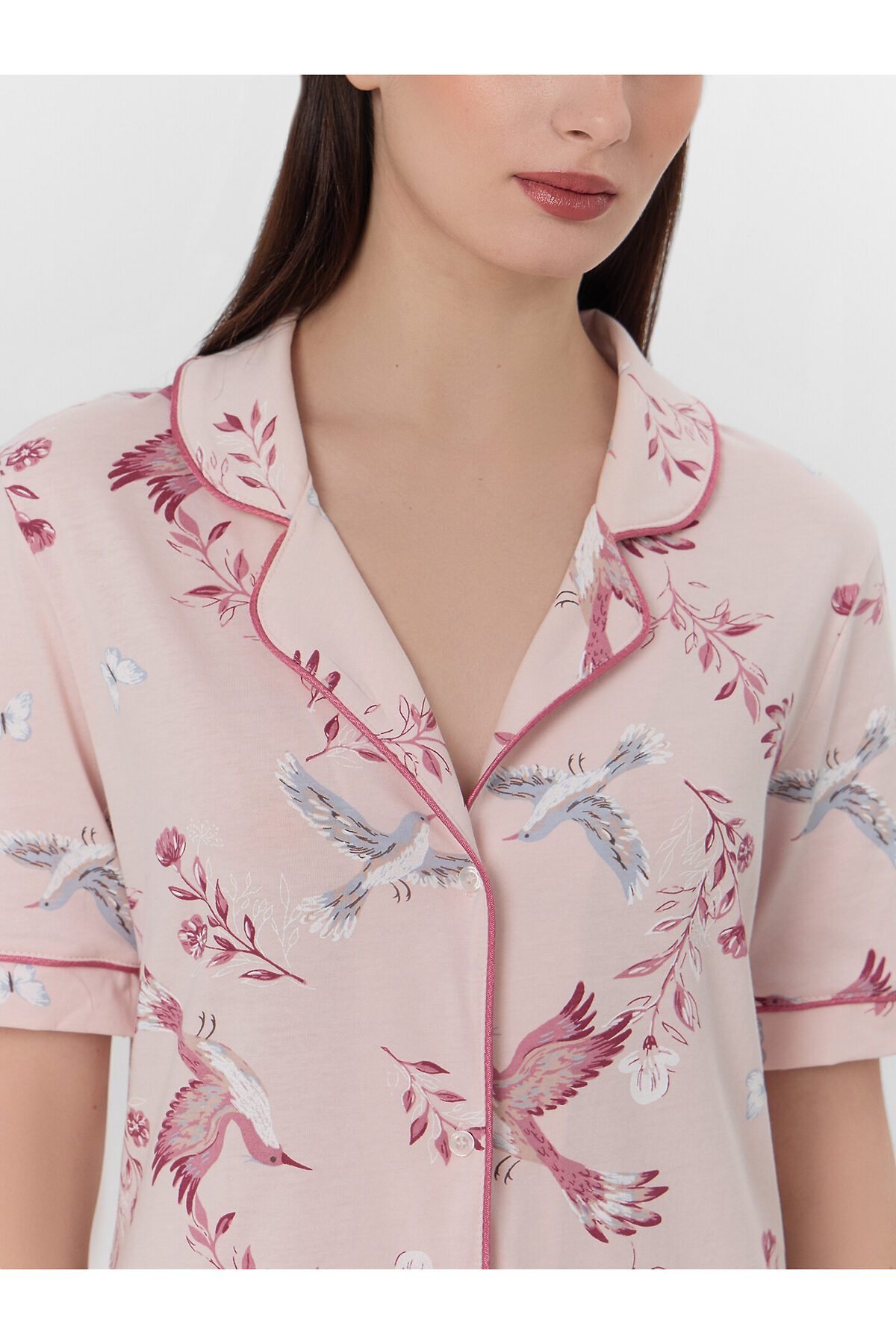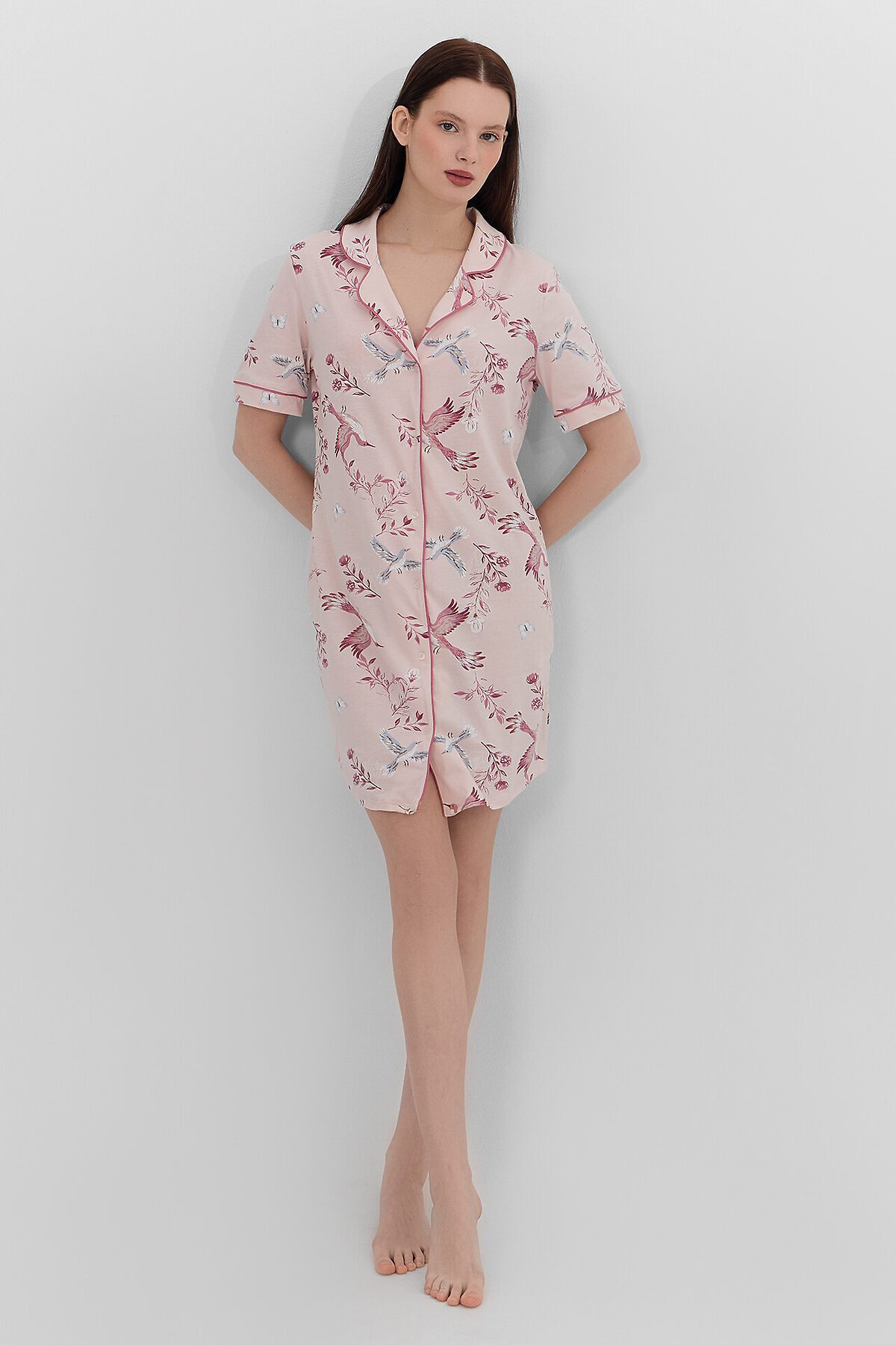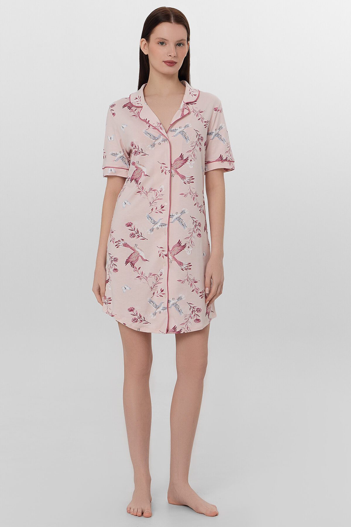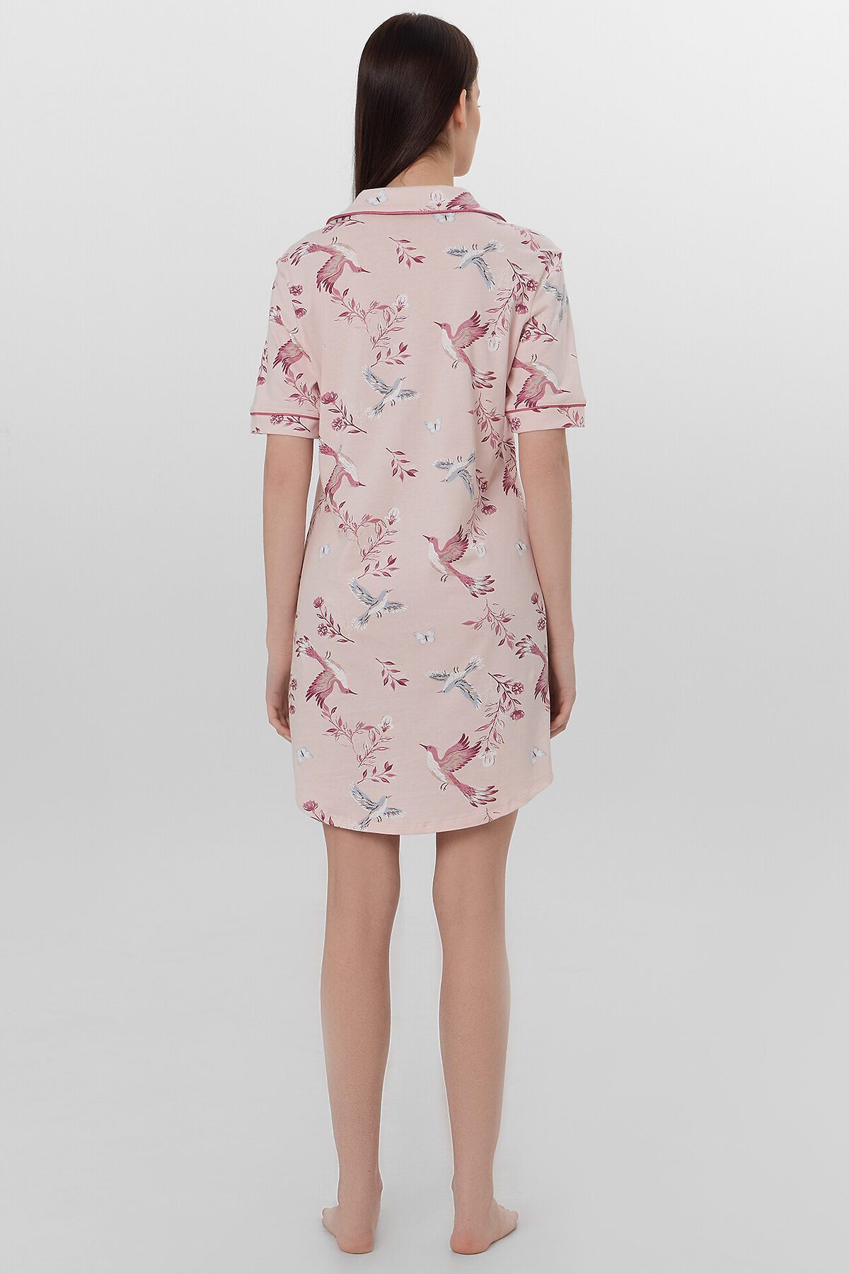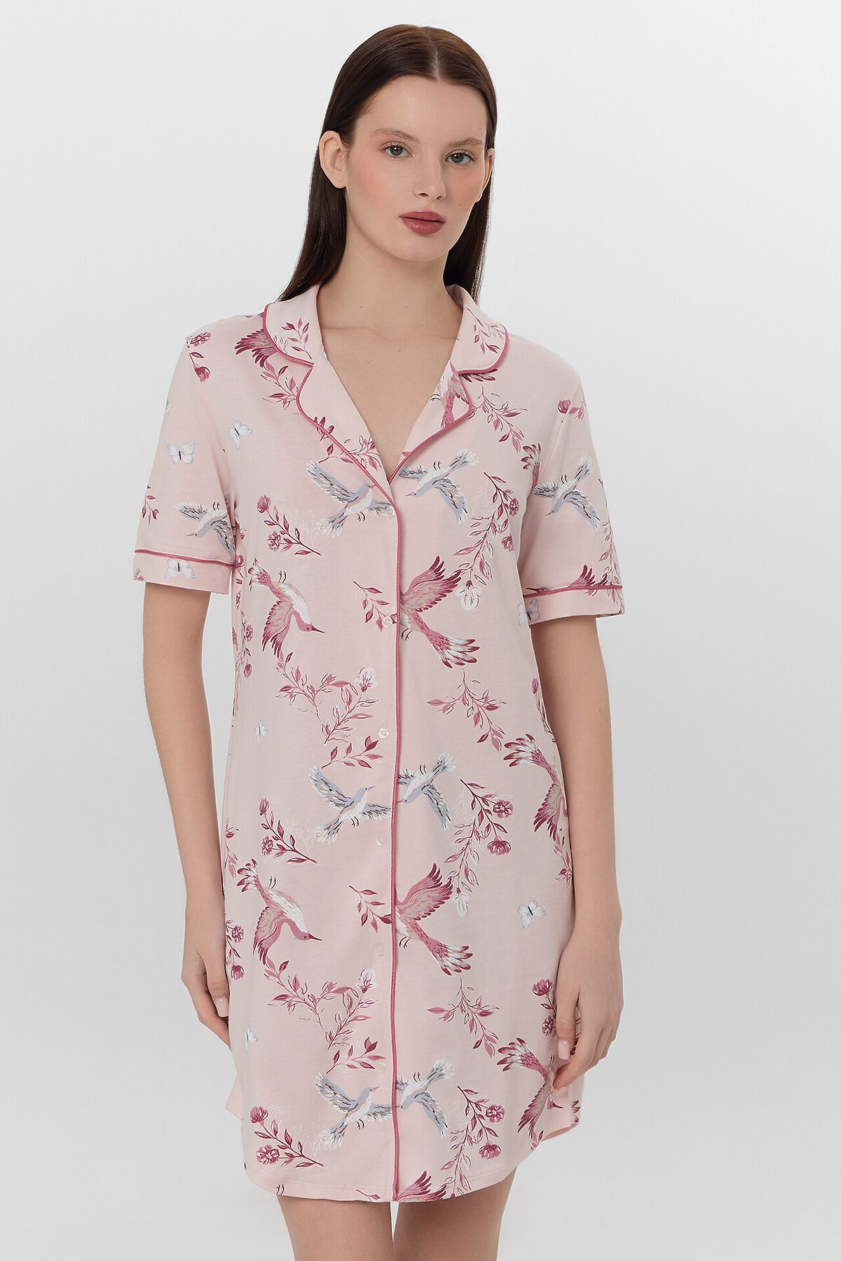 Ночная сорочка с нежным принтом птиц создает образ утонченной женственности и спокойного отдыха. Прямой силуэт и длина выше колена обеспечивают комфорт и легкость движений во время сна.