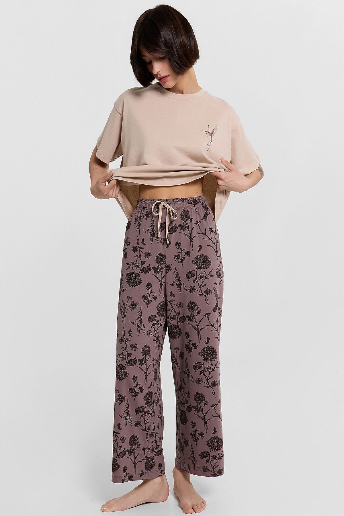 Особую элегантность комплекту придает пришивная бейка на поясе, которая завязывается в нежный бант из основного материала. Все швы аккуратно обработаны, что обеспечивает долговечность даже после многократных стирок.