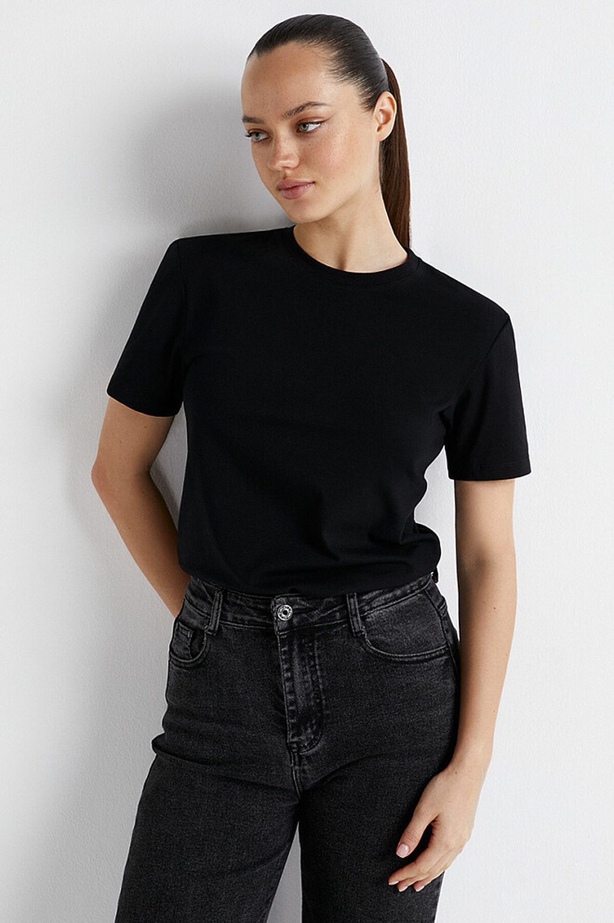Женская футболка с коротким рукавом. В составе – высококачественный хлопок, который обладает отличной воздухопроницаемостью, хорошо впитывает влагу и подходит даже для чувствительной кожи, и эластан, который позволяет создать полуприлегающий силуэт и способствует длительному сохранению формы и цвета. Удобная, легкая и стильная. Благодаря прямому крою и свободному силуэту эффектно смотрится независимо от типа фигуры, обеспечивает свободу движений, и подходит как для занятий спортом, так и на каждый день.
