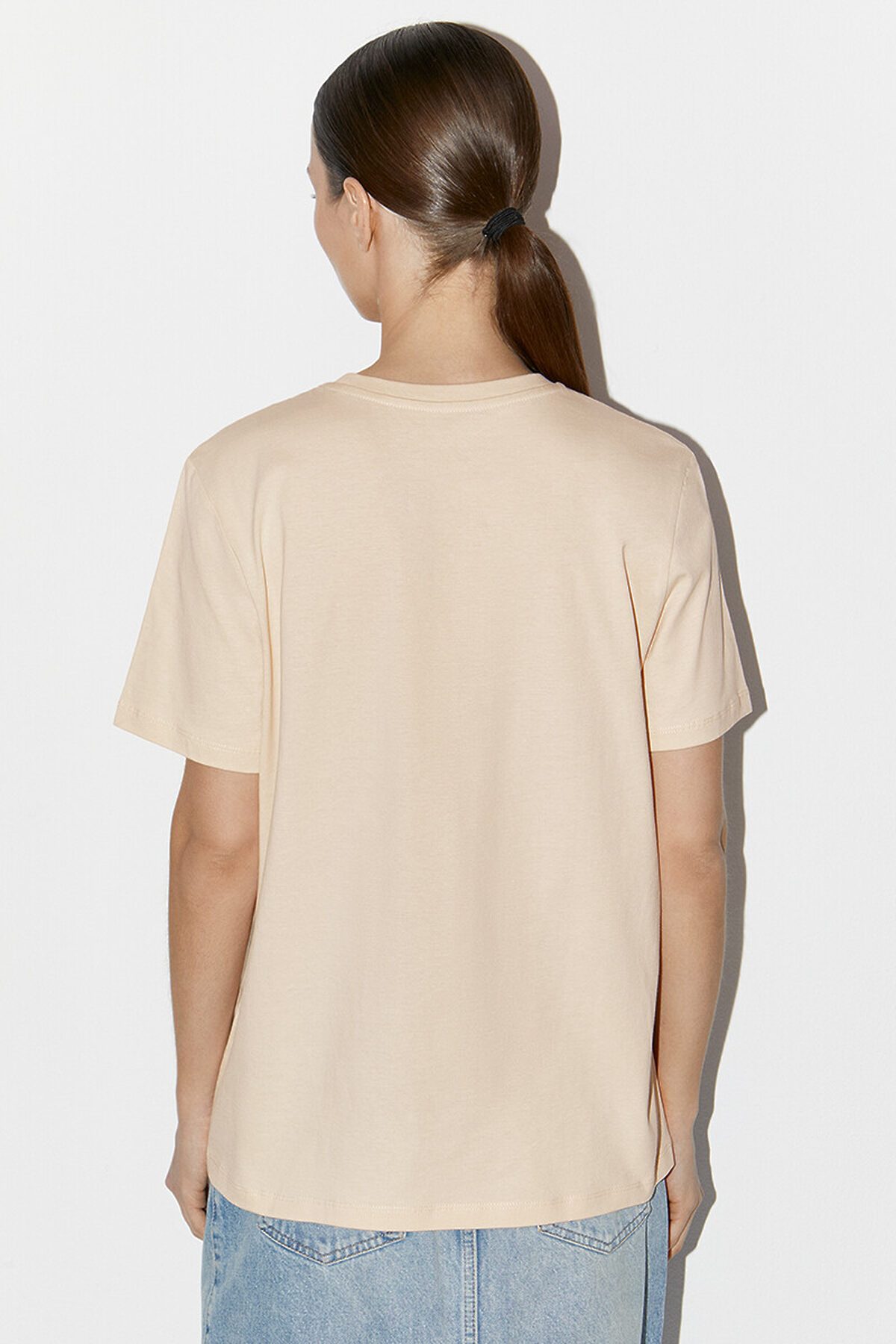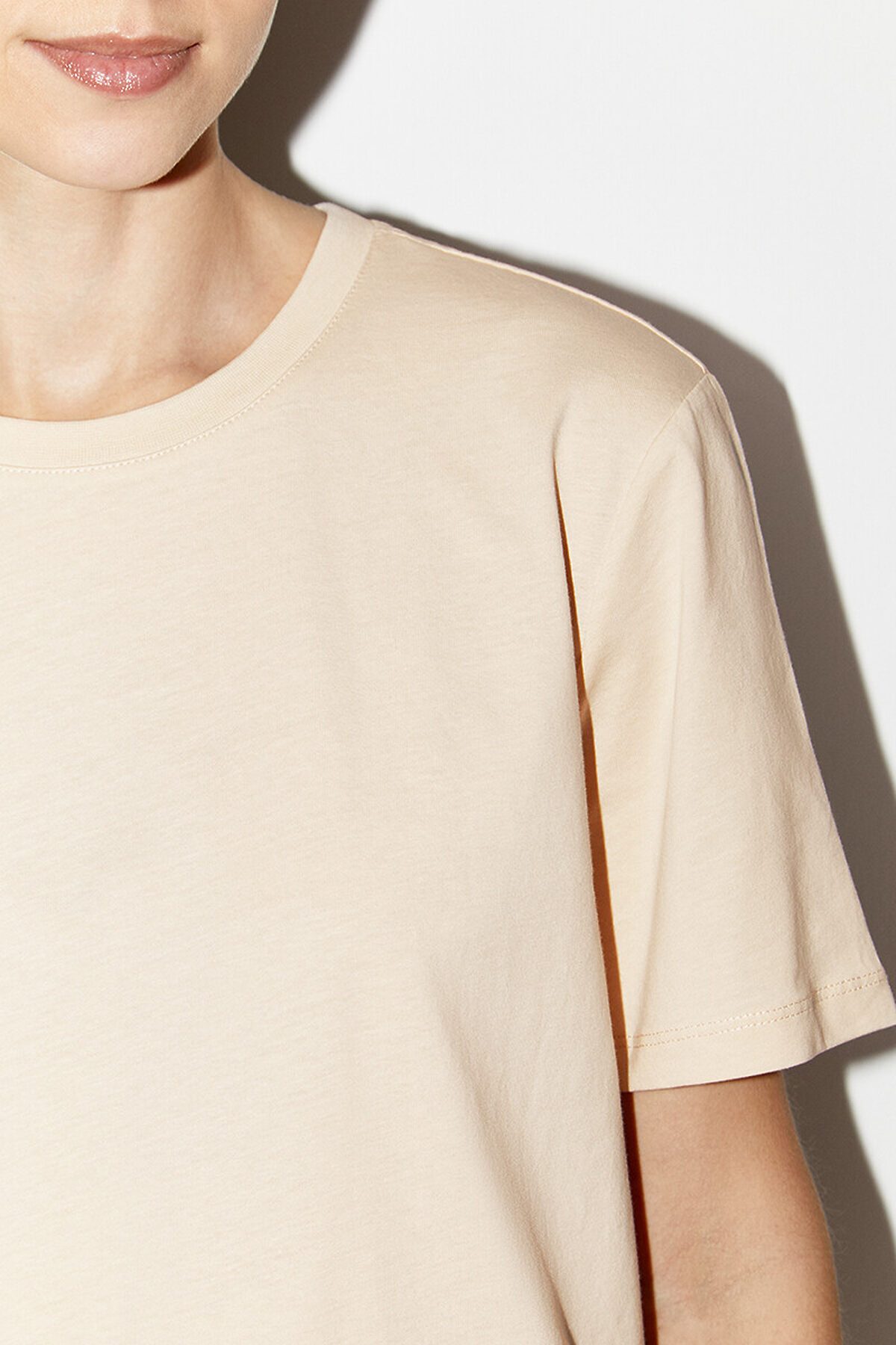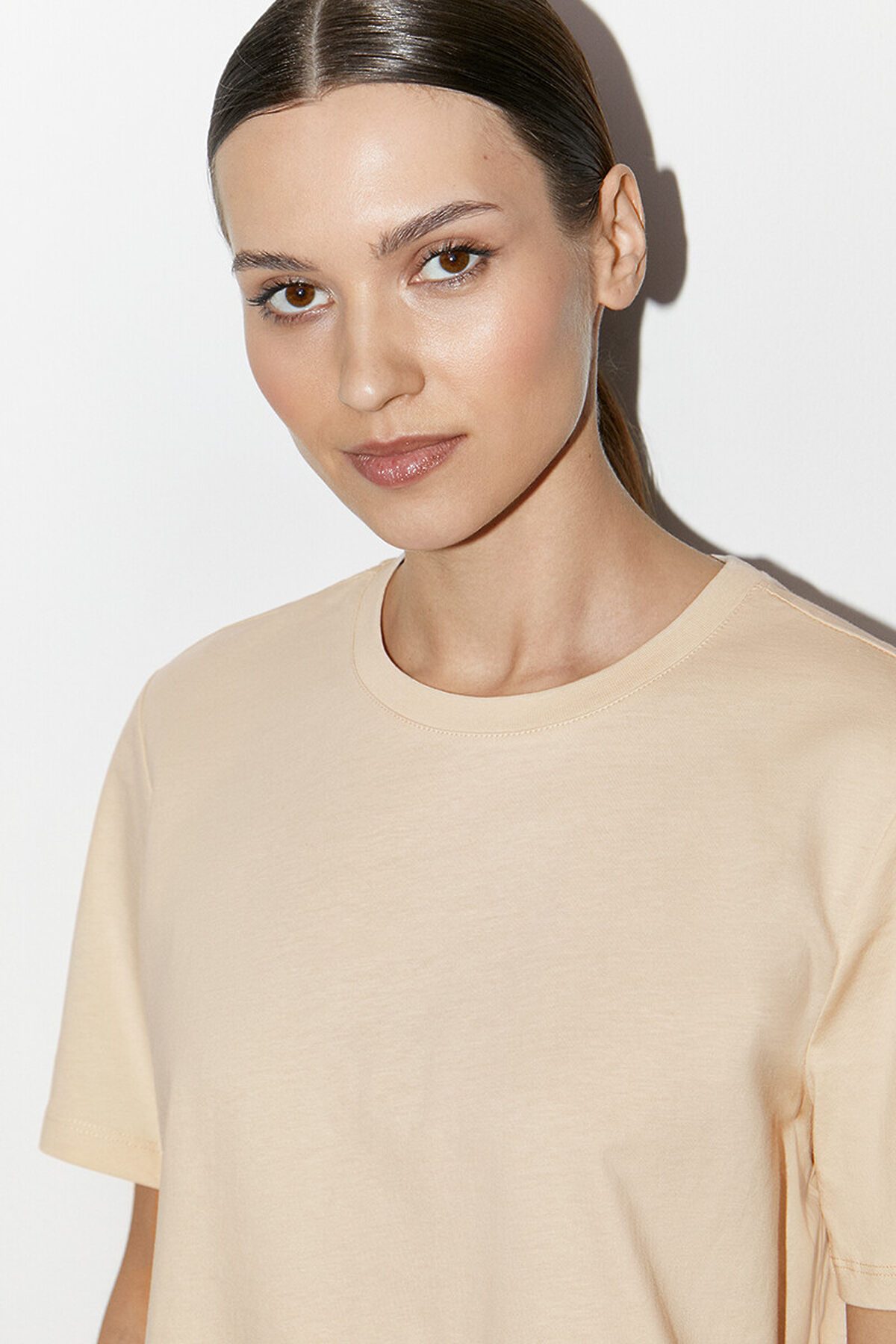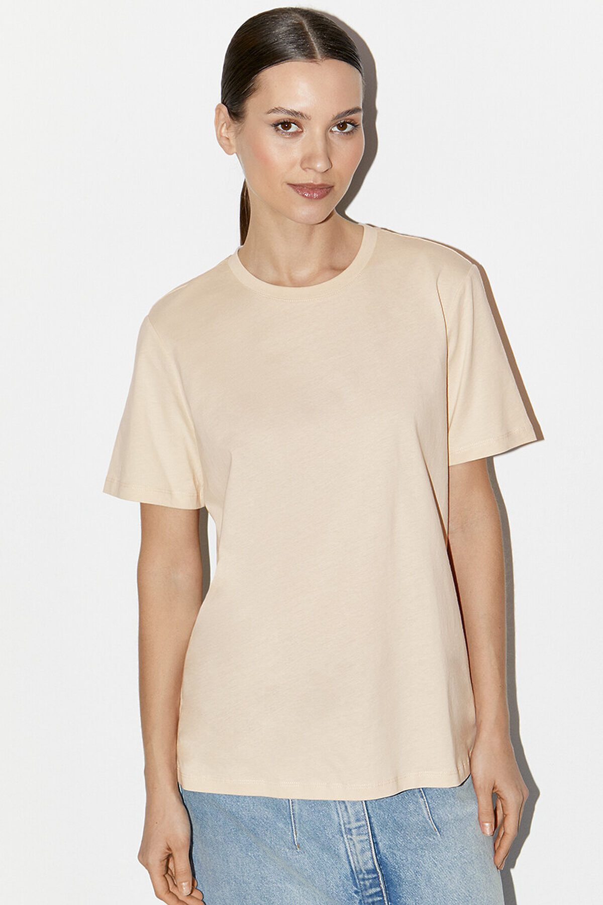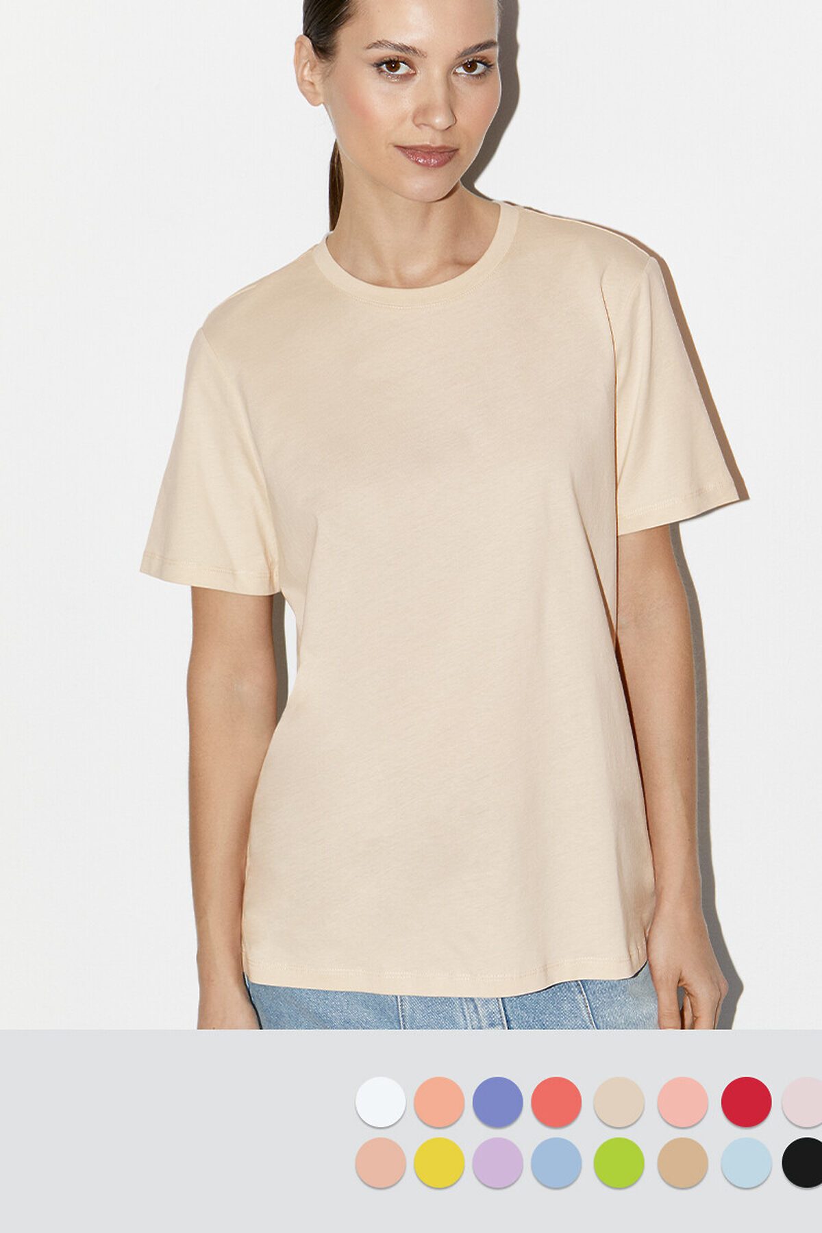 Женская футболка с круглым вырезом горловины с коротким рукавом. Изготовлена из высококачественного 100% хлопка, который обладает высокой воздухопроницаемостью, отлично впитывает влагу и подходит для чувствительной кожи. Комфортно ощущается благодаря свободному силуэту, и стильно смотрится благодаря лаконичному дизайну. Футболка универсально подойдет и в качестве повседневной базовой, и для занятий спортом.