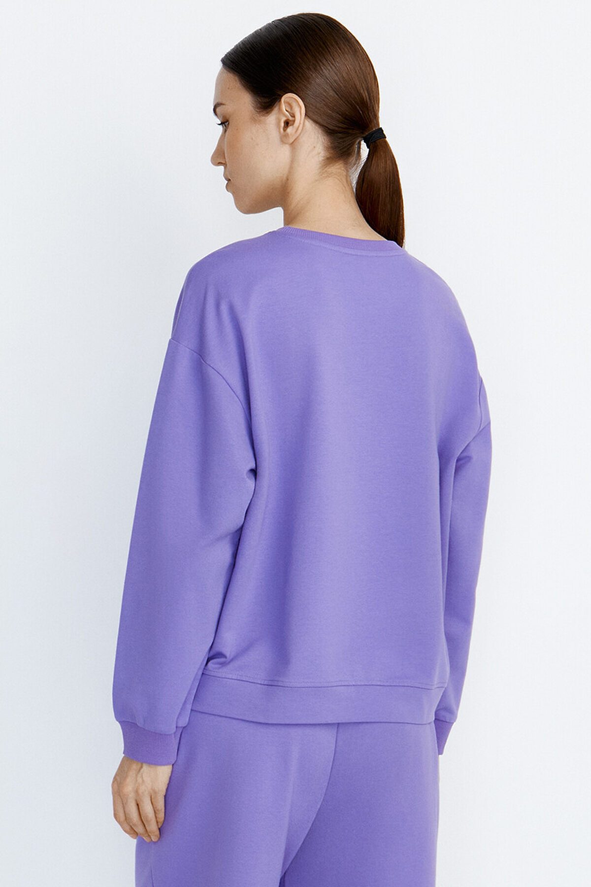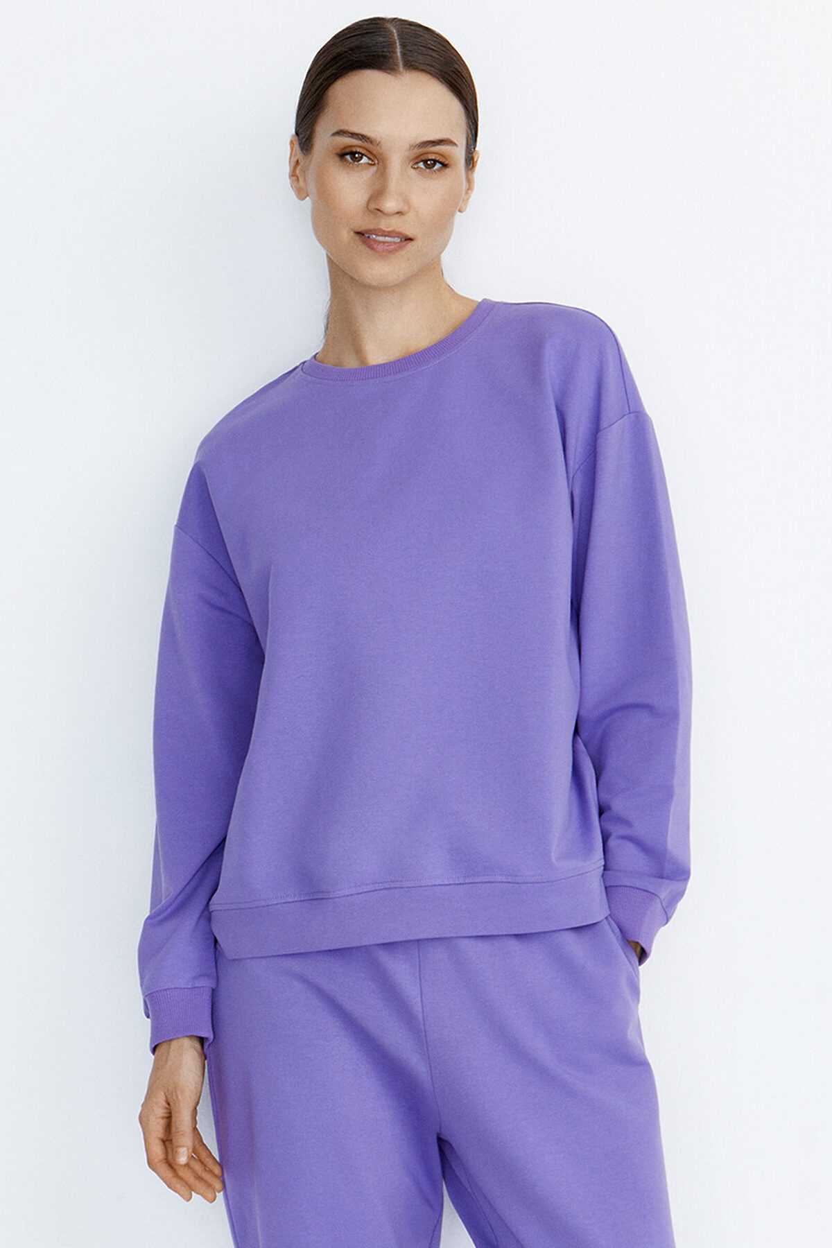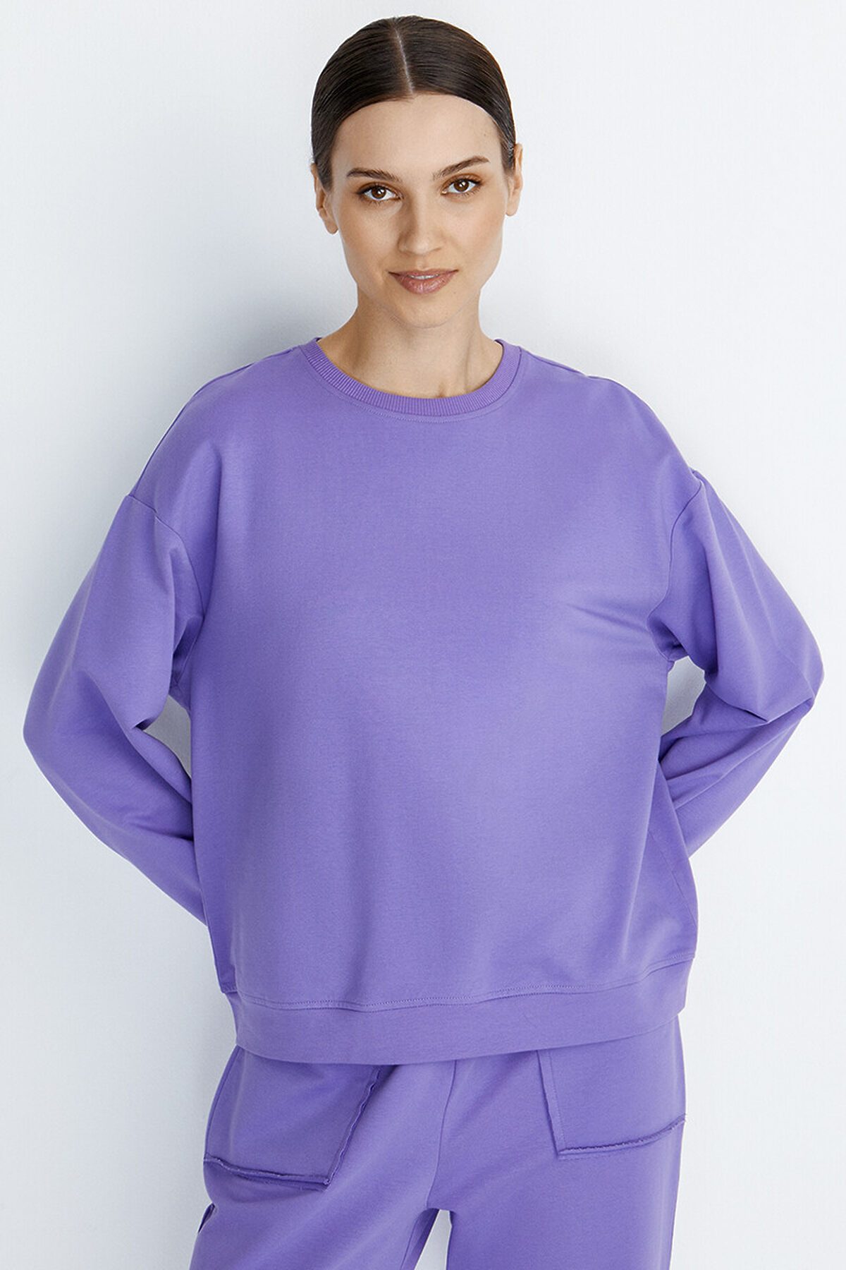 Женский свободный свитшот с длинным рукавом и круглым вырезом. Горловина обработана обтачкой из материала кашкорсе. Выполнен из высококачественного двухниточного футера. В составе трикотажного материала мягкий хлопок, который отлично пропускает воздух, приятно ощущается на теле и подходит для нежной и чувствительной кожи. Добавление эластана обеспечивает сохранение формы. Базовый повседневный свитшот можно носить в комплекте с брюками, шортами, джоггерами из коллекции или миксовать с другими вещами из гардероба.