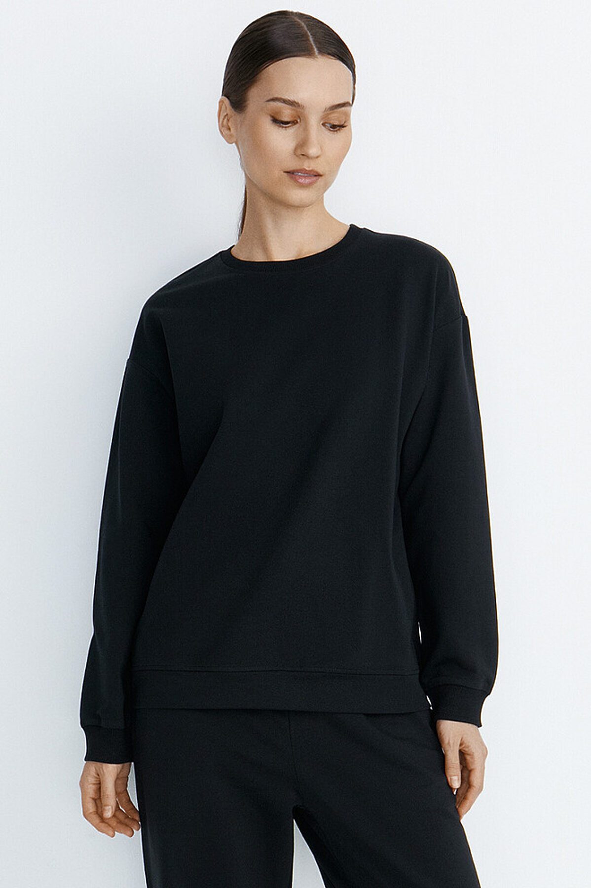 Женский свободный свитшот с длинным рукавом и круглым вырезом. Горловина обработана обтачкой из материала кашкорсе. Выполнен из высококачественного двухниточного футера. В составе трикотажного материала мягкий хлопок, который отлично пропускает воздух, приятно ощущается на теле и подходит для нежной и чувствительной кожи. Добавление эластана обеспечивает сохранение формы. Базовый повседневный свитшот можно носить в комплекте с брюками, шортами, джоггерами из коллекции или миксовать с другими вещами из гардероба.