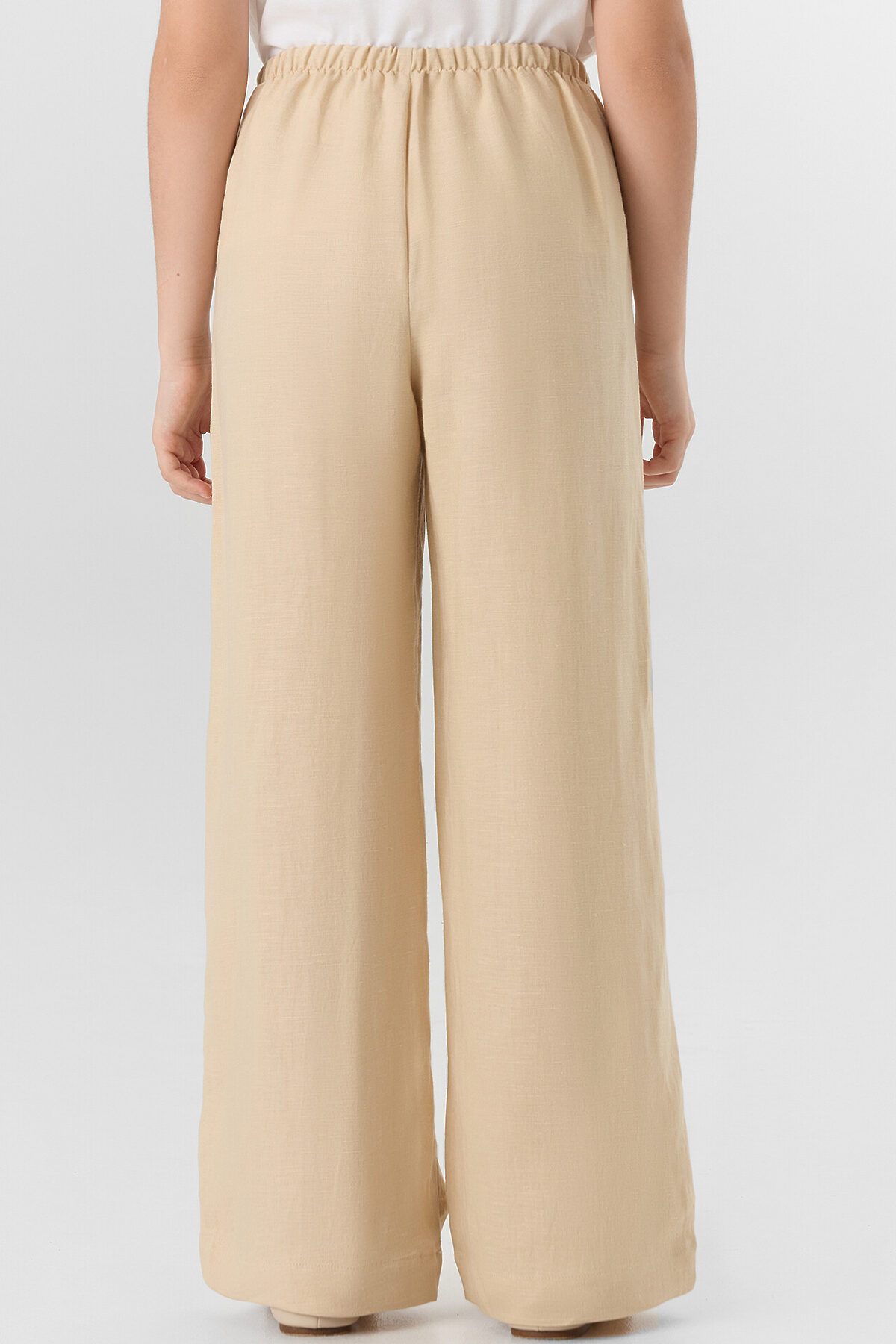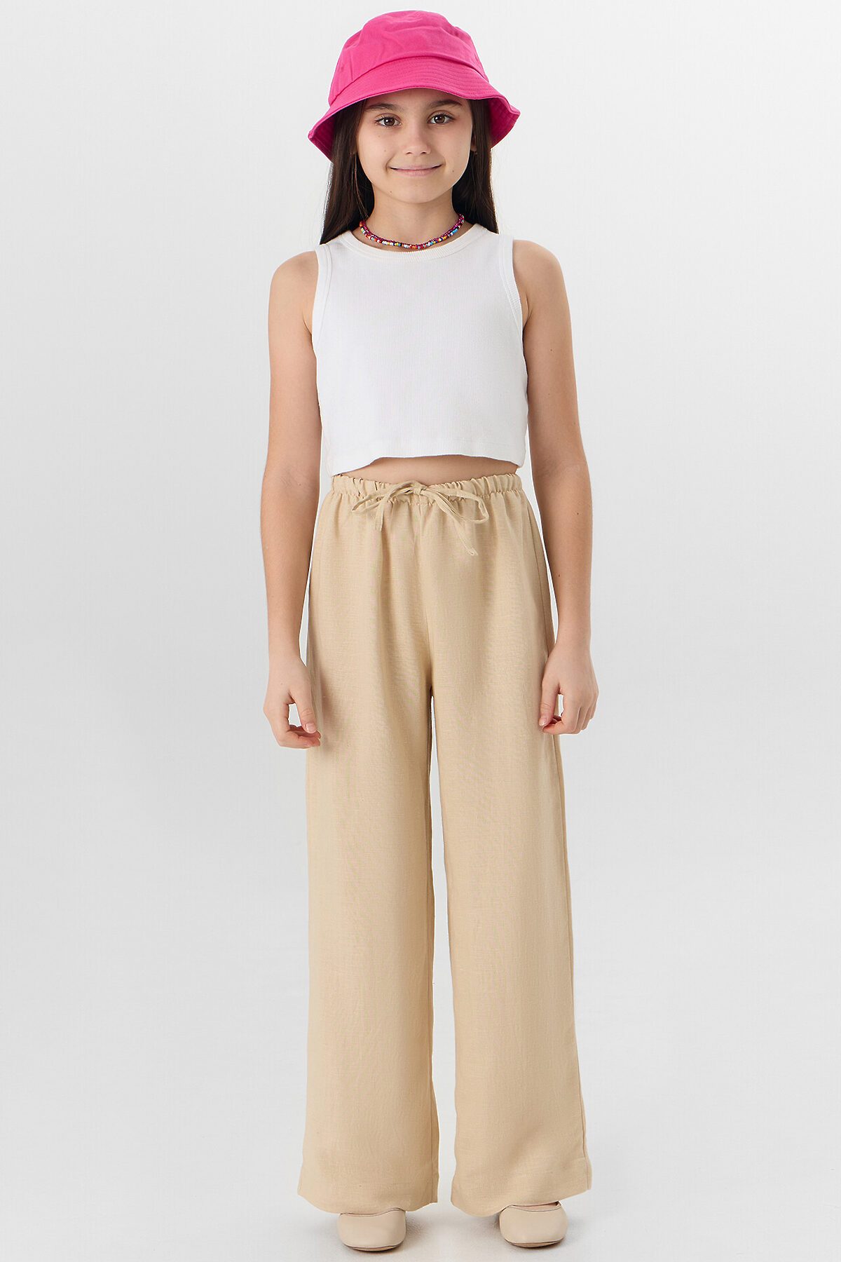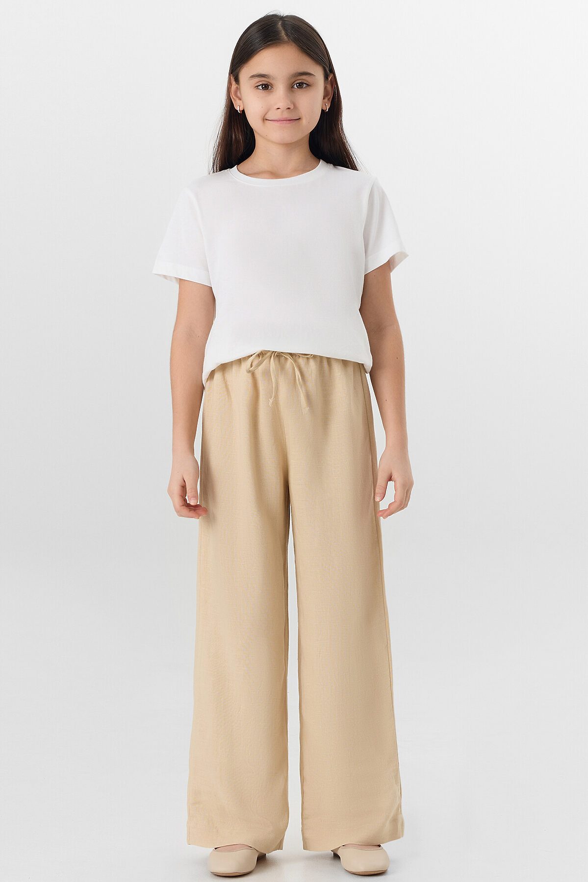 Эти брюки для девочек прямого силуэта — практичный и стильный элемент гардероба! Средняя посадка и пояс с эластичной тесьмой внутри обеспечивают удобную и надежную посадку. Шнур из основного материала, втянутый через пробитые петли на поясе, позволяет отрегулировать объем, добавляя функциональности. Низ брюк обработан швом вподгибку, что делает модель аккуратной и долговечной. Изделие выполнено из сочетания льна и вискозы — материалов, которые отлично дополняют друг друга. Лен обеспечивает воздухопроницаемость и легкость, а вискоза добавляет мягкость и комфорт, что делает брюки особенно приятными во время носки. Такие брюки идеально подойдут для повседневных образов, прогулок или школьных дней, сочетая стиль и удобство!