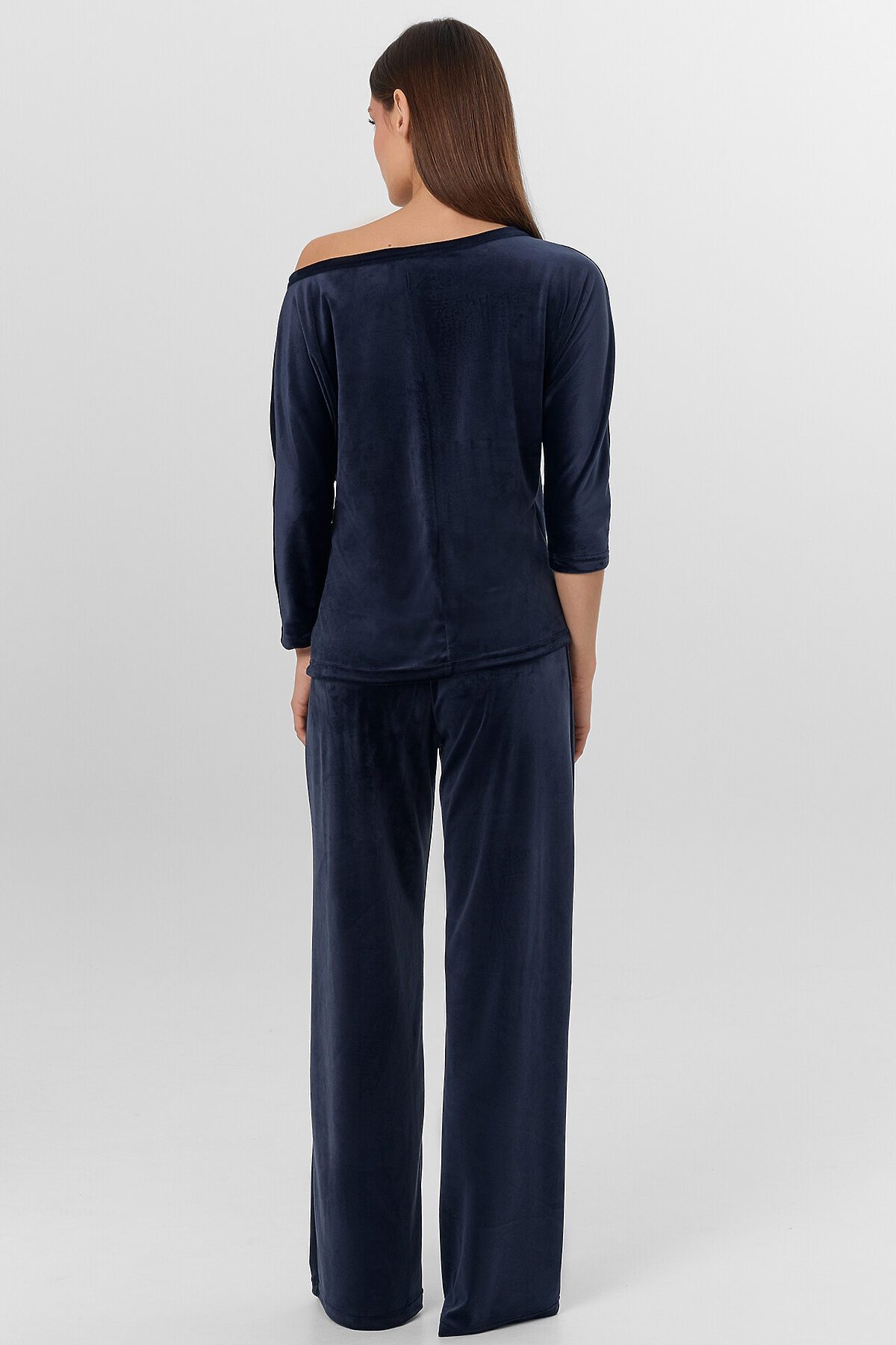 Комплект состоит из джемпера и брюк. Джемпер прямого силуэта. Спинка со средним швом. Горловина формы лодочка, обработана бейкой из основного полотна. Рукава цельнокроеные, длиной 3/4. Нижний срез джемпера и рукавов обработан швом вподгибку. Брюки прямые, свободные. Посадка средняя. Пояс цельнокроеный с эластичной тесьмой внутри. Нижний срез брюк обработан швом вподгибку