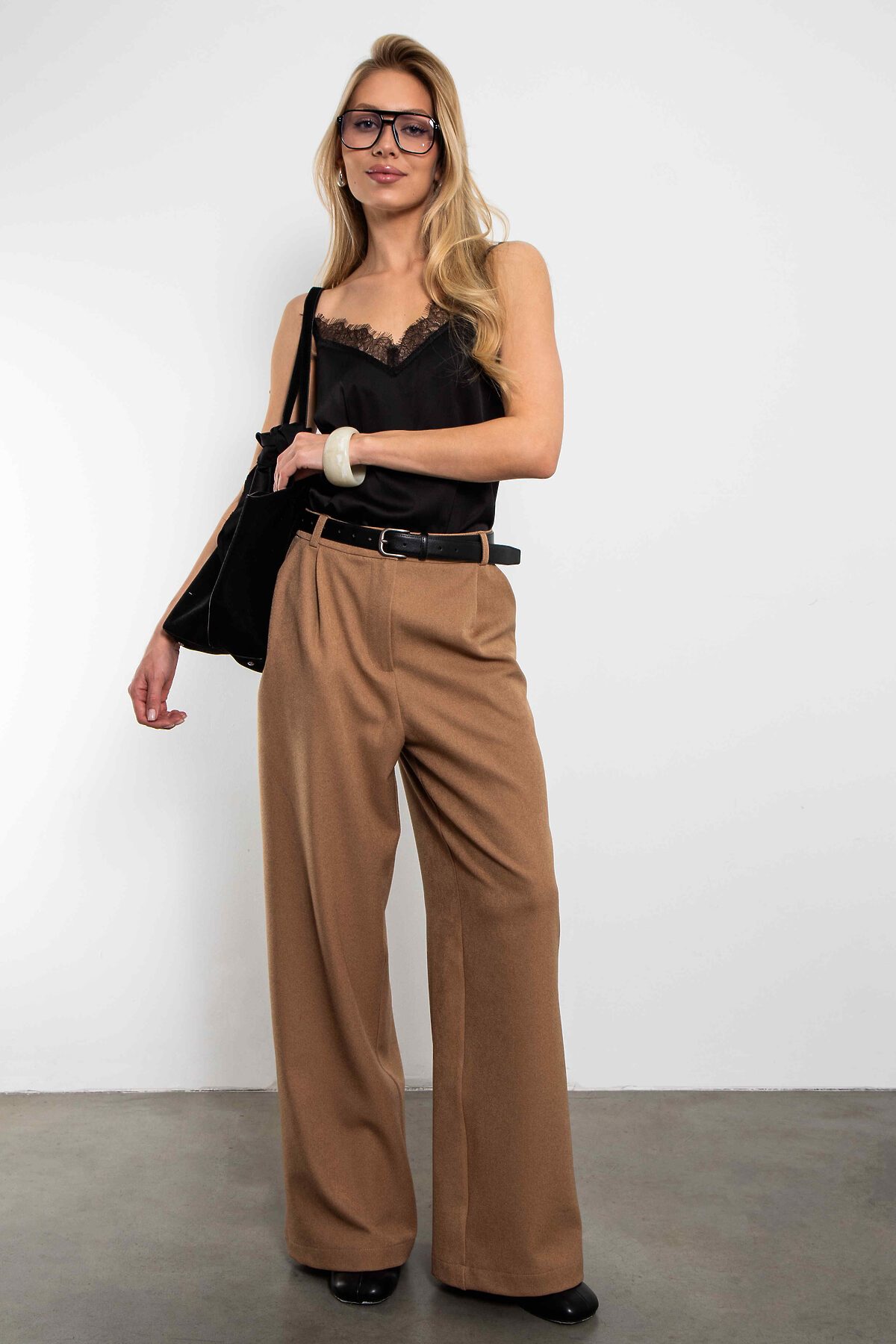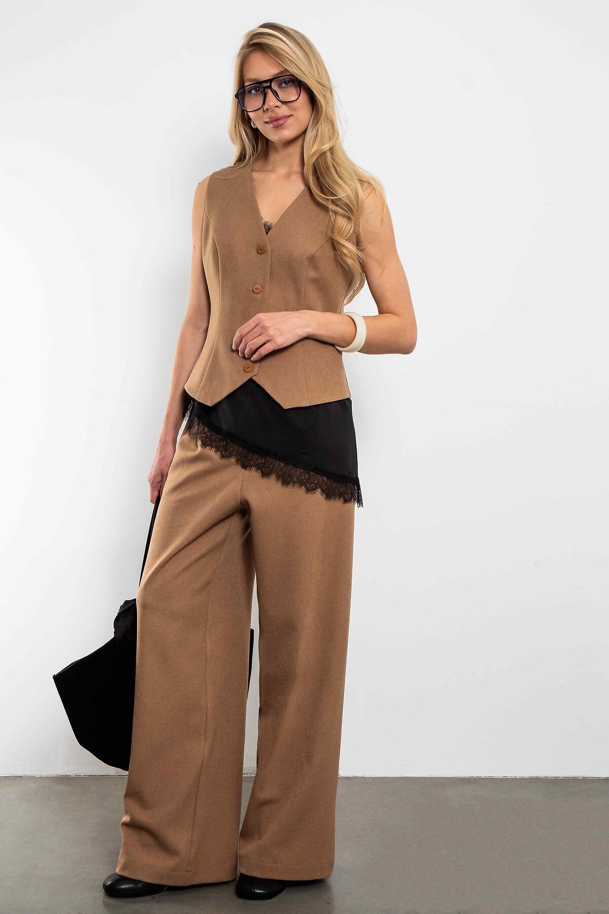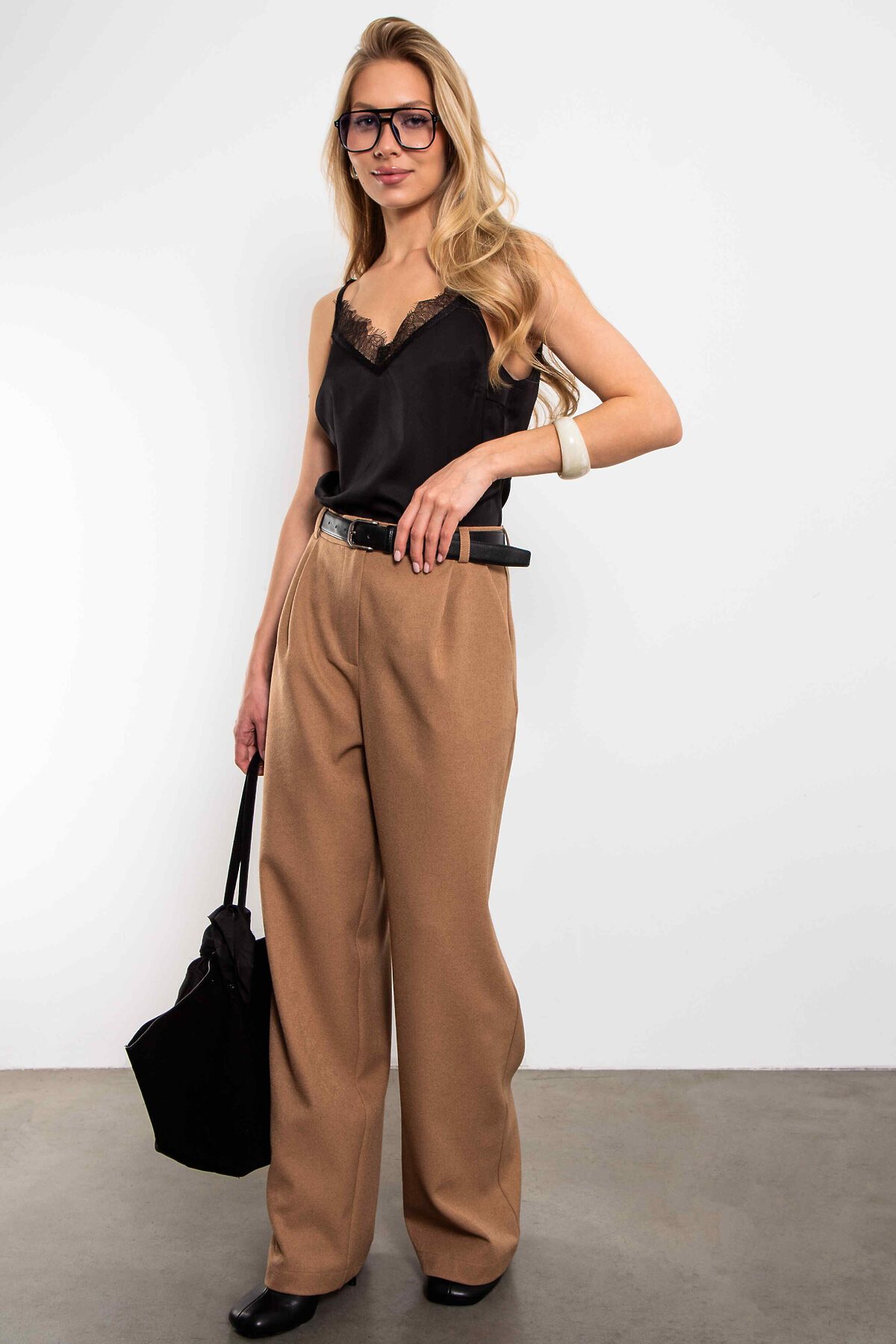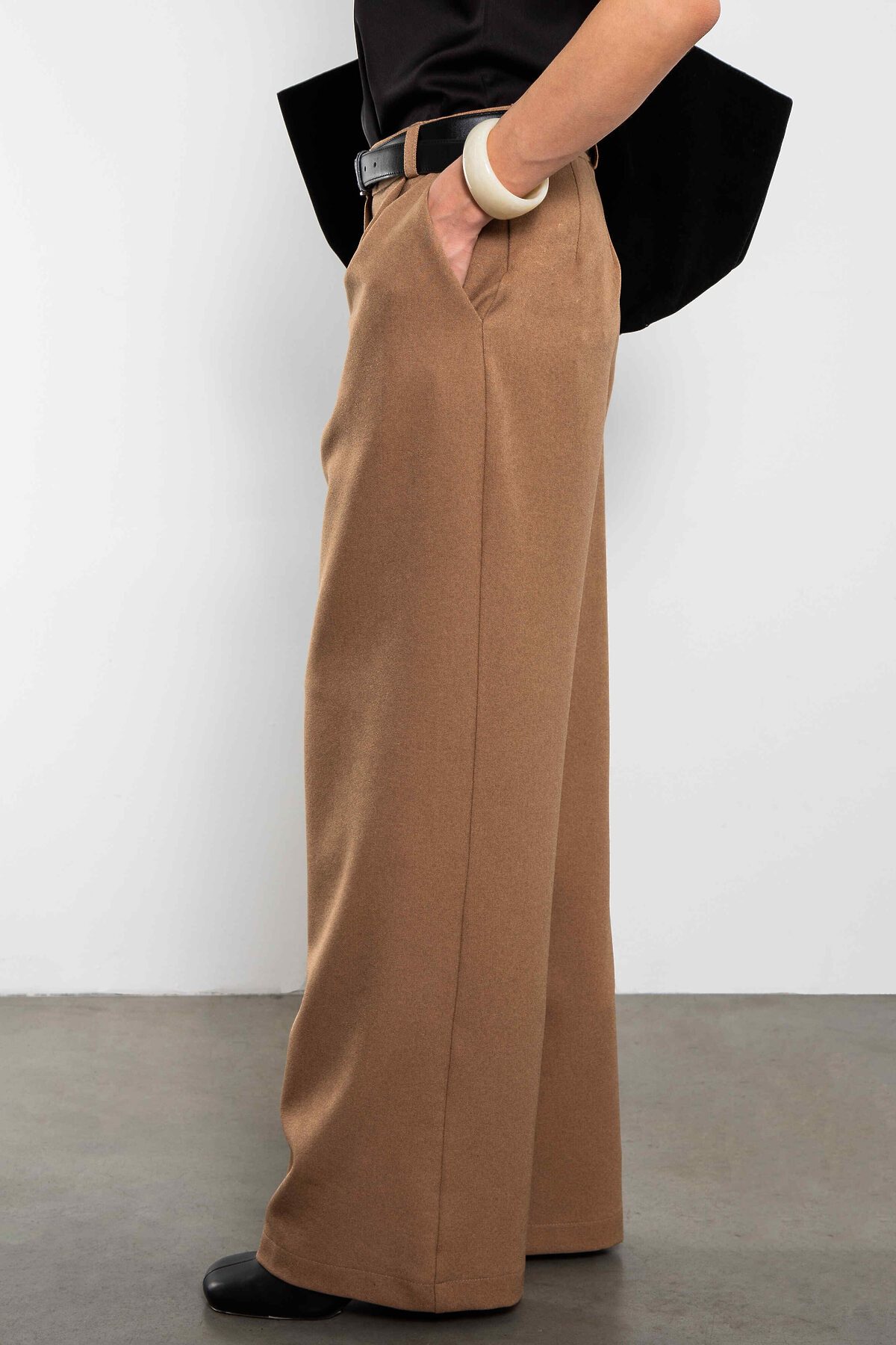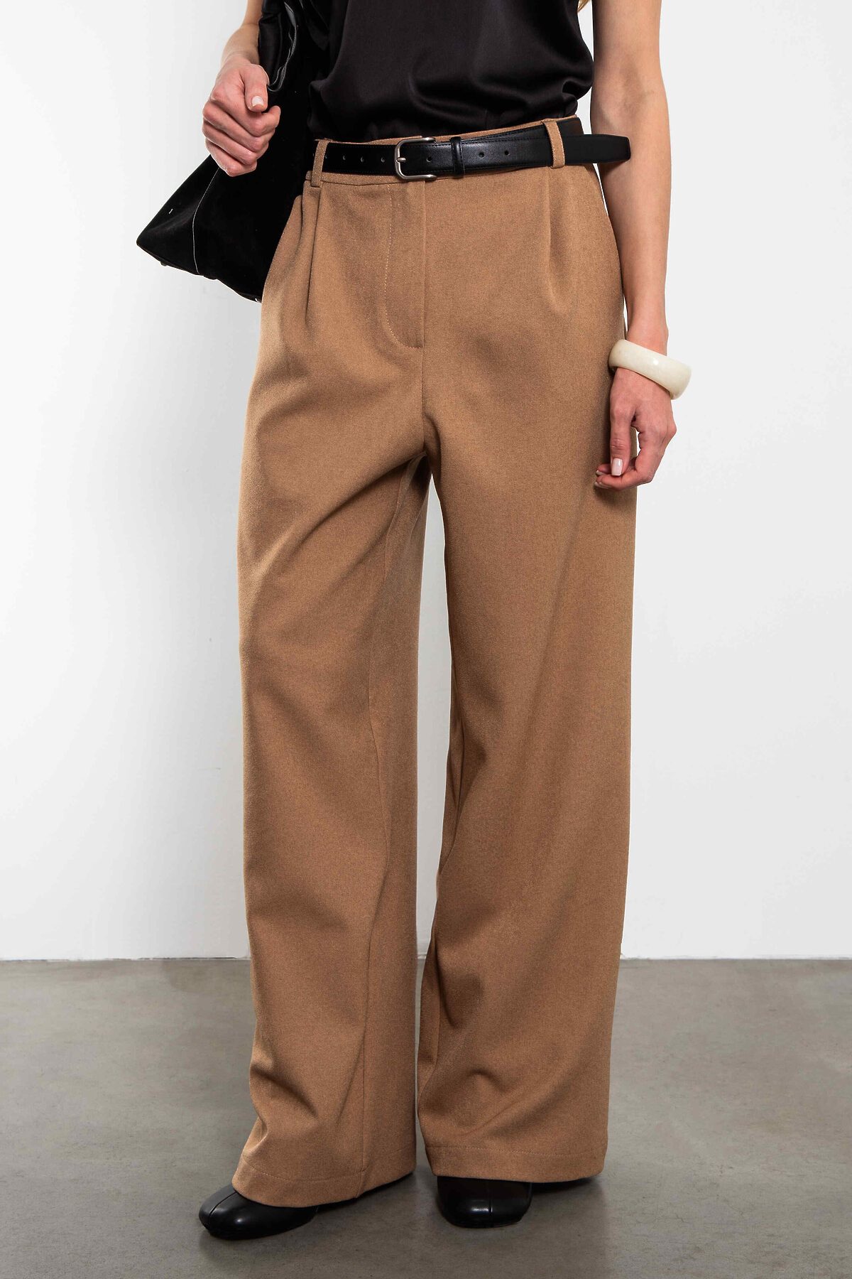 Брюки палаццо Basic — новый цвет Ваш любимый силуэт палаццо Basic теперь в новом, тёплом оттенке песочный— универсальном и очень «дорогом» по настроению. Он красиво сочетается с чёрным, молочным, белым, шоколадным и денимом и легко вписывается в базовый гардероб. Свободная высокая посадка и широкие штанины вытягивают силуэт, а мягкое раскрытие от бедра делает образ расслабленным, но собранным. Идеальны для офиса, города и путешествий — достаточно сменить верх и обувь. Детали модели: высокая посадка широкие брючины палаццо комфортная посадка по талии базовая длина в пол (красиво смотрится и с каблуком, и с обувью на плоском ходу) лаконичный дизайн, который легко стилизовать С чем носить: с топом или блузой для женственного образа, с рубашкой и жакетом — для делового, с футболкой и кедами — на каждый день. бережная стирка при температуре 30°С не отбеливать сушка в барабане запрещена химчистка разрешена в щадящем режиме утюжить при максимальной температуре утюга до 110°