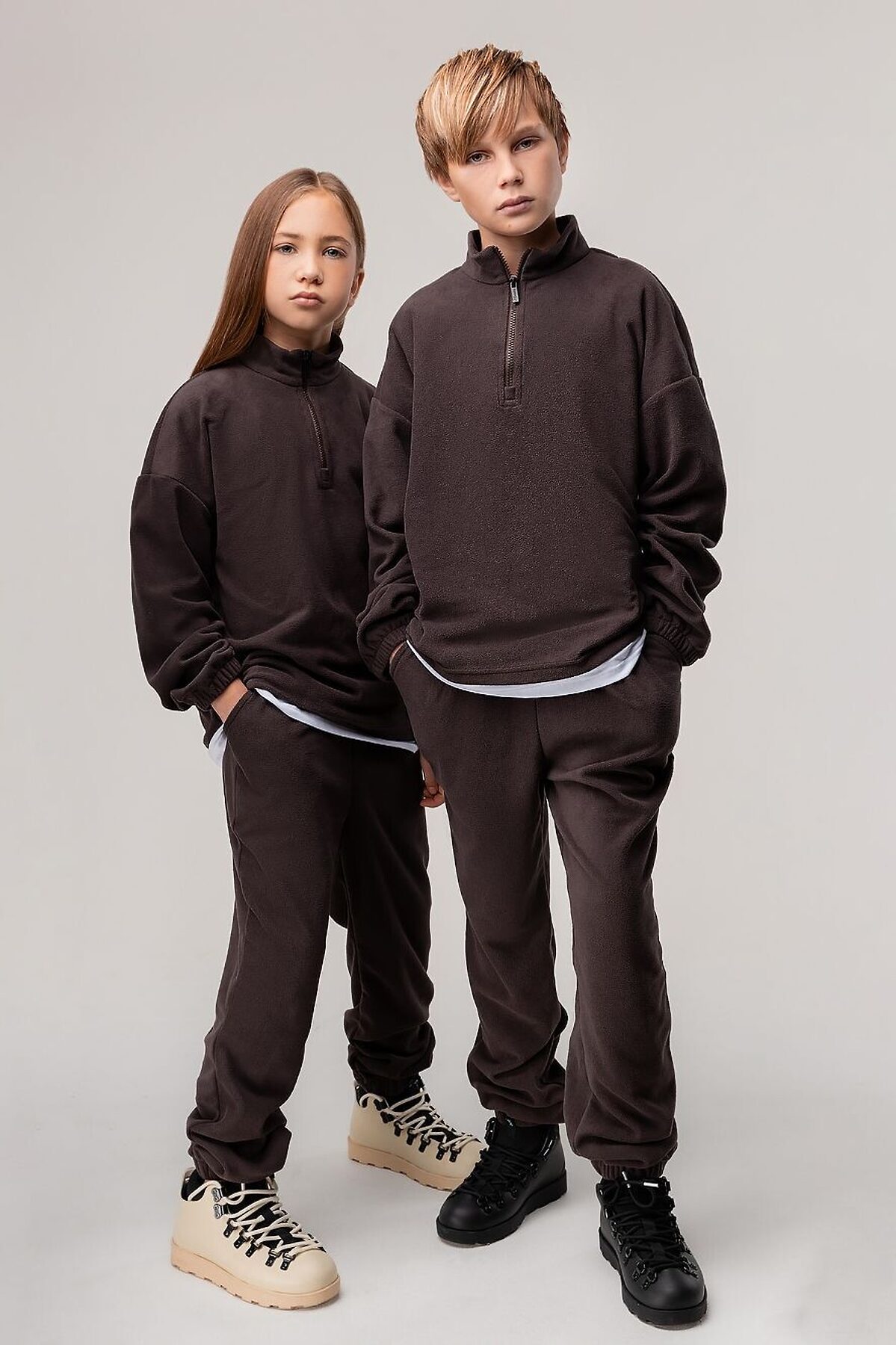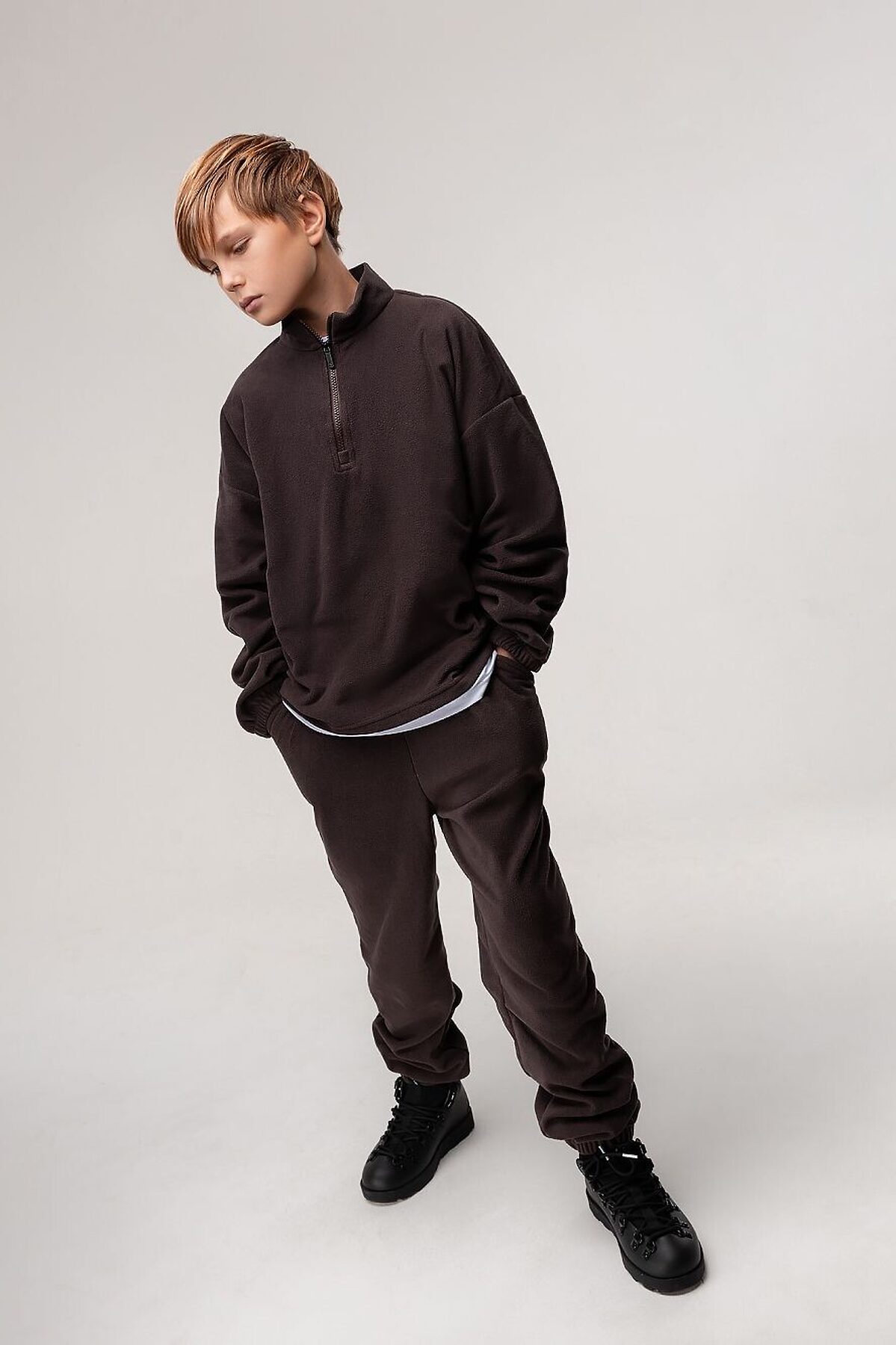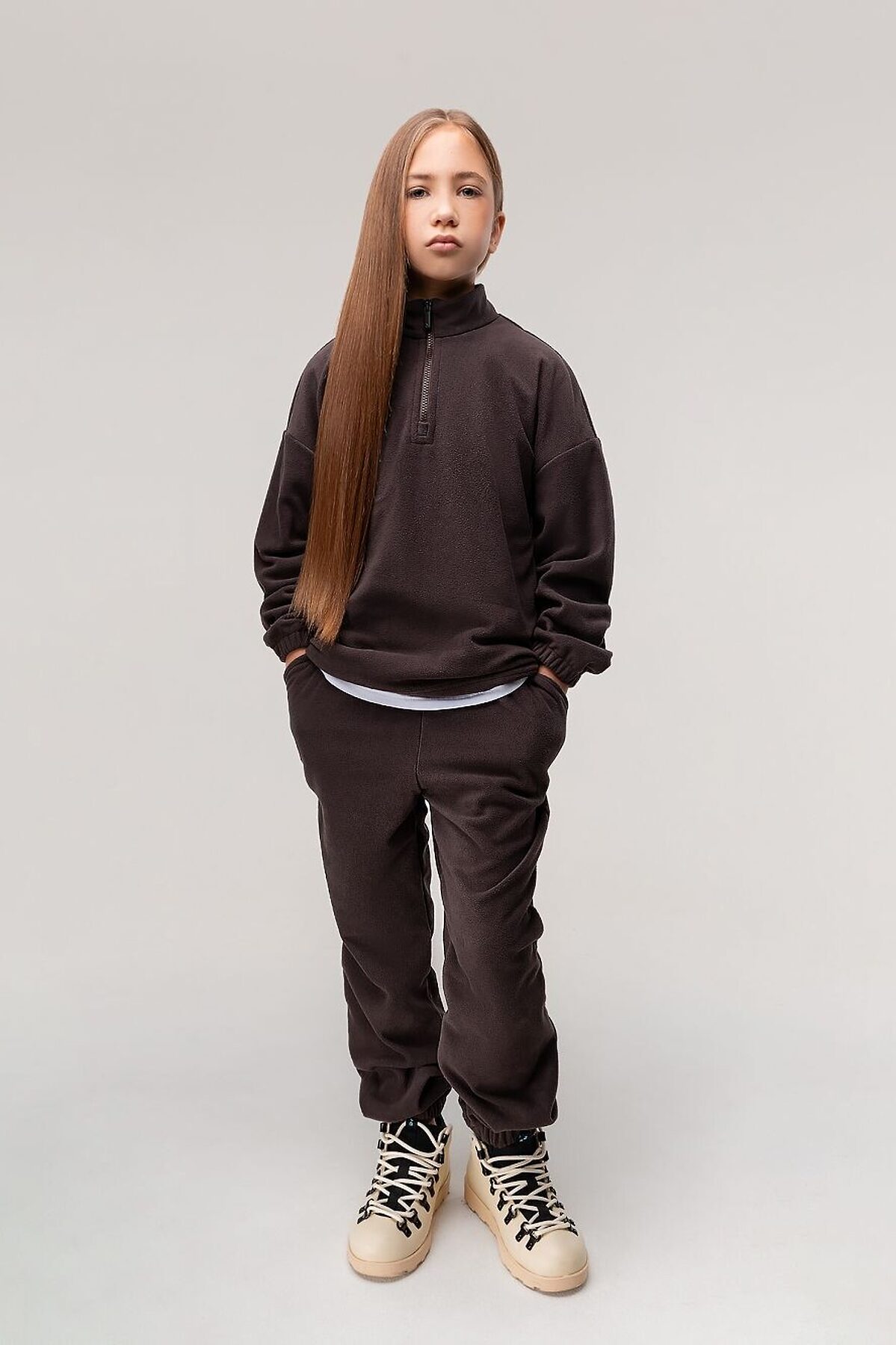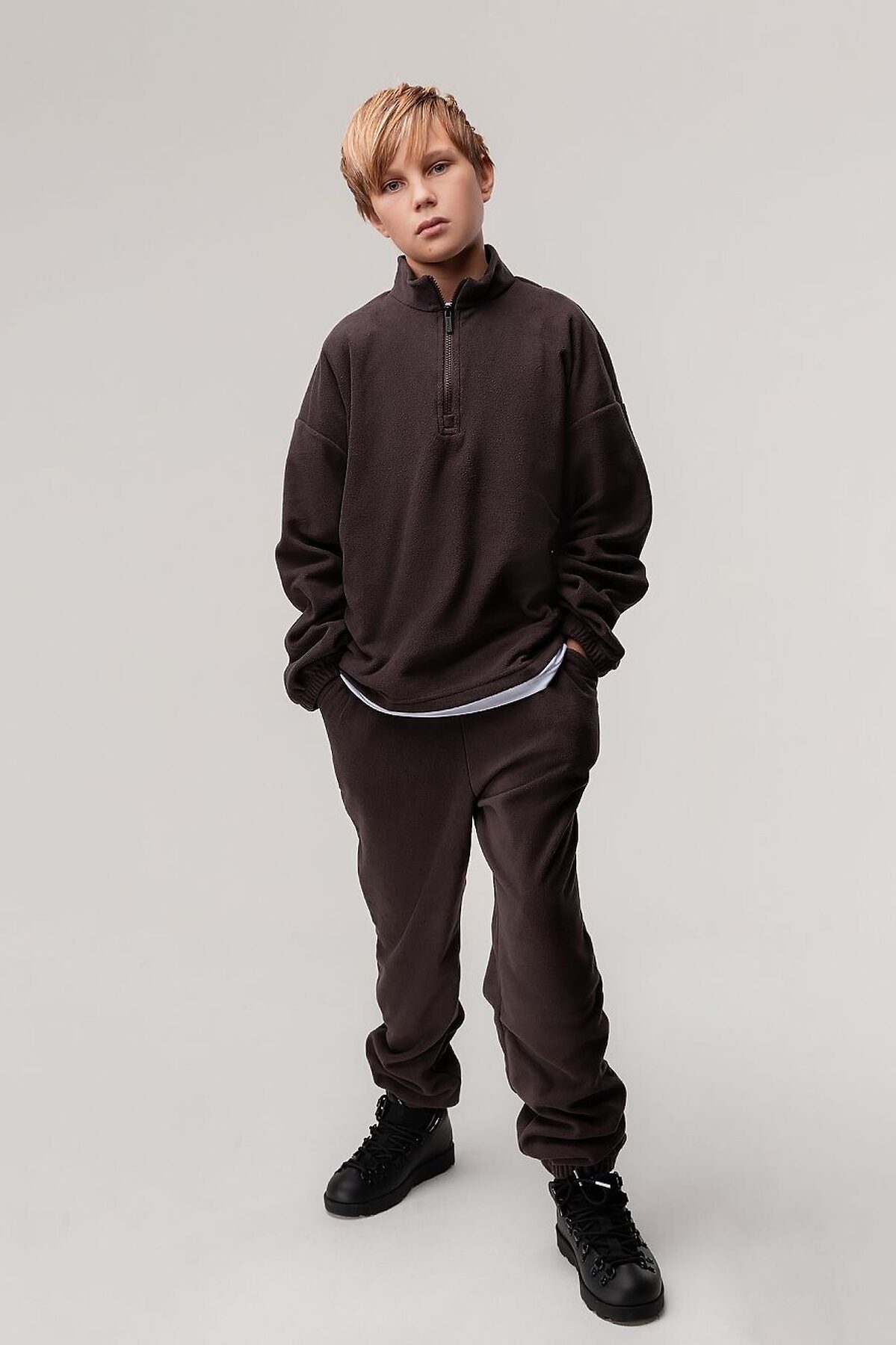 Костюм для детей школьного возраста. Толстовка без подкладки, прямого силуэта со спущенным плечом, втачными рукавами с цельнокроеной манжетой с резинкой внутри. Воротник стойка, застёгивается на короткую молнию по центру полочки. Низ изделия ровный.Брюки прямые свободные на притачном поясе с внутренней резинкой. Низ брюк с цельнокроеной манжетой на резинке. Брюки с боковыми карманами. Костюм выполнен из качественного флиса плотностью 190гр.
