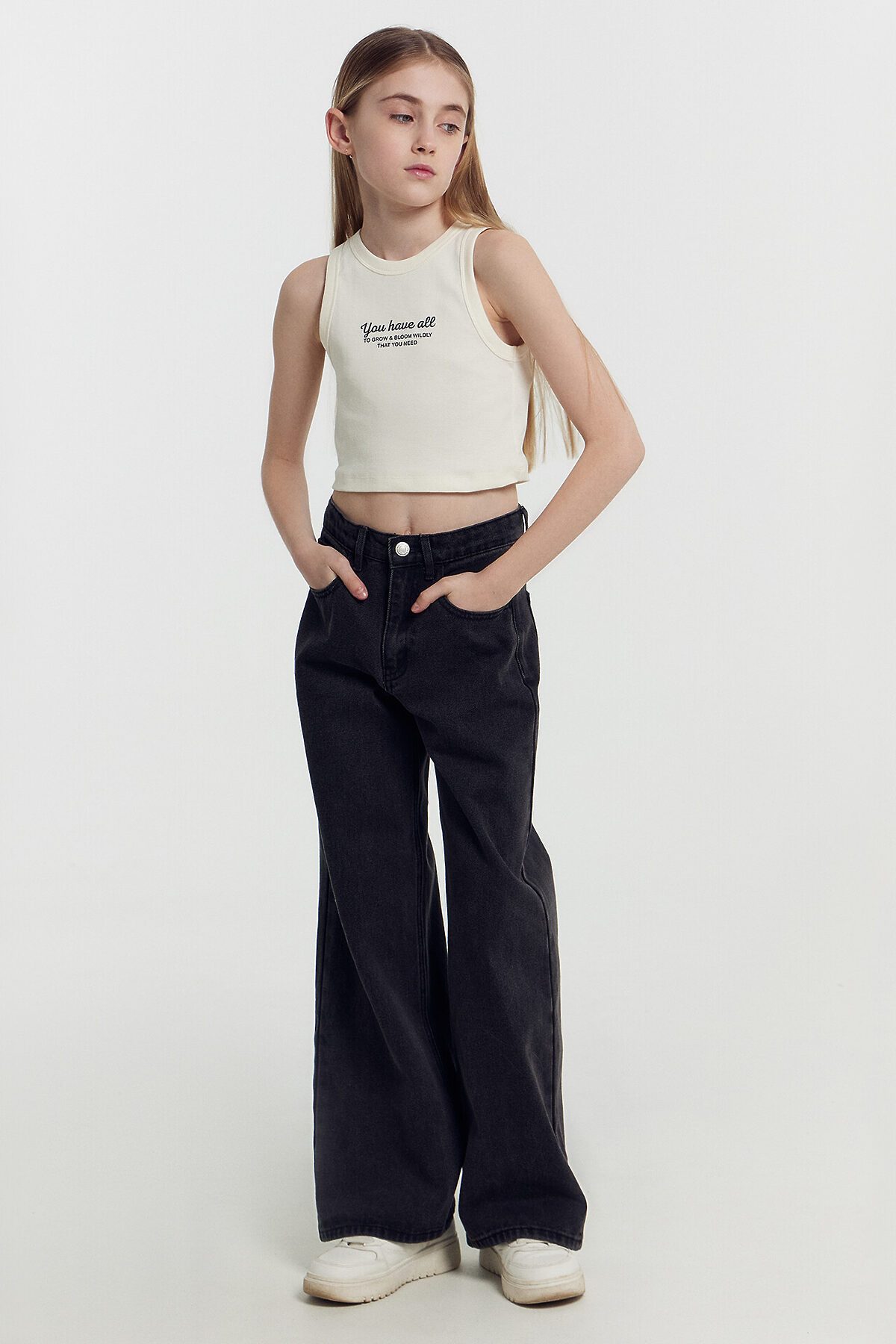 Топ для девочек прилегающего силуэта. Горловина круглая. Проймы и горловина окантованы бейкой из основного полотна. Низ изделия обработан швом в подгибку.
