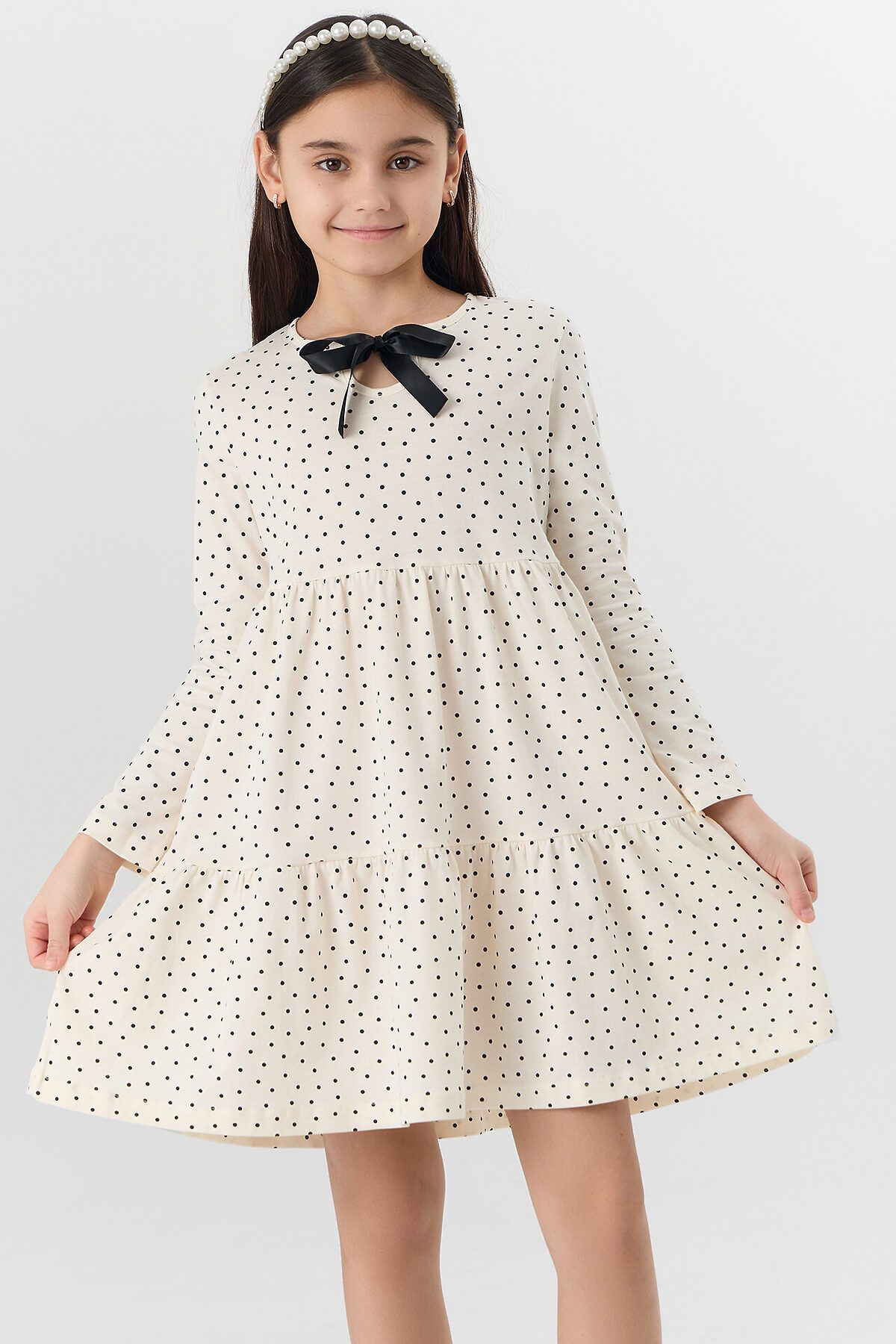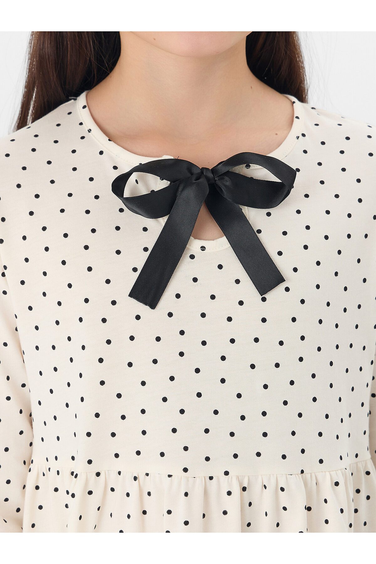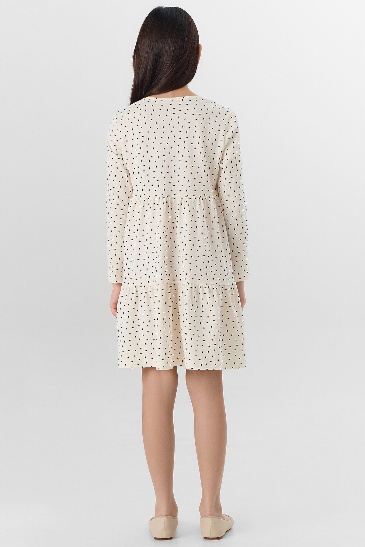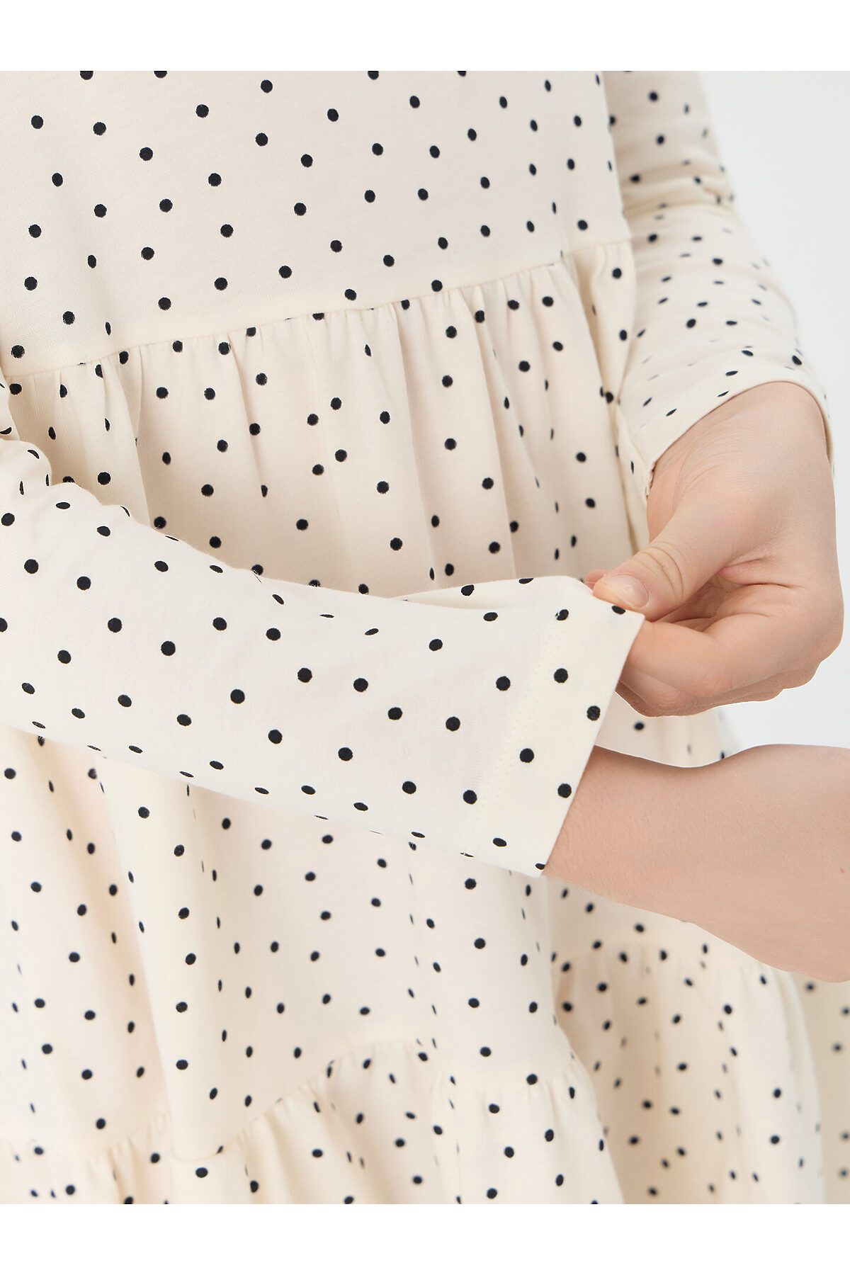 Платье полуприлегающего силуэта. Горловина круглой формы, обтачка из основного полотна. В центре горловины декоративный вырез с приточной лентой 2 см. Рукава втачные длинные. Платье с двумя отрезными воланами по переду и спинке. Низ изделия и рукавов обработаны швом в подгибку на 2-х игольной плоскошовной машине.