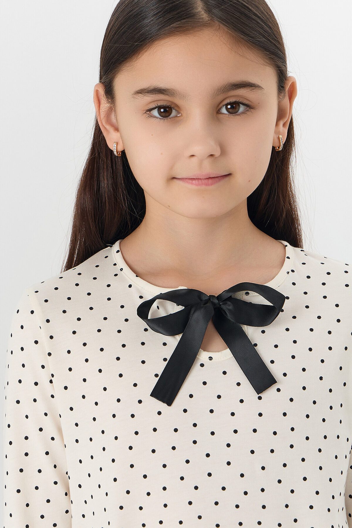 Платье полуприлегающего силуэта. Горловина круглой формы, обтачка из основного полотна. В центре горловины декоративный вырез с приточной лентой 2 см. Рукава втачные длинные. Платье с двумя отрезными воланами по переду и спинке. Низ изделия и рукавов обработаны швом в подгибку на 2-х игольной плоскошовной машине.