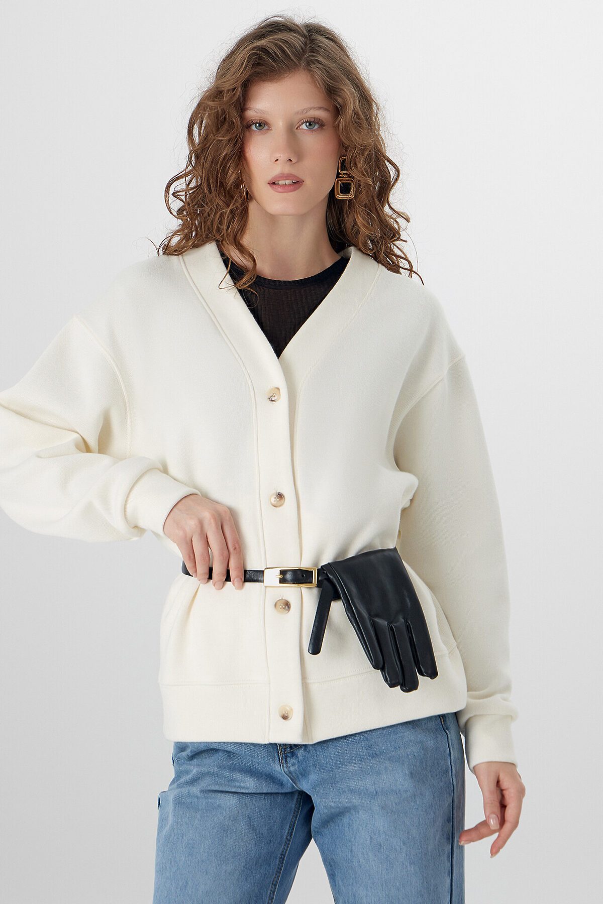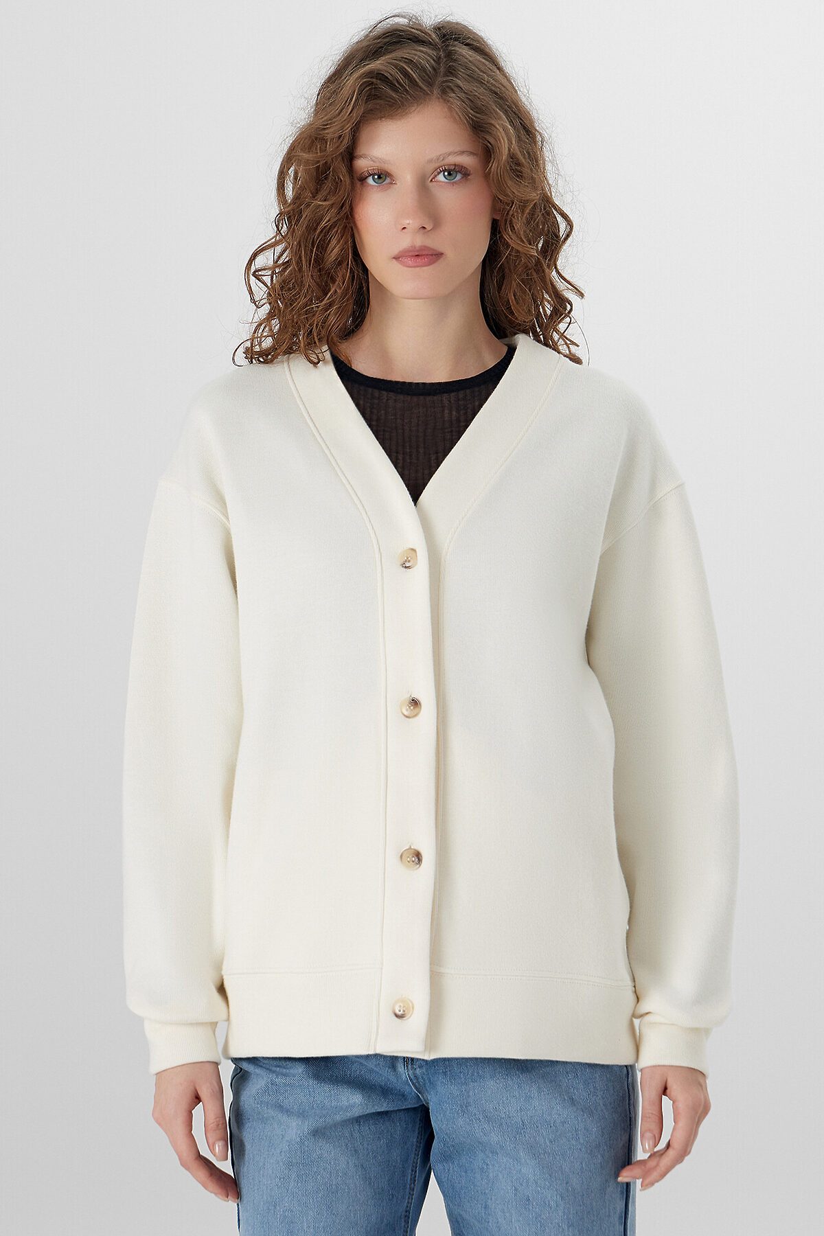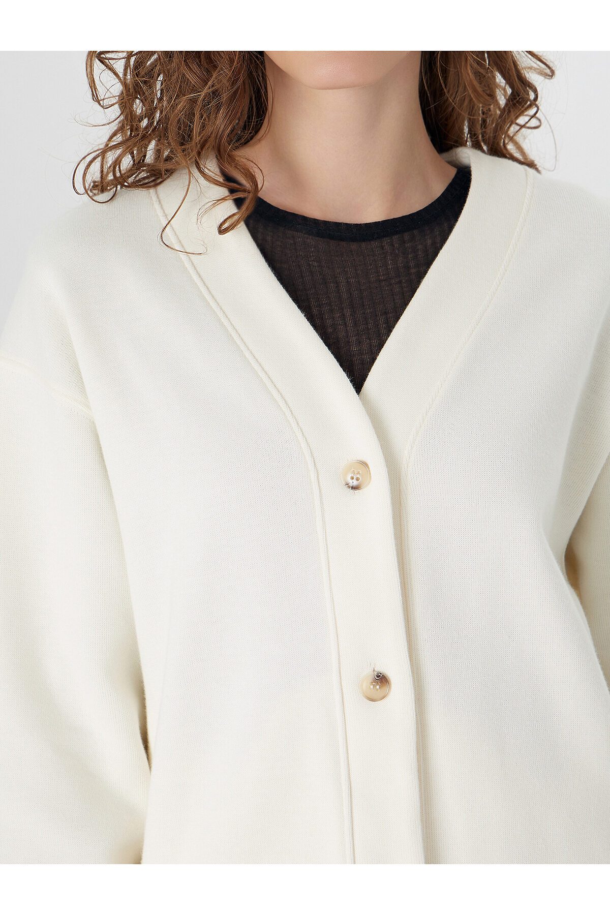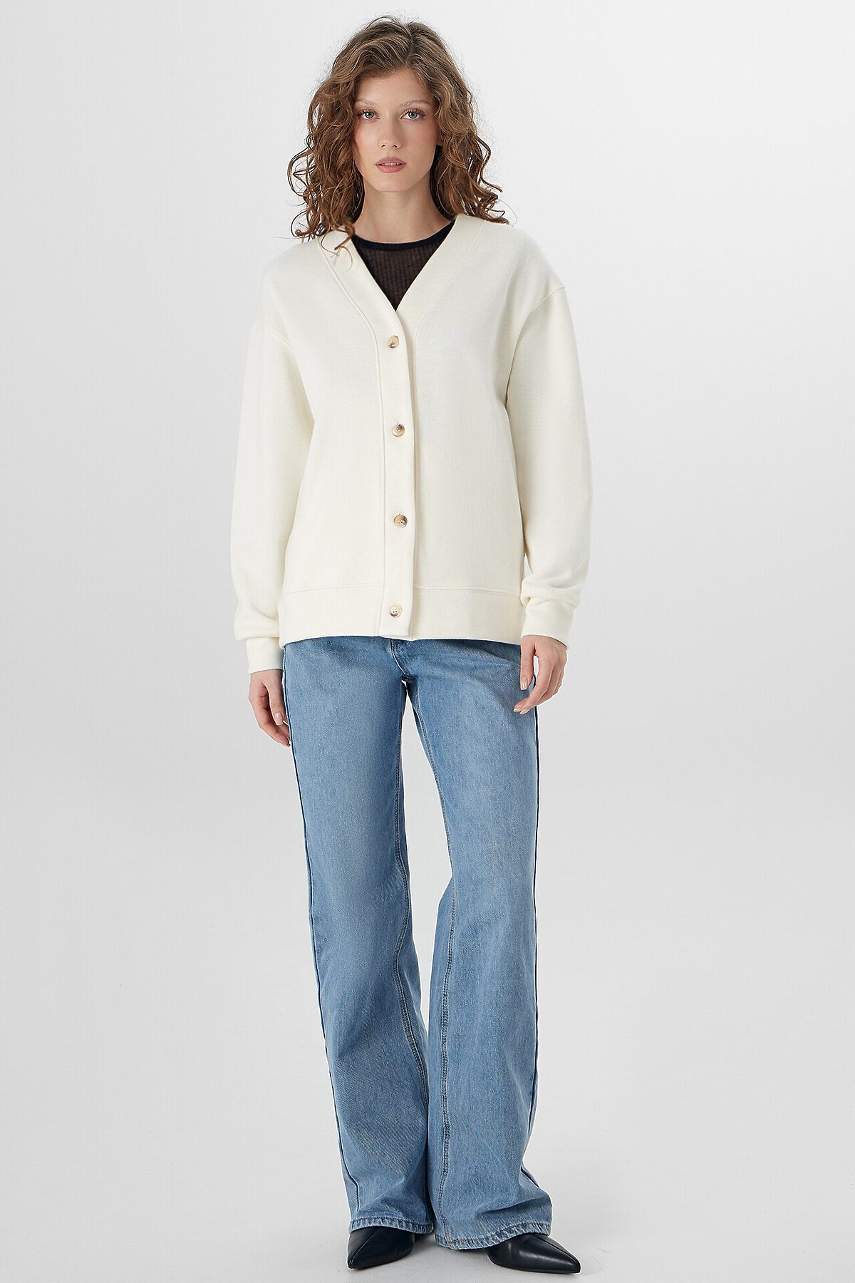 Женский кардиган — это нежный акцент для прохладных дней. Он выполнен из мягкого селаника — трикотажа с лёгким ворсом, который сохраняет тепло и приятно облегает тело. Свободный прямой силуэт со спущенным плечом и V-образной горловиной создаёт элегантный и расслабленный вид.