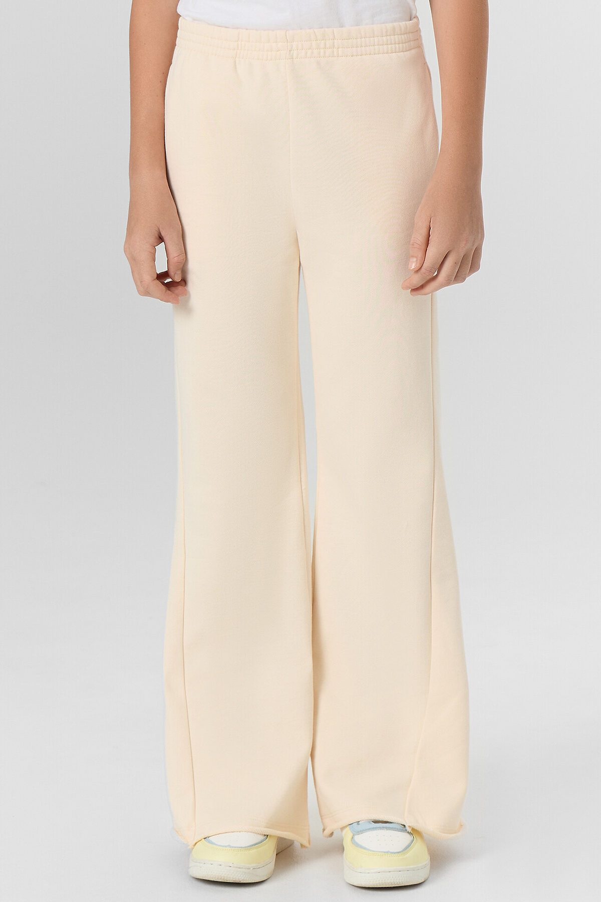 Брюки свободного силуэта с высокой посадкой. Пояс цельнокроенный с эластичной тесьмой внутри 30RV. По поясу сделаны 2 отделочные строчки. Боковые швы перенесены вперед. Карманы в боковых швах. Низ с открытым срезом. По низу сделана отделочная строчка.