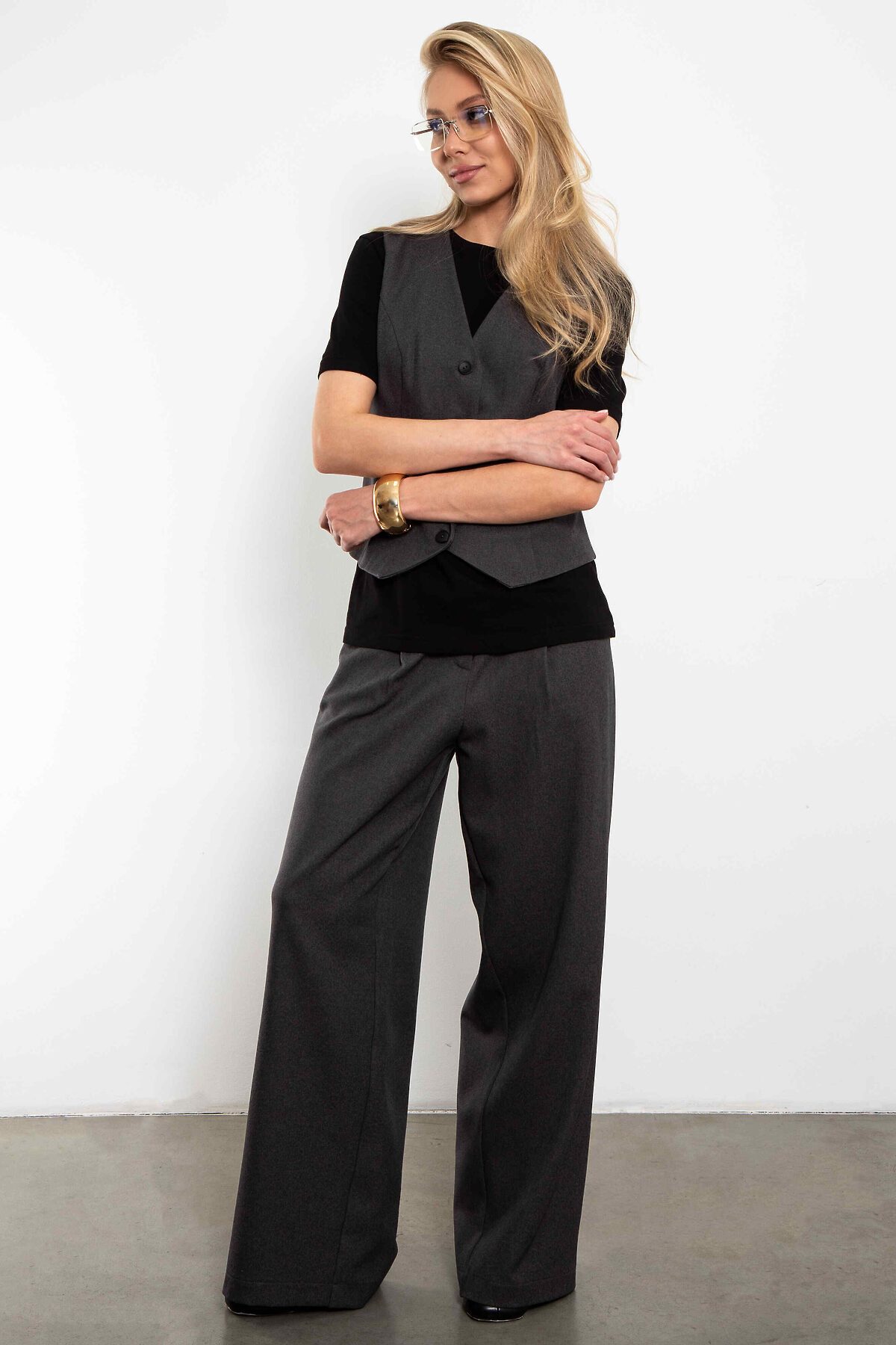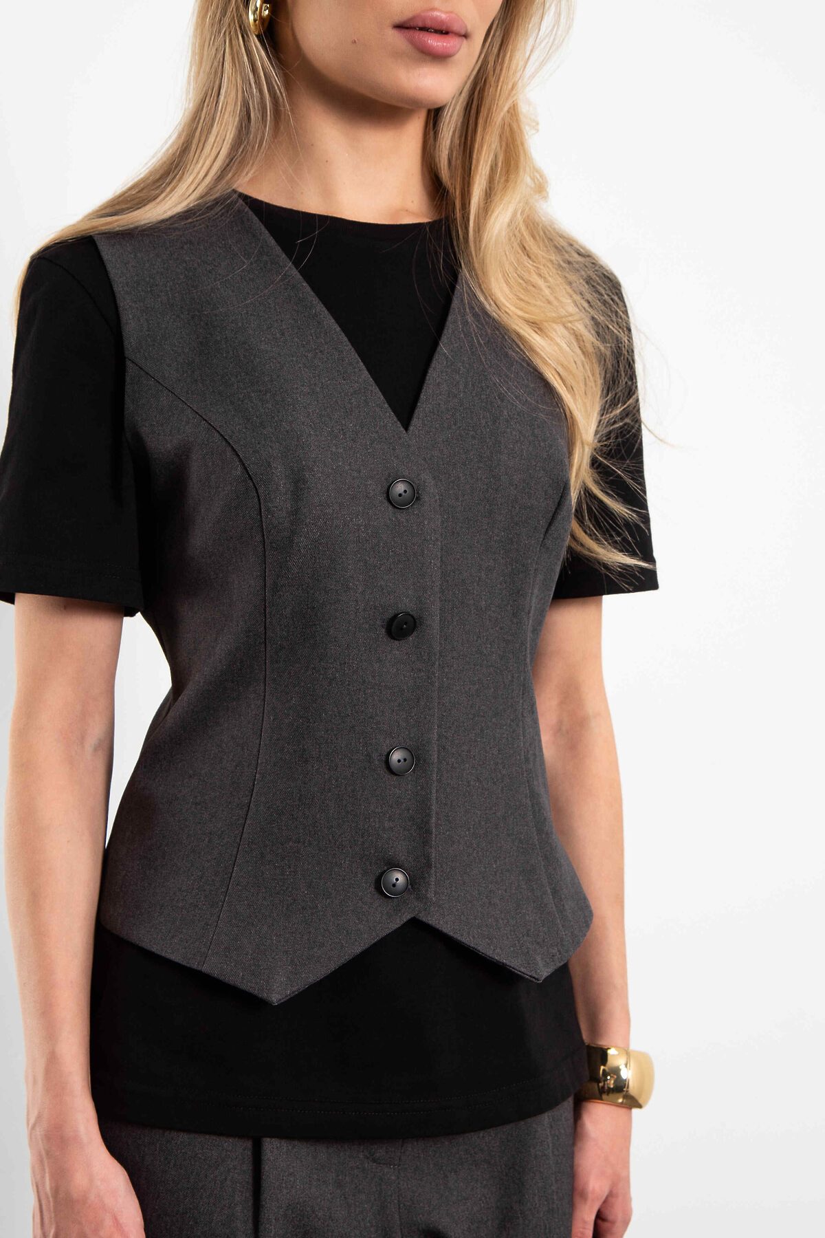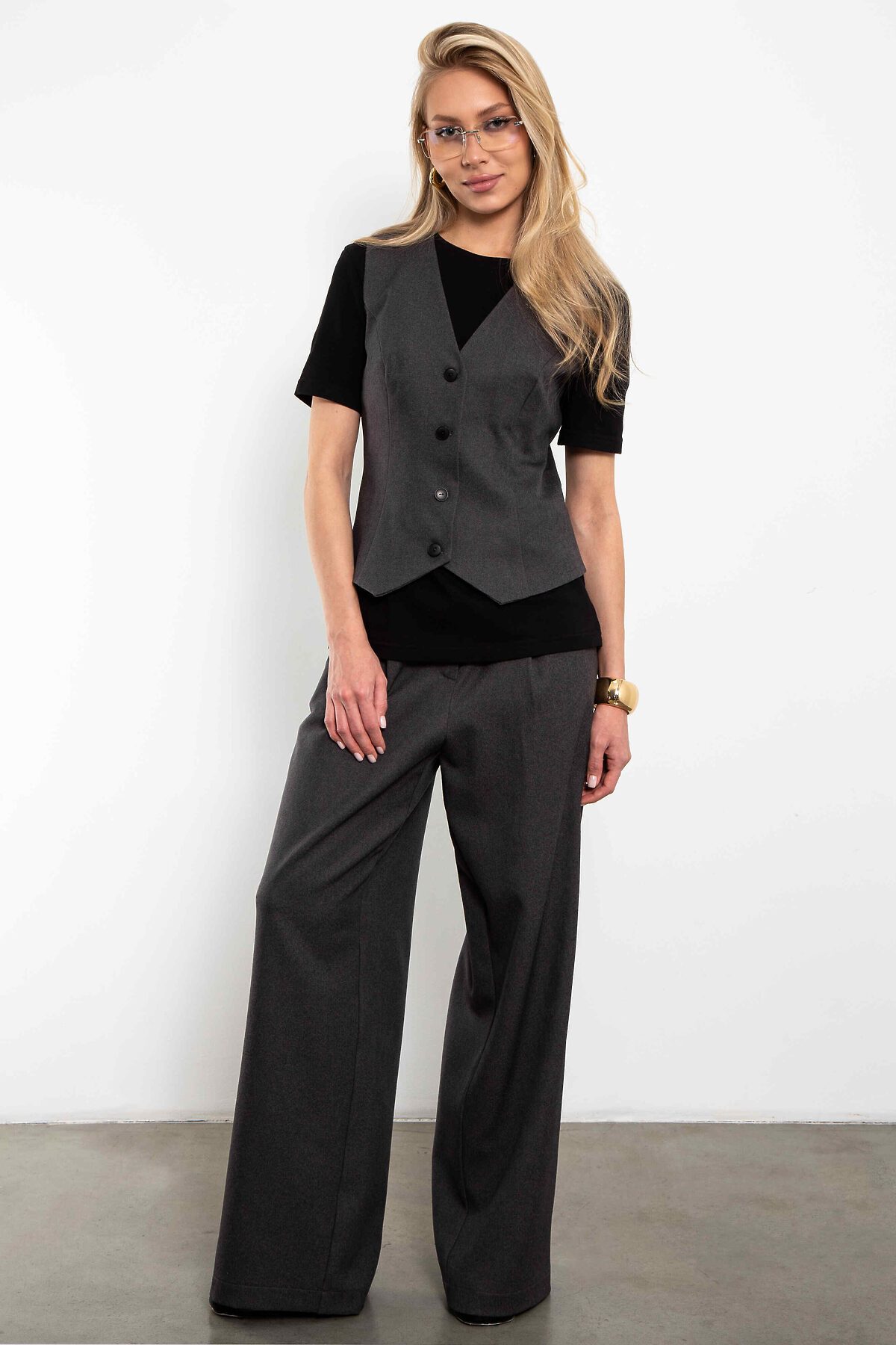 Классический приталенный жилет на подкладке, с глубоким V-вырезом, миниатюрными пуговицами.Жилет Basic создан для тех, кто ценит свободу движений и лаконичный стиль. Выглядит современно и сохраняет классические пропорции.Легко впишется в любой гардероб. Идеальный вариант — сочетать жакет с брюками палаццо для завершённого образа, но он отлично работает и в микс-энд-матчах с однотонными базовыми вещами.
