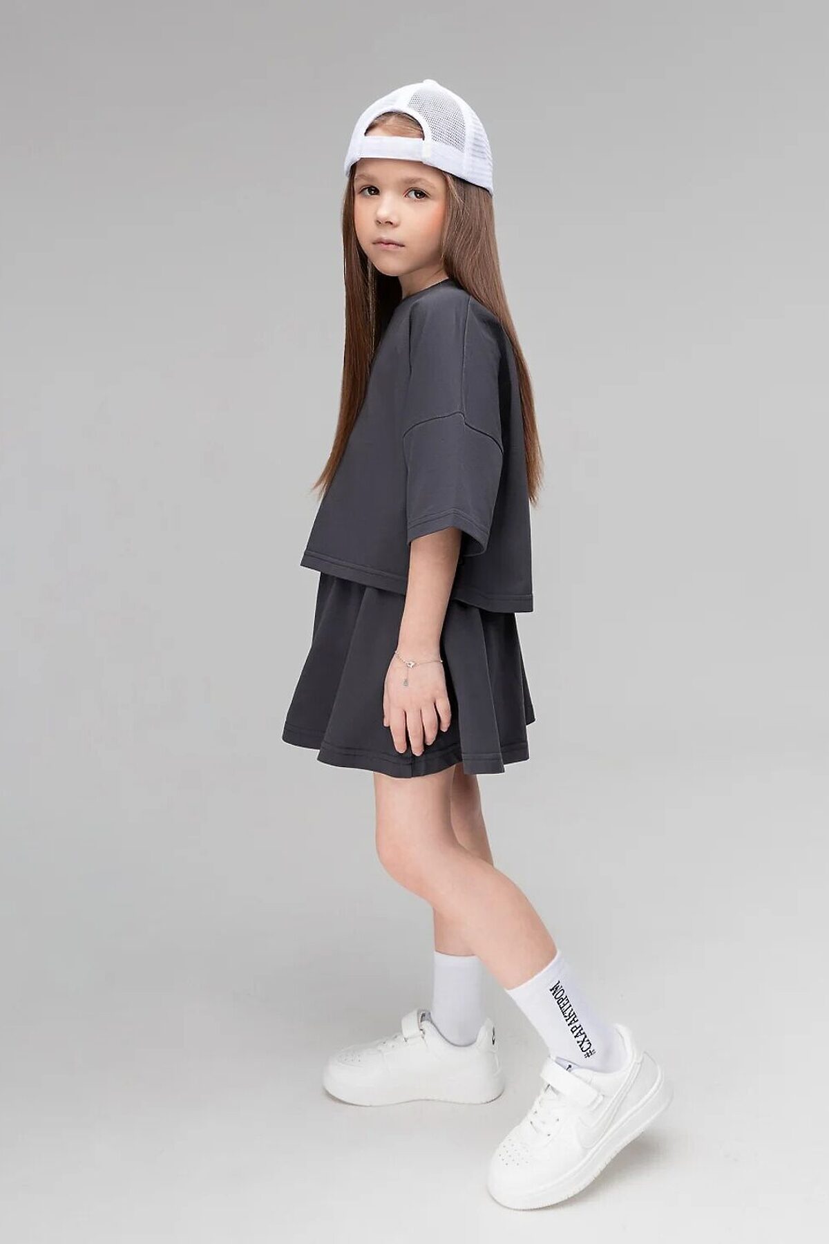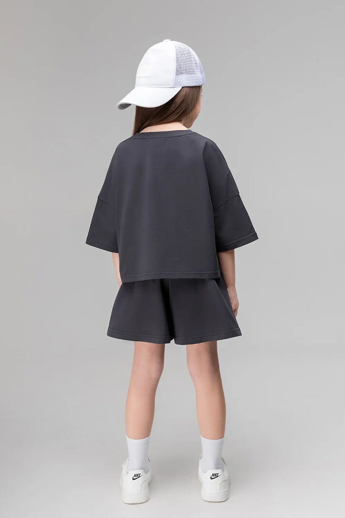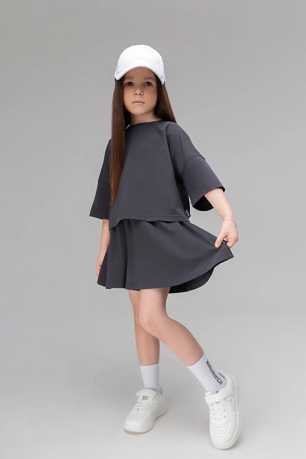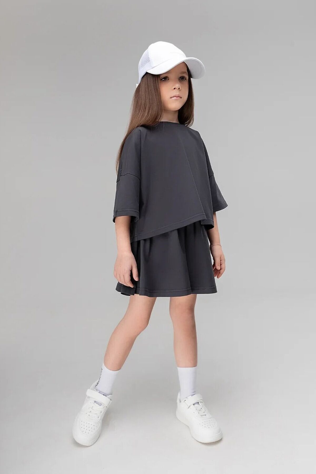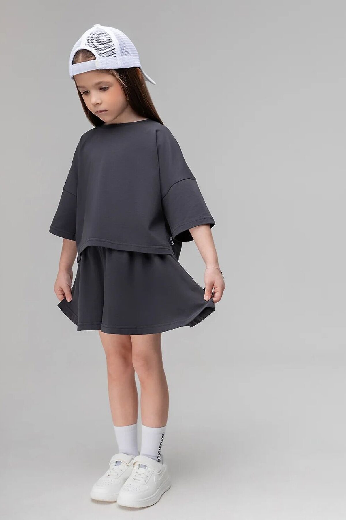 Костюм для детей дошкольного возраста. Футболка укороченная свободного силуэта со спущенным плечом с втачным коротким рукавом. Горловина футболки округлой формы, обработана рибаной. Шорты-юбка для детей дошкольного возраста. Шорты свободные на притачном поясе с внутренней резинкой, с боковыми карманами.