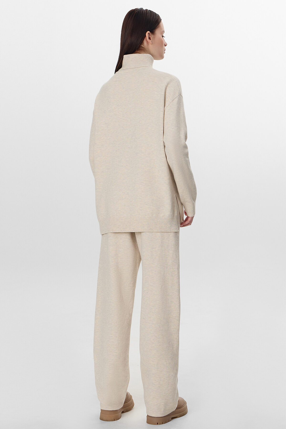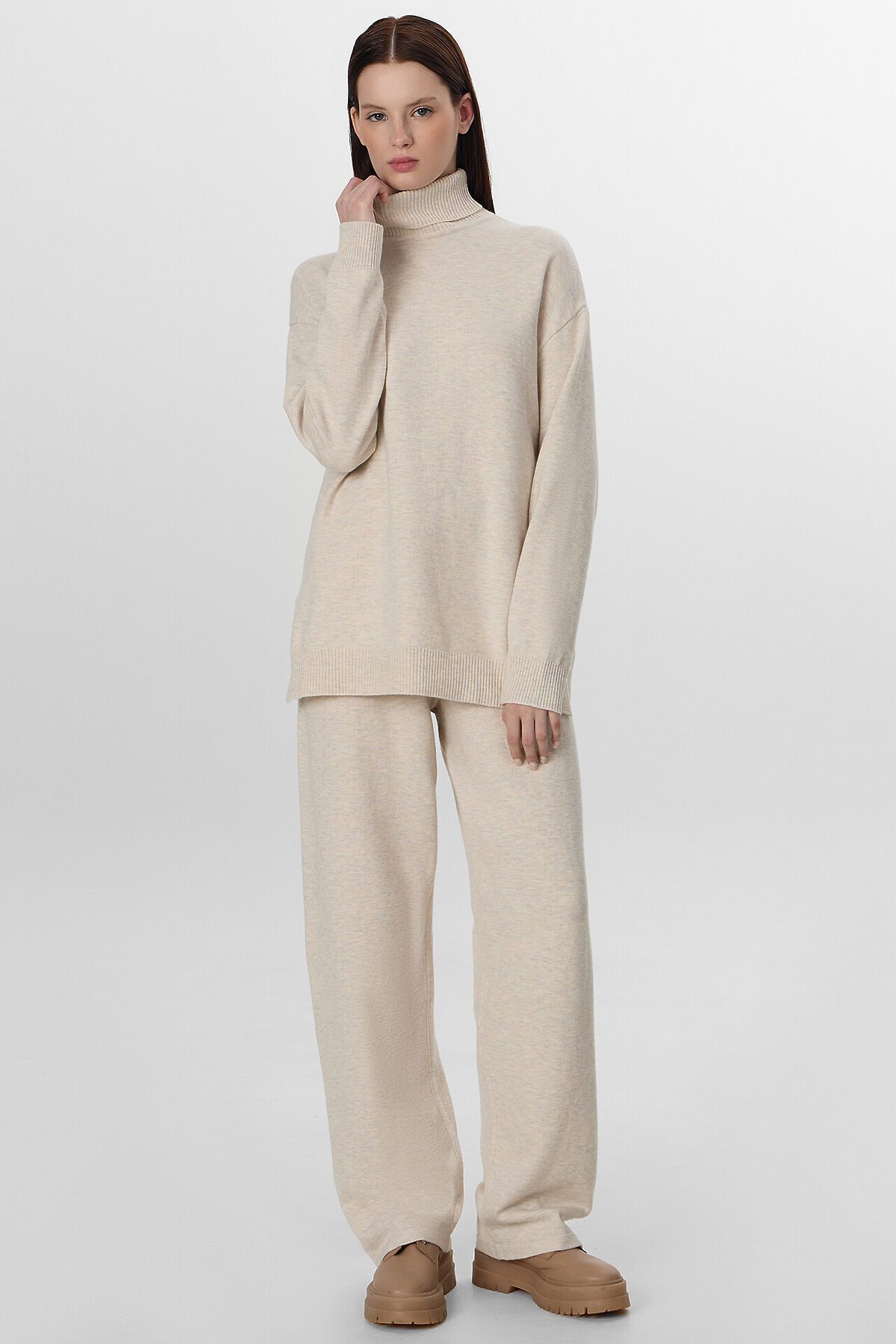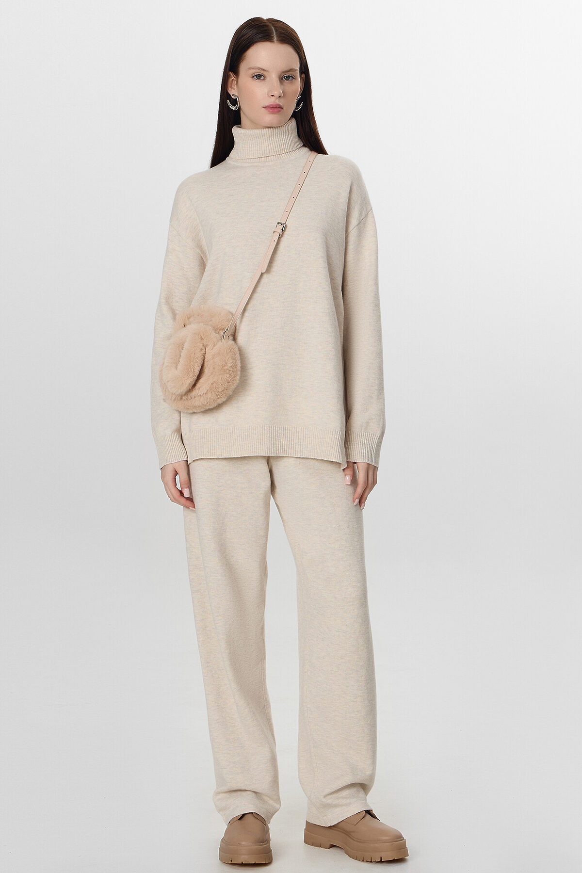Джемпер с высокой горловиной и брюки прямого кроя создают целостный гармоничный силуэт.