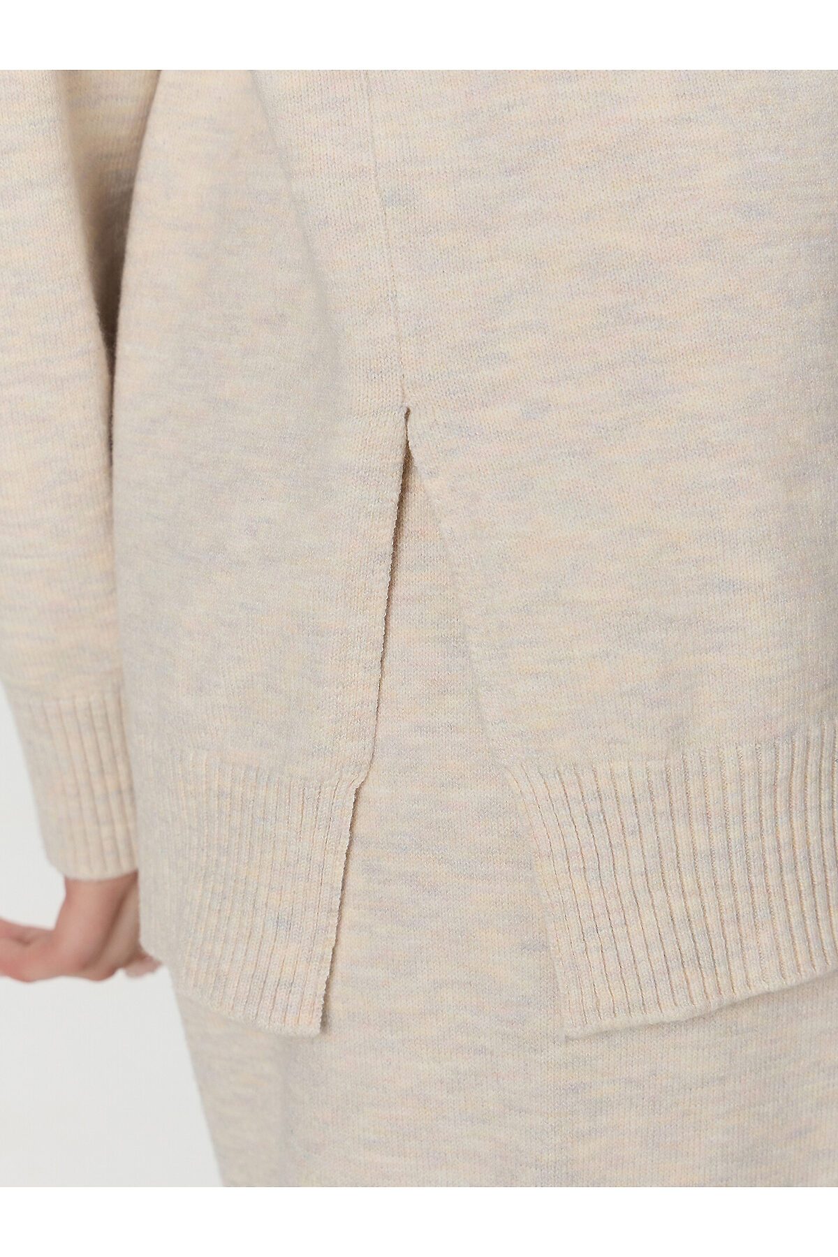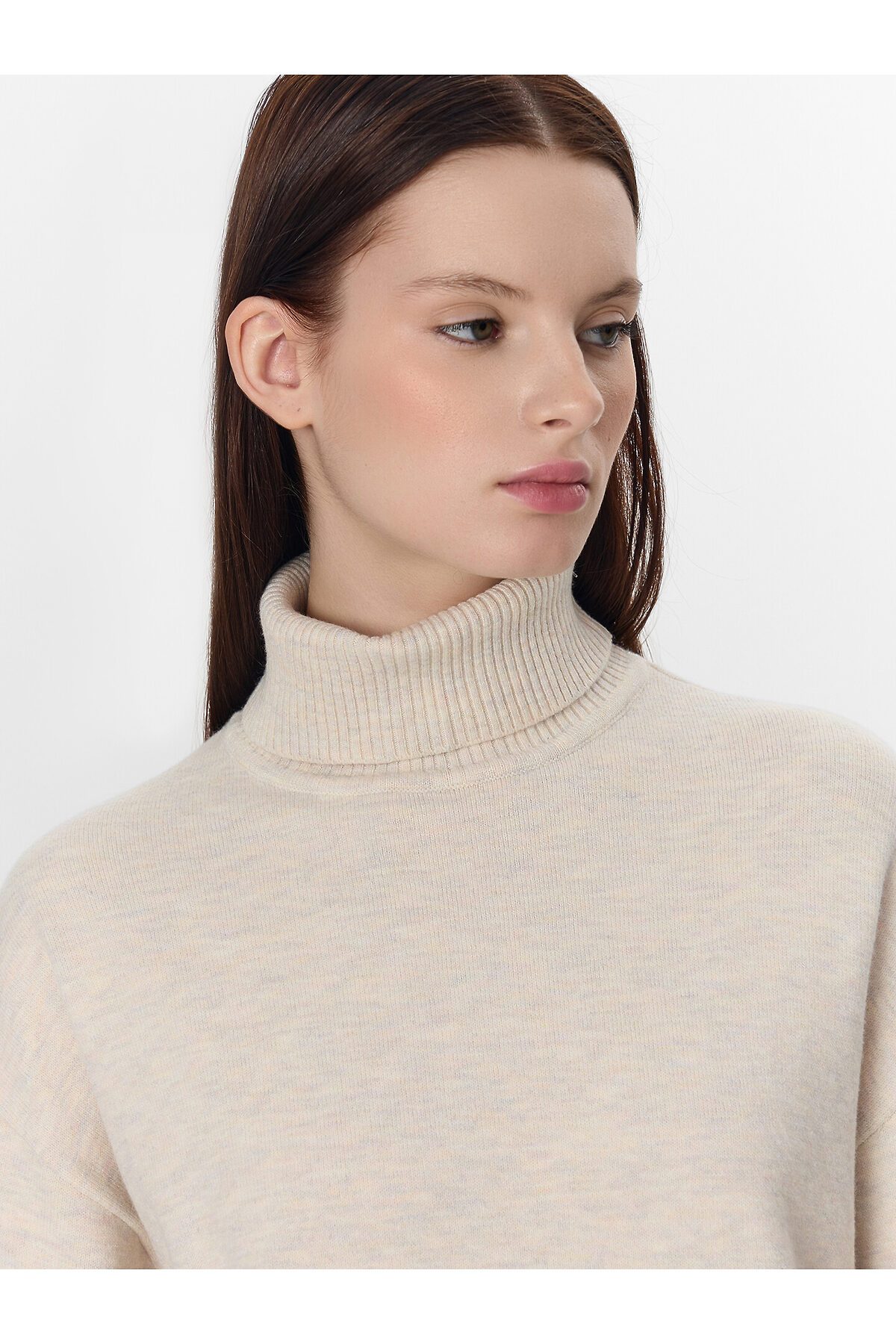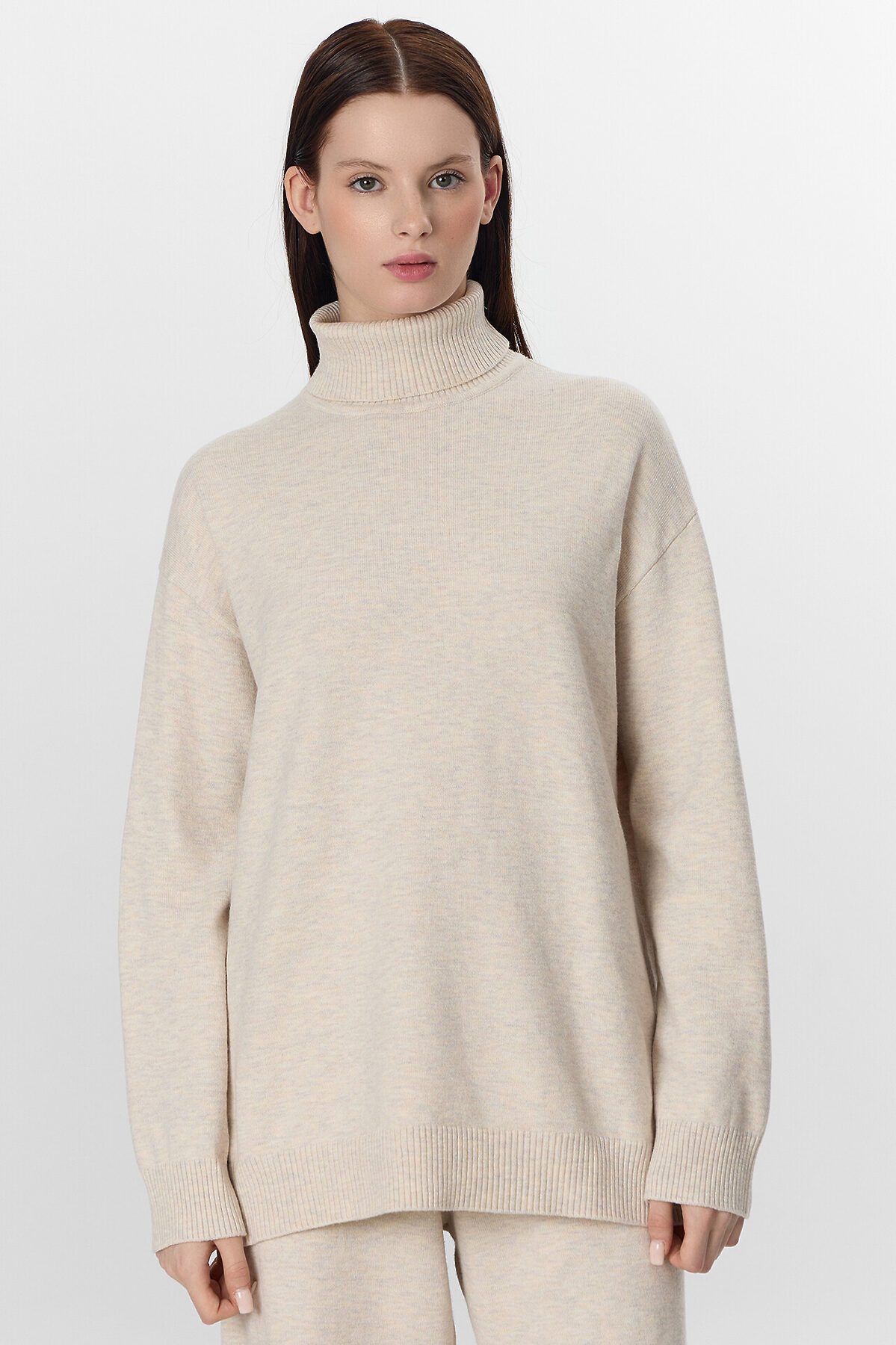 Джемпер с высокой горловиной и брюки прямого кроя создают целостный гармоничный силуэт.