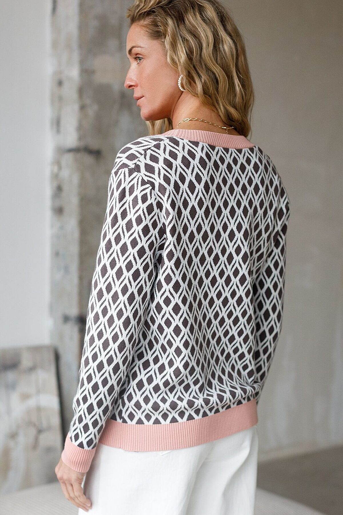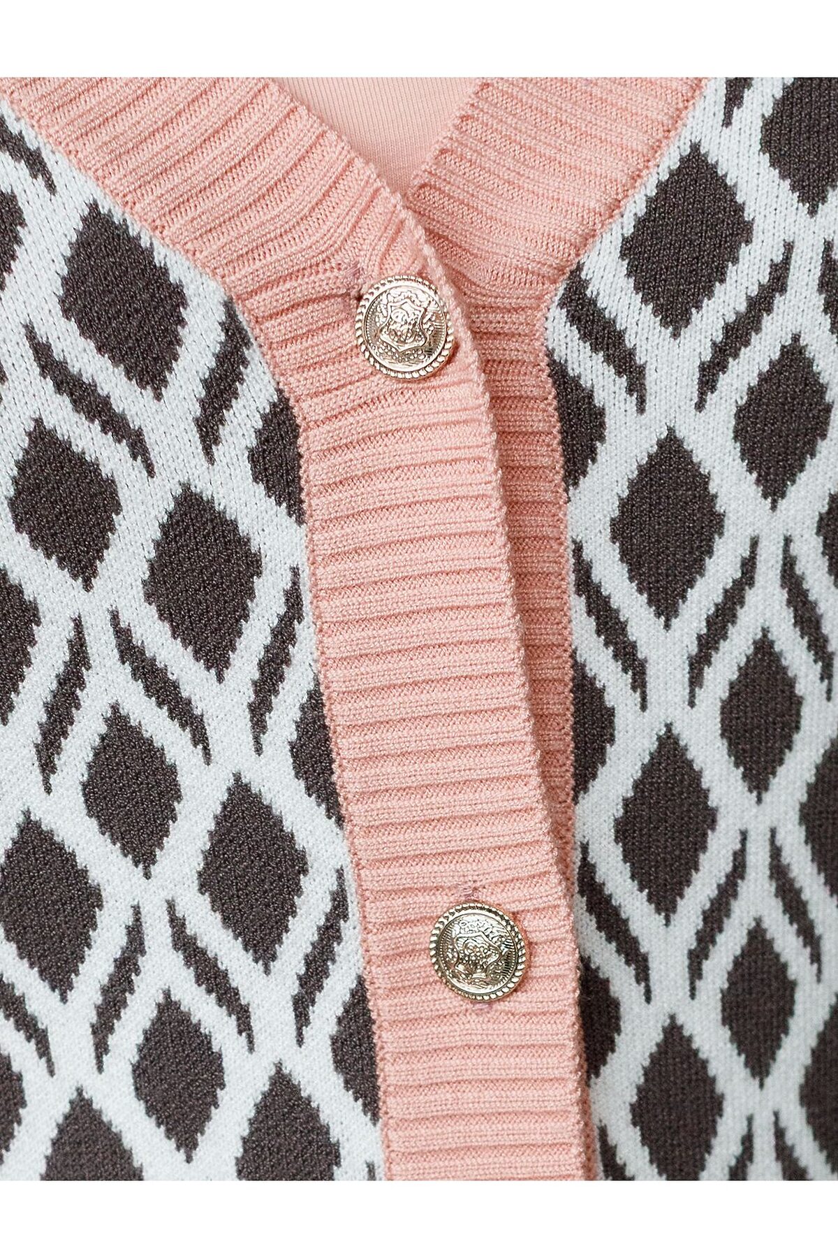 Кардиган с V-вырезом жаккардовой вязки с принтом ромб VILATTE, кофейный-белый