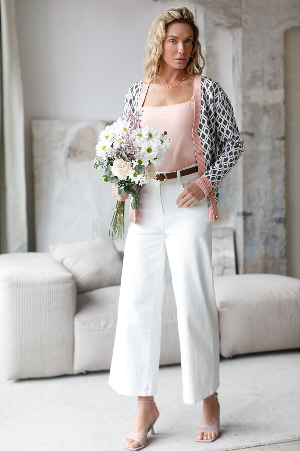 Кардиган с V-вырезом жаккардовой вязки — универсальная и женственная вещь для весны и лета. Жакет кофейно-белого цвета выполнен из приятной к телу вискозы, отличается в меру свободным кроем, который подчеркивает силуэт. V-вырез подчеркивает зону декольте и визуально вытягивает шею, делая фигуру более изящной. Спущенная линия плеча создает расслабленный силуэт, добавляя комфорта и свободы движений, что отлично подойдет для девушек и женщин плюс сайз размеров. Модель на пуговицах обеспечивает удобство в носке и добавляет классическую нотку образу. Контрастная отделка гармонично сочетается с выразительным геометрическим рисунком, который придает образу индивидуальность и современность. Принт немного напоминает благородный орнамент аргайл, Карманы-обманки украшают, сохраняя лаконичность внешнего вида, Кардиган средней длины оптимален для создания разных комбинаций на каждый день. Такой жакет легко впишется в офисный или повседневный образ благодаря своей универсальности и современному стилю. Вискоза дарит ощущение комфорта даже в теплую погоду, а качественная жаккардовая вязка сохраняет форму после стирки.