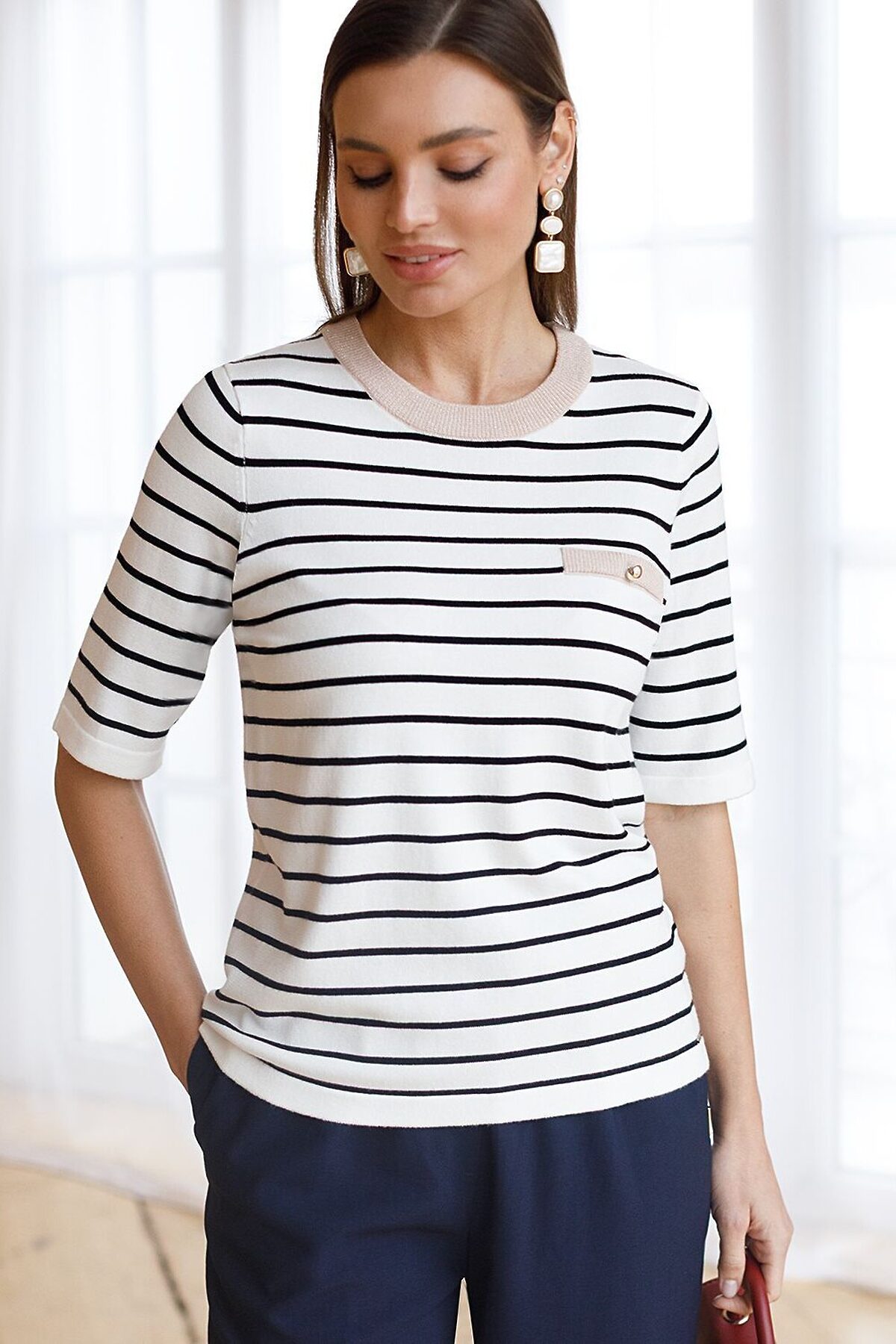 Свободный джемпер белого цвета в контрасную полоску из вискозы – выбор для тех, кто ценит стильный и современный образ. Благодаря средней длине и свободному крою джемпер гармонично смотрится на разных типах фигуры, а так же подходит на большие размеры, подчеркивая достоинства фигуры и скрывает возможные недостатки. Мягкая вискоза обеспечивает приятные ощущения к телу и подходит для ежедневной носки. Круглый ворот аккуратно подчеркивает линию шеи и подходит для разных вариантов укладки волос. Мягкий люрекс на контрастной отделке придает легкое мерцание, делая джемпер подходящим не только для повседневных выходов, но и для особых случаев. Принт выполнен в виде полосок, что делает классический джемпер актуальным в любом сезоне и который легко сочетается с разными стилями одежды. Рукав средней длины обеспечивает удобство и практичность в носке, позволяя использовать джемпер в прохладную погоду или для создания многослойных образов. Этот джемпер станет отличным дополнением гардероба, подчеркивая стиль и создавая легкую атмосферу непринужденности..