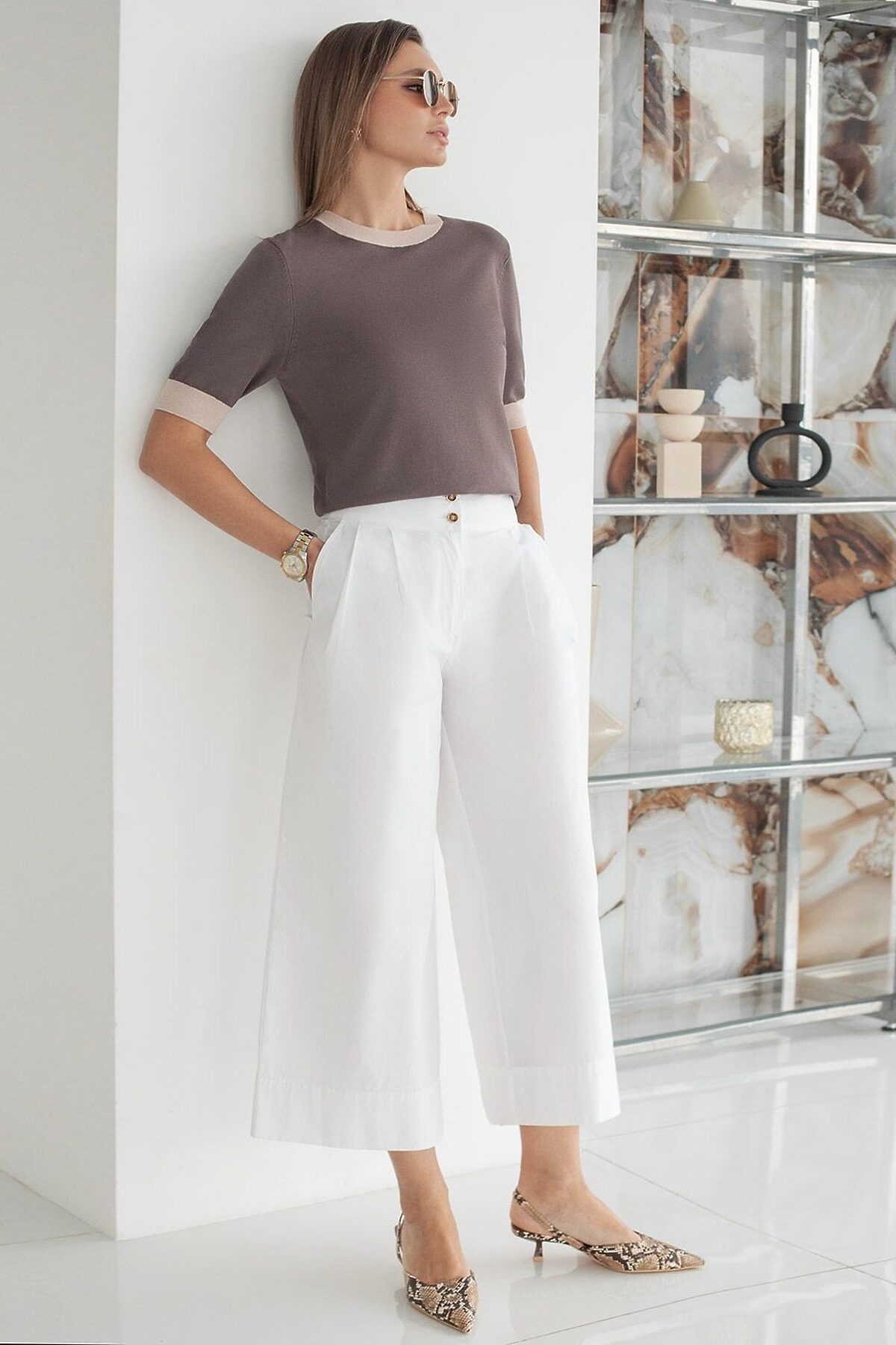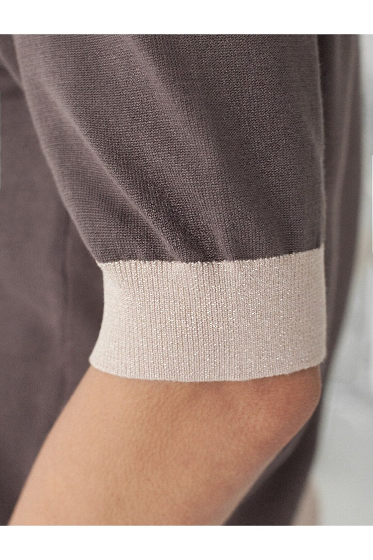 Легкий джемпер кофейного цвета с круглым вырезом идеально подходит на весну и лето. Тонкая вязка из вискозы дарит приятный комфорт и ощущение свежести в теплую погоду. Полуприлегающий крой подчеркивает силуэт, а универсальная длина позволяет сочетать джемпер с разными элементами гардероба. Контрастная отделка с мягким люрексом добавляет стильный акцент, создавая выразительный образ. Деликатное мерцание придает праздничное настроение, но не выглядит слишком ярко или вызывающе. Такой элемент украшения позволяет носить нарядный джемпер и на особых мероприятиях. Джемпер отлично смотрится на больших размерах благодаря продуманному крою и полуприлегающему фасону. Этот джемпер с коротким рукавом станет незаменимой частью гардероба в сезоны, когда хочется легкости и элегантности одновременно. Лаконичный дизайн обеспечивает простоту комбинирования с другими вещами и будет универсальной базой для создания разнообразных комплектов — от офисного до непринужденного городского стиля.