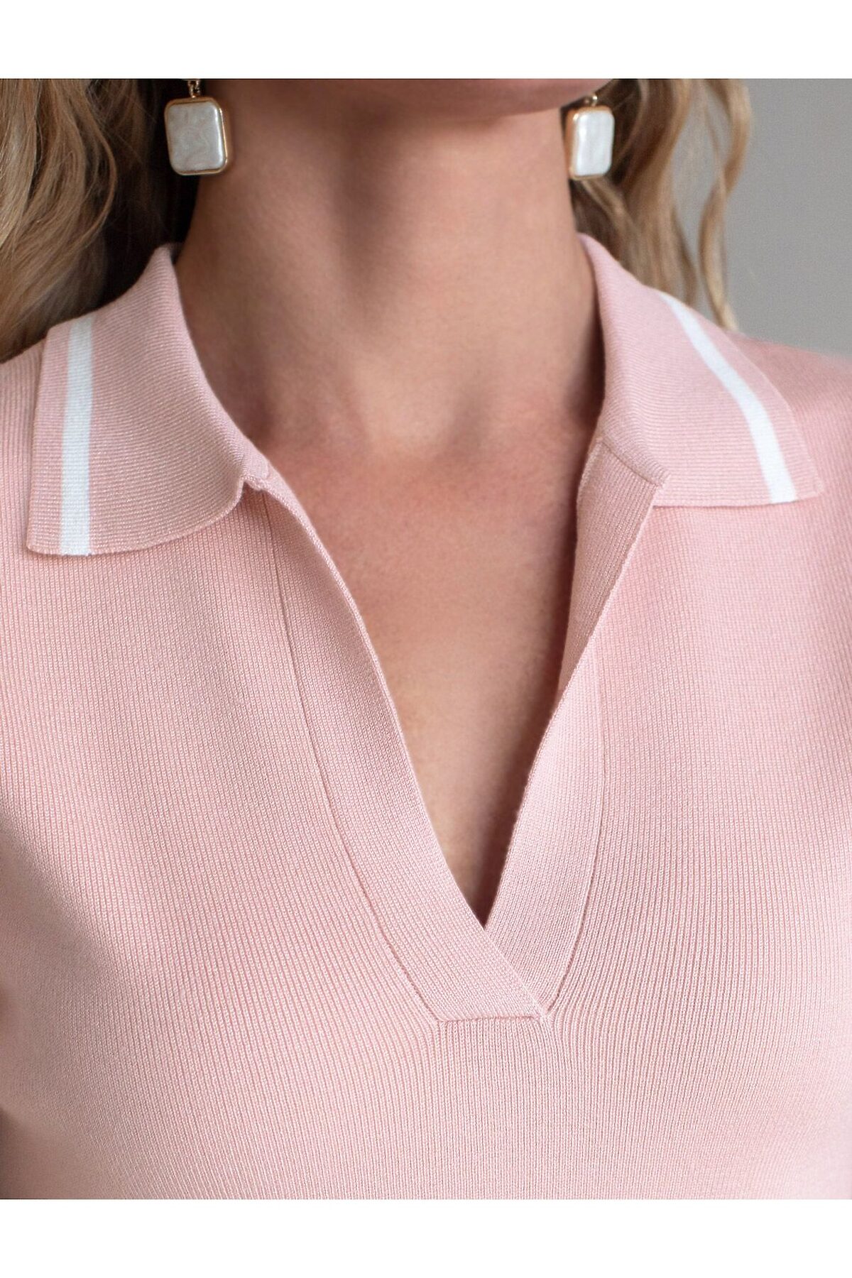 Легкий джемпер светло-розового цвета с V-вырезом и отложным воротником идеально подходит на весну и лето. Вязка в тонкий рубчик из вискозы дарит приятный комфорт и ощущение свежести в теплую погоду. Полуприлегающий крой подчеркивает силуэт, а универсальная длина позволяет сочетать джемпер с разными элементами гардероба. Контрастная отделка в виде тонких полосок добавляет стильный акцент, создавая выразительный образ. V-вырез подчеркивает зону декольте и визуально вытягивает шею, делая фигуру более изящной, а классический отложной воротник делает внешний вид более аккуратным и завершенным. Джемпер отлично смотрится на больших размерах благодаря продуманному крою и полуприлегающему фасону. Этот джемпер с коротким рукавом станет незаменимой частью гардероба в сезоны, когда хочется легкости и элегантности одновременно. Лаконичный дизайн обеспечивает простоту комбинирования с другими вещами и будет универсальной базой для создания разнообразных комплектов — от офисного до непринужденного городского стиля.
