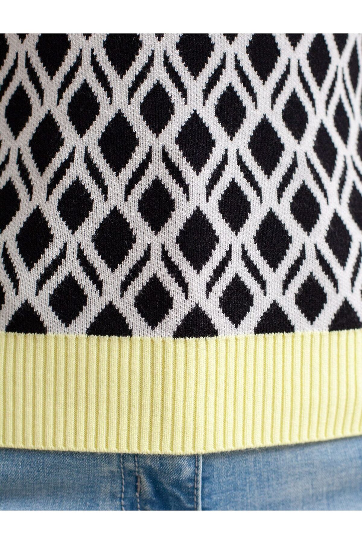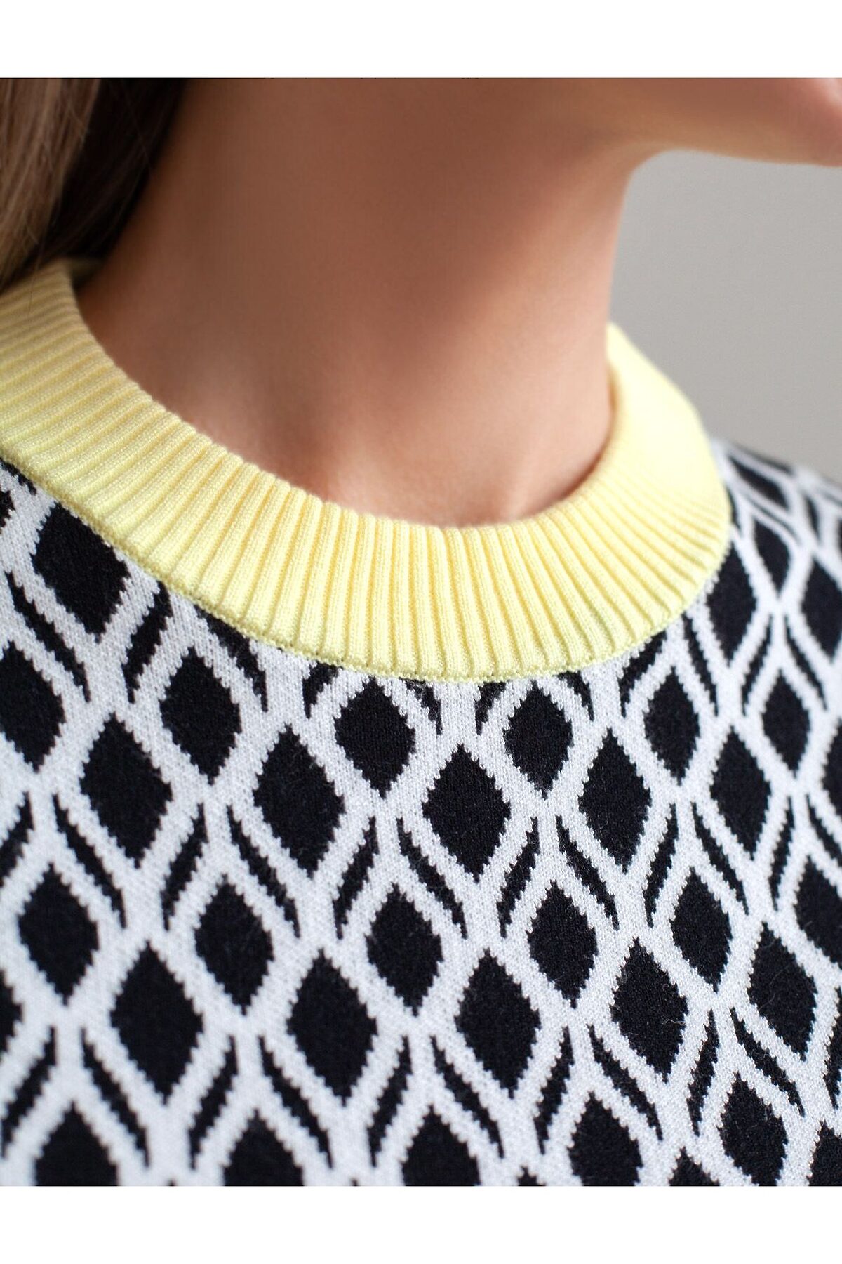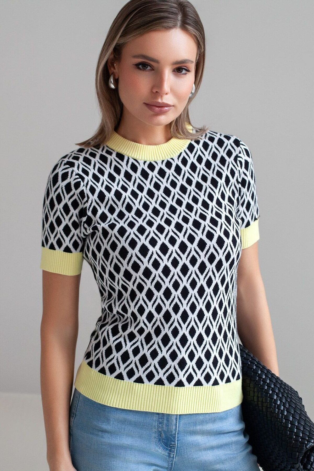 Джемпер с коротким рукавом жаккардовой вязки — универсальная и стильная вещь для весны и лета. Бело-черный джемпер выполнен из приятной к телу вискозы, которая дарит ощущение комфорта даже в теплую погоду, а качественная жаккардовая вязка сохраняет форму после стирки. Контрастная отделка гармонично сочетается с выразительным геометрическим рисунком, который придает образу индивидуальность и современность. Принт немного напоминает благородный орнамент аргайл. Вискоза Джемпер отлично смотрится на больших размерах благодаря продуманному крою и полуприлегающему фасону. Этот джемпер с коротким рукавом станет незаменимой частью гардероба в сезоны, когда хочется легкости и стиля одновременно.