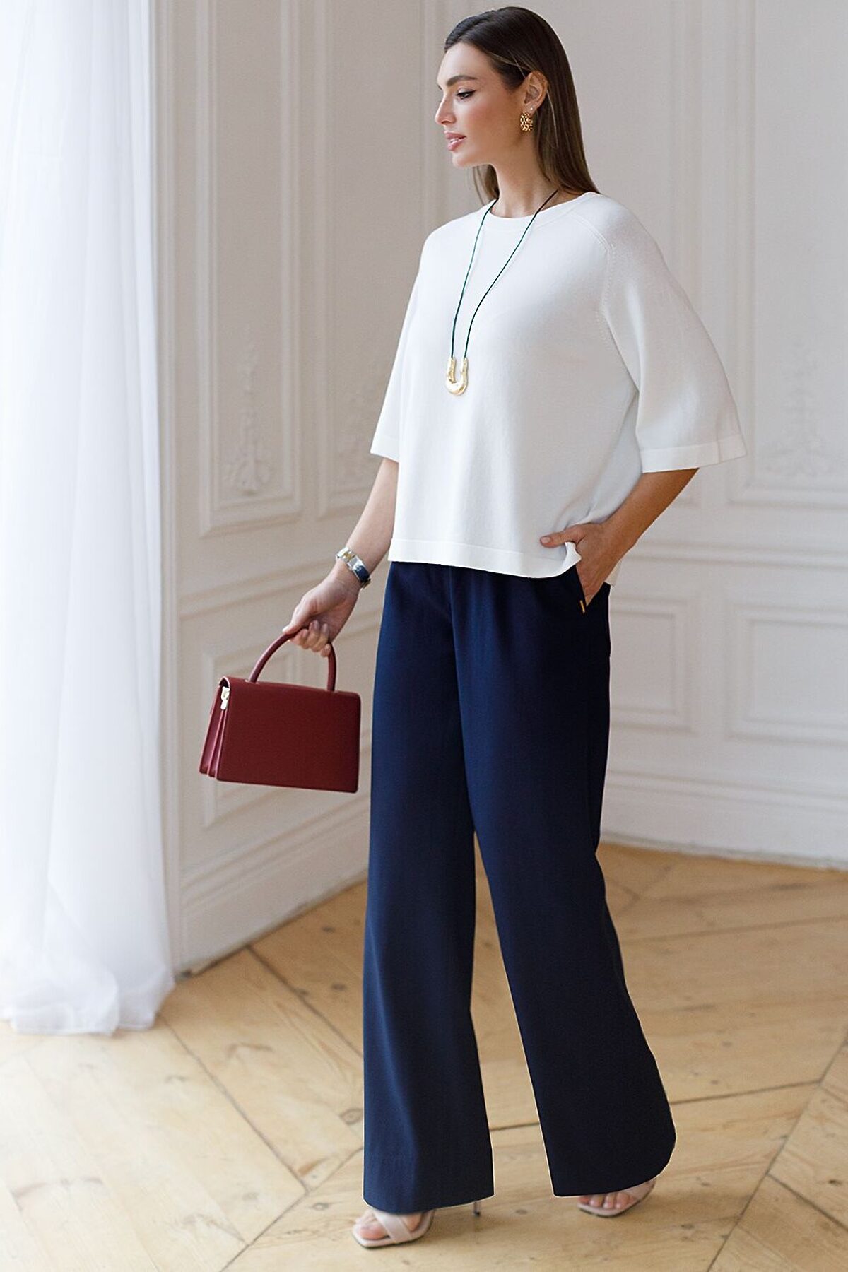 Легкий свободный джемпер белого цвета с круглым вырезом идеально подходит на весну и лето. Тонкая вязка из вискозы дарит приятный комфорт и ощущение свежести в теплую погоду. Универсальная длина позволяет сочетать джемпер с разными элементами гардероба. Джемпер отлично смотрится на больших размерах благодаря продуманному крою и свободному фасону. Широкие рукава создают воздушность и делают силуэт особенно женственным. Этот джемпер с рукавом 3/4 станет незаменимой частью гардероба в сезоны, когда хочется легкости и элегантности одновременно. Лаконичный дизайн обеспечивает простоту комбинирования с другими вещами и будет универсальной базой для создания разнообразных комплектов — от офисного до непринужденного городского стиля.