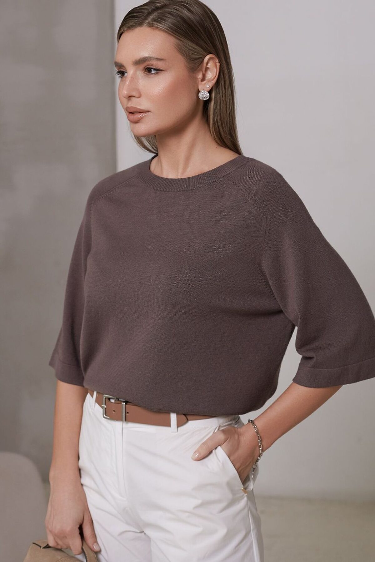 Легкий свободный джемпер кофейного цвета с круглым вырезом идеально подходит на весну и лето. Тонкая вязка из вискозы дарит приятный комфорт и ощущение свежести в теплую погоду. Универсальная длина позволяет сочетать джемпер с разными элементами гардероба. Джемпер отлично смотрится на больших размерах благодаря продуманному крою и свободному фасону. Широкие рукава создают воздушность и делают силуэт особенно женственным. Этот джемпер с рукавом 3/4 станет незаменимой частью гардероба в сезоны, когда хочется легкости и элегантности одновременно. Лаконичный дизайн обеспечивает простоту комбинирования с другими вещами и будет универсальной базой для создания разнообразных комплектов — от офисного до непринужденного городского стиля.