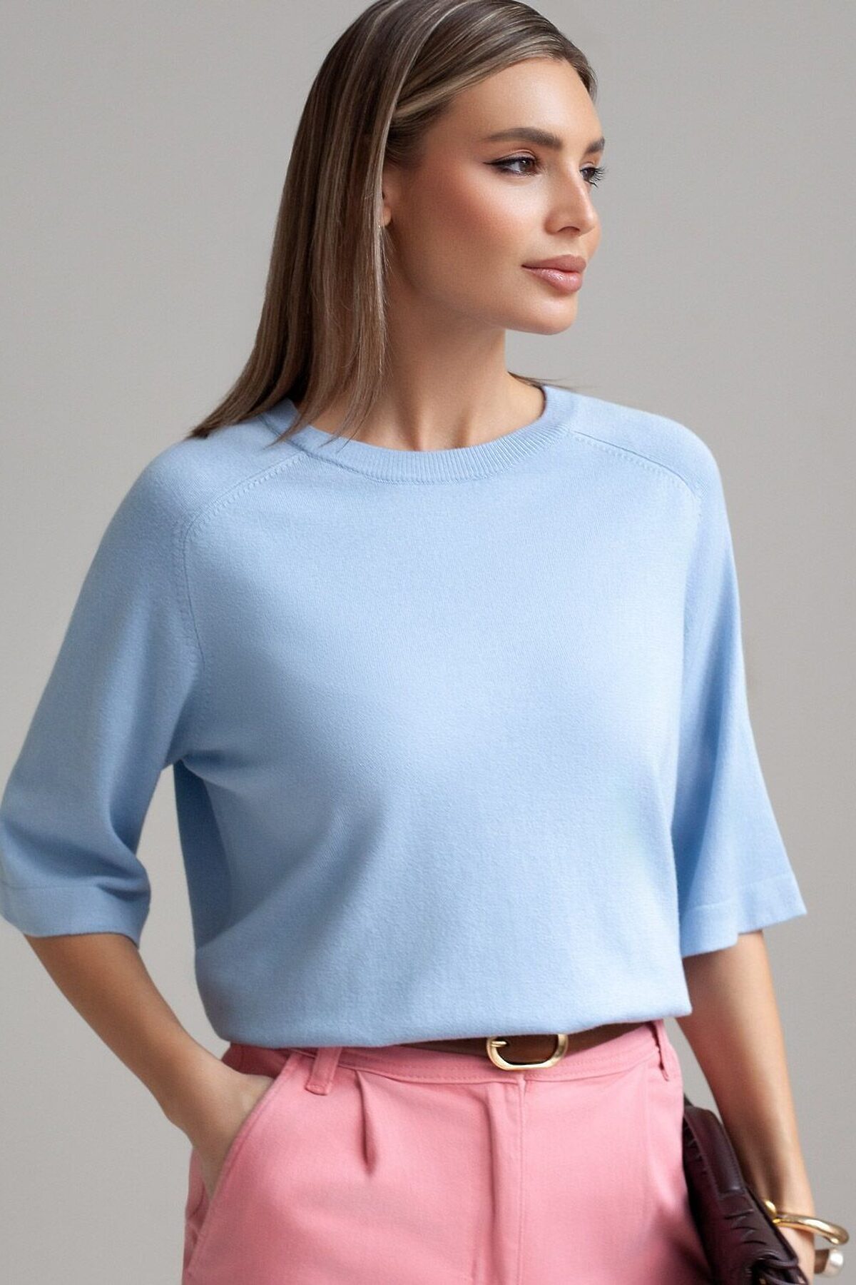 Легкий свободный джемпер светло-голубого цвета с круглым вырезом идеально подходит на весну и лето. Тонкая вязка из вискозы дарит приятный комфорт и ощущение свежести в теплую погоду. Универсальная длина позволяет сочетать джемпер с разными элементами гардероба. Джемпер отлично смотрится на больших размерах благодаря продуманному крою и свободному фасону. Широкие рукава создают воздушность и делают силуэт особенно женственным. Этот джемпер с рукавом 3/4 станет незаменимой частью гардероба в сезоны, когда хочется легкости и элегантности одновременно. Лаконичный дизайн обеспечивает простоту комбинирования с другими вещами и будет универсальной базой для создания разнообразных комплектов — от офисного до непринужденного городского стиля.