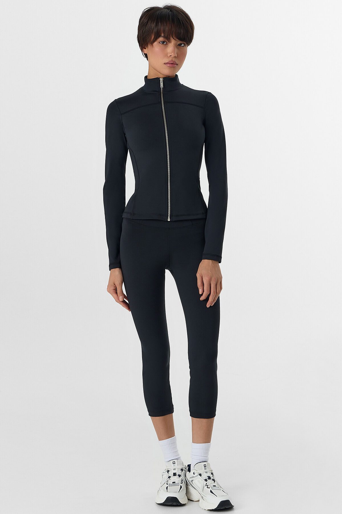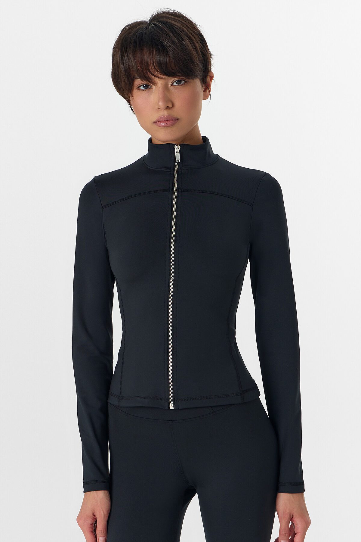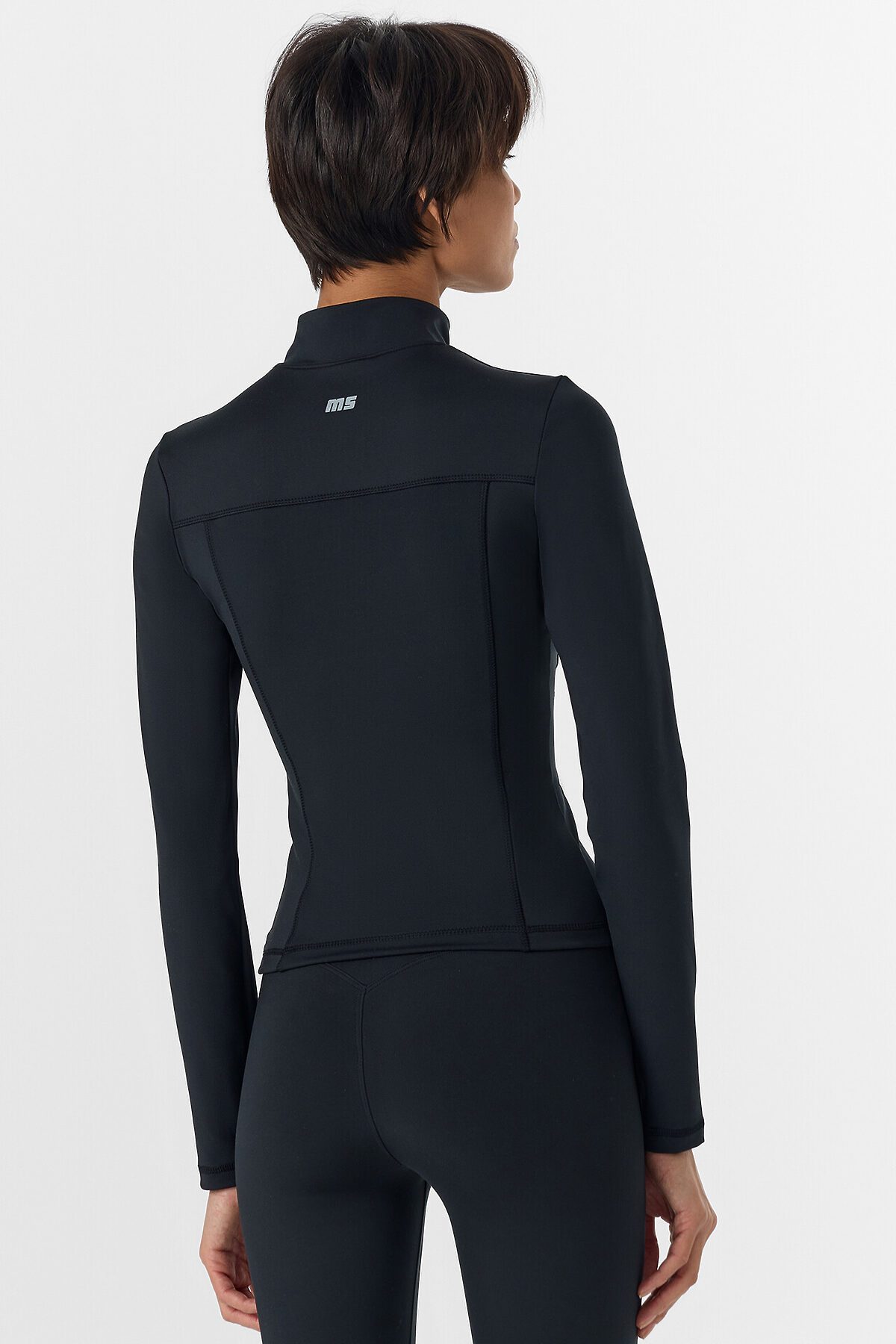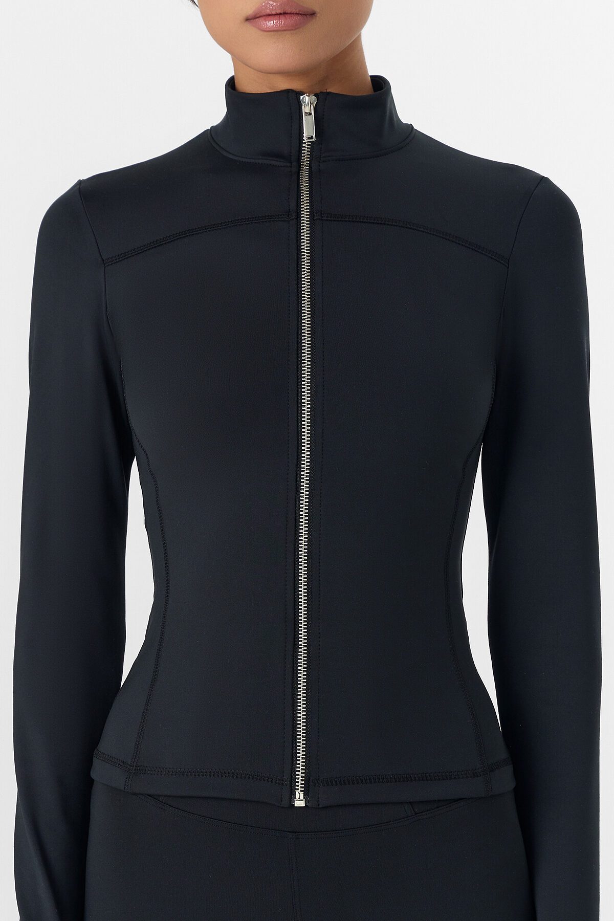 Жакет изготовлен из трикотажного полотна интерлок Жакет прилегающего силуэта, укороченный. Горловина округлой формы с воротником стойкой. Рукава втачные длинные. Жакет с отрезными бочками. По переду фигурная кокетка. По спинке фигурные рельефы.Центральная застежка на железную молнию (OpenEnd, StandartMetal №8 (7.6мм), слайдер Auto-Lock. Нижний срез жакета и рукавов обработан швом вподгибку.
