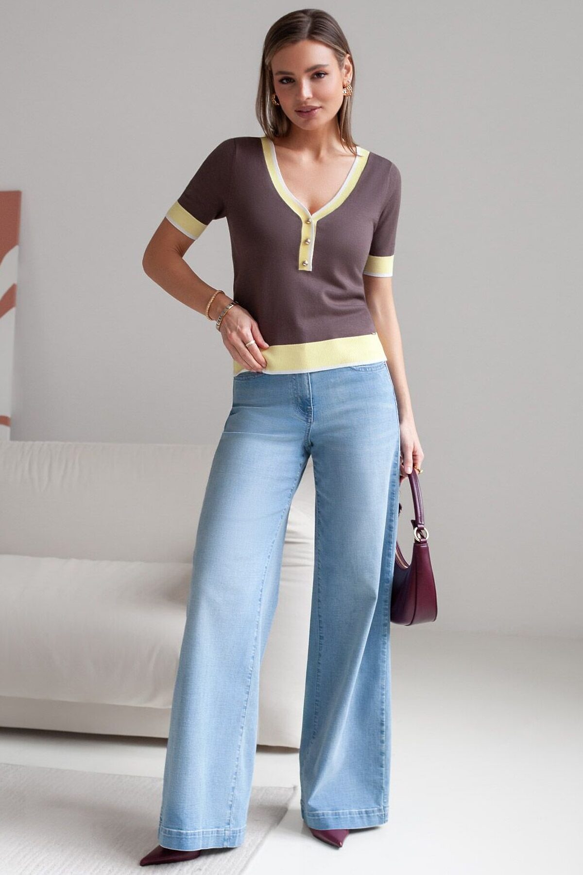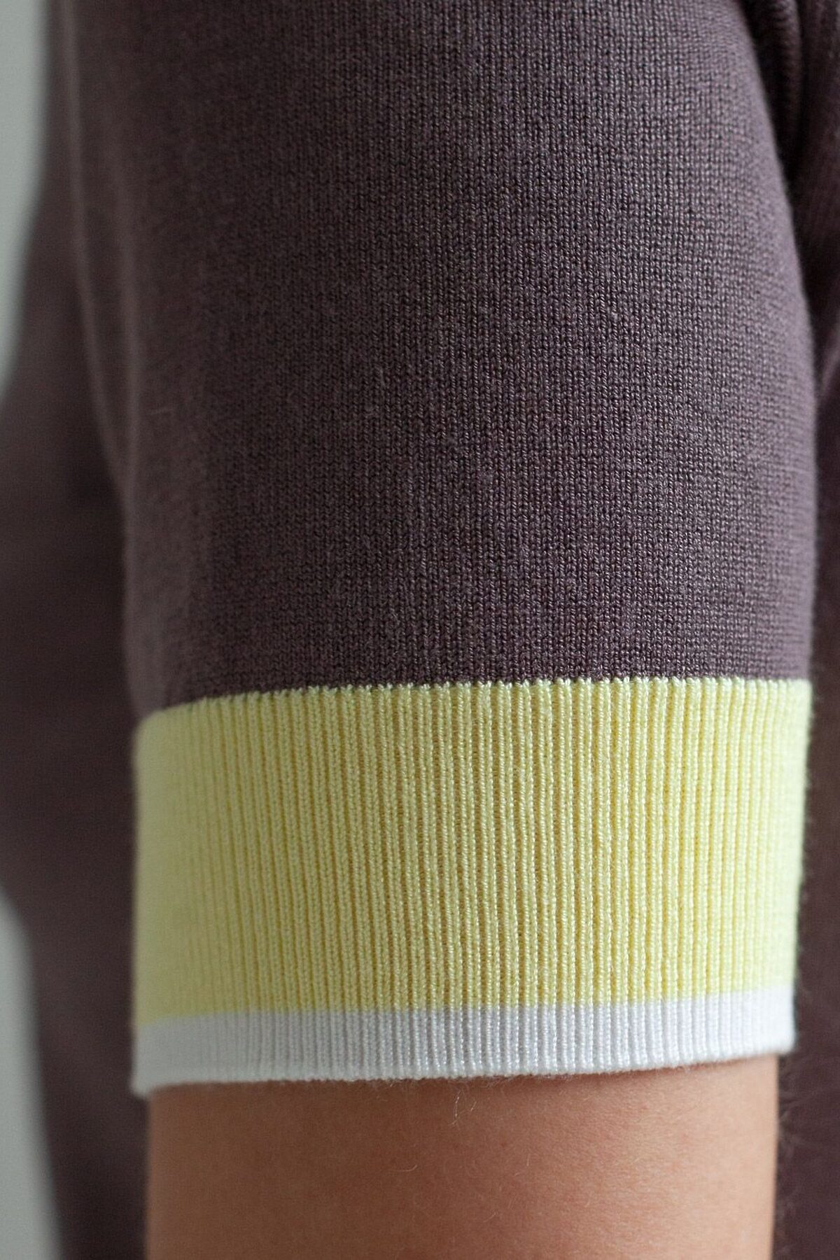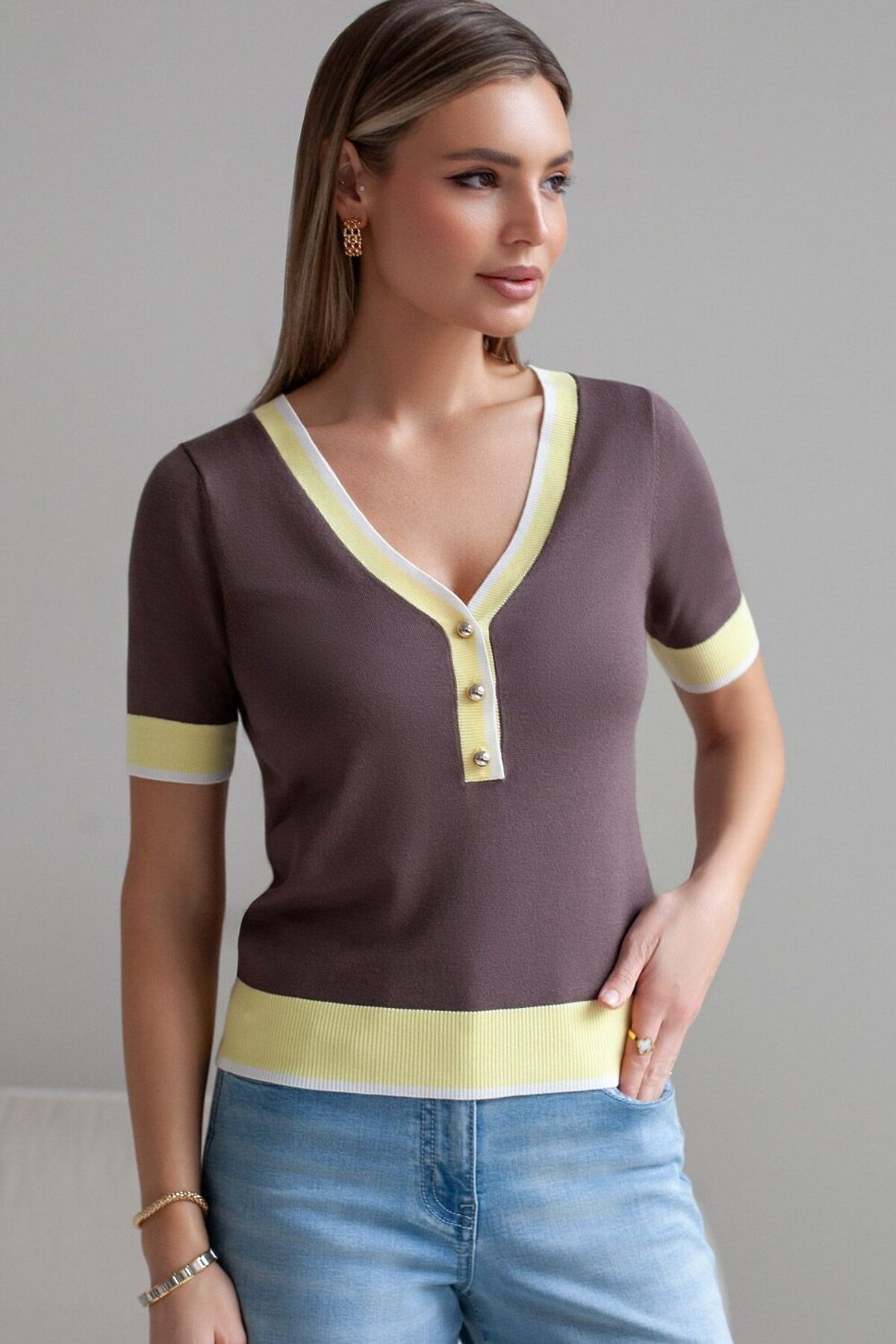 Легкий джемпер кофейного цвета с V-вырезом идеально подходит на весну и лето. Тонкая вязка из вискозы дарит приятный комфорт и ощущение свежести в теплую погоду. Полуприлегающий крой подчеркивает силуэт, а универсальная длина позволяет сочетать джемпер с разными элементами гардероба. V-вырез с пуговицами подчеркивает зону декольте и визуально вытягивает шею, делая фигуру более изящной. Контрастная отделка добавляет стильный акцент, создавая выразительный образ. Джемпер отлично смотрится на больших размерах благодаря продуманному крою и полуприлегающему фасону. Этот джемпер с коротким рукавом станет незаменимой частью гардероба в сезоны, когда хочется легкости и элегантности одновременно. Лаконичный дизайн обеспечивает простоту комбинирования с другими вещами и будет универсальной базой для создания разнообразных комплектов — от офисного до непринужденного городского стиля.