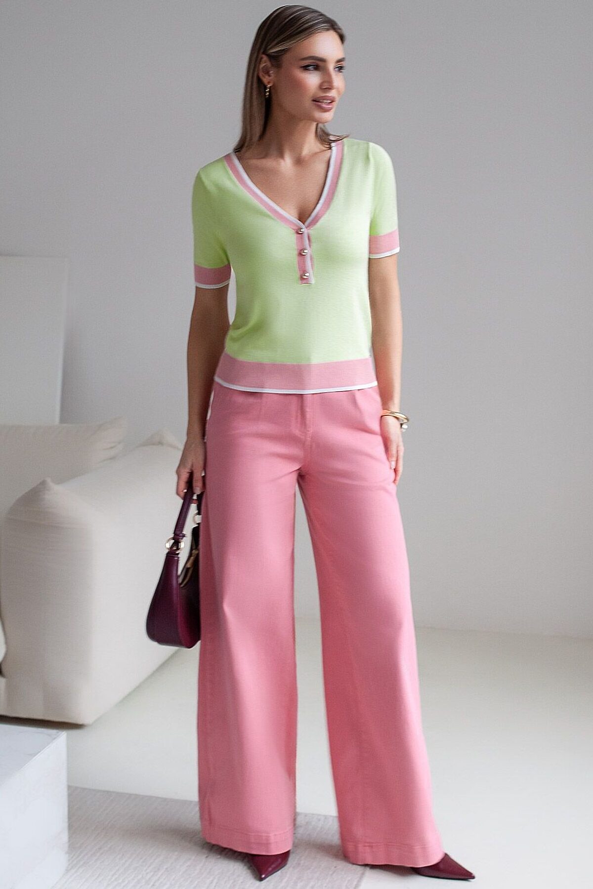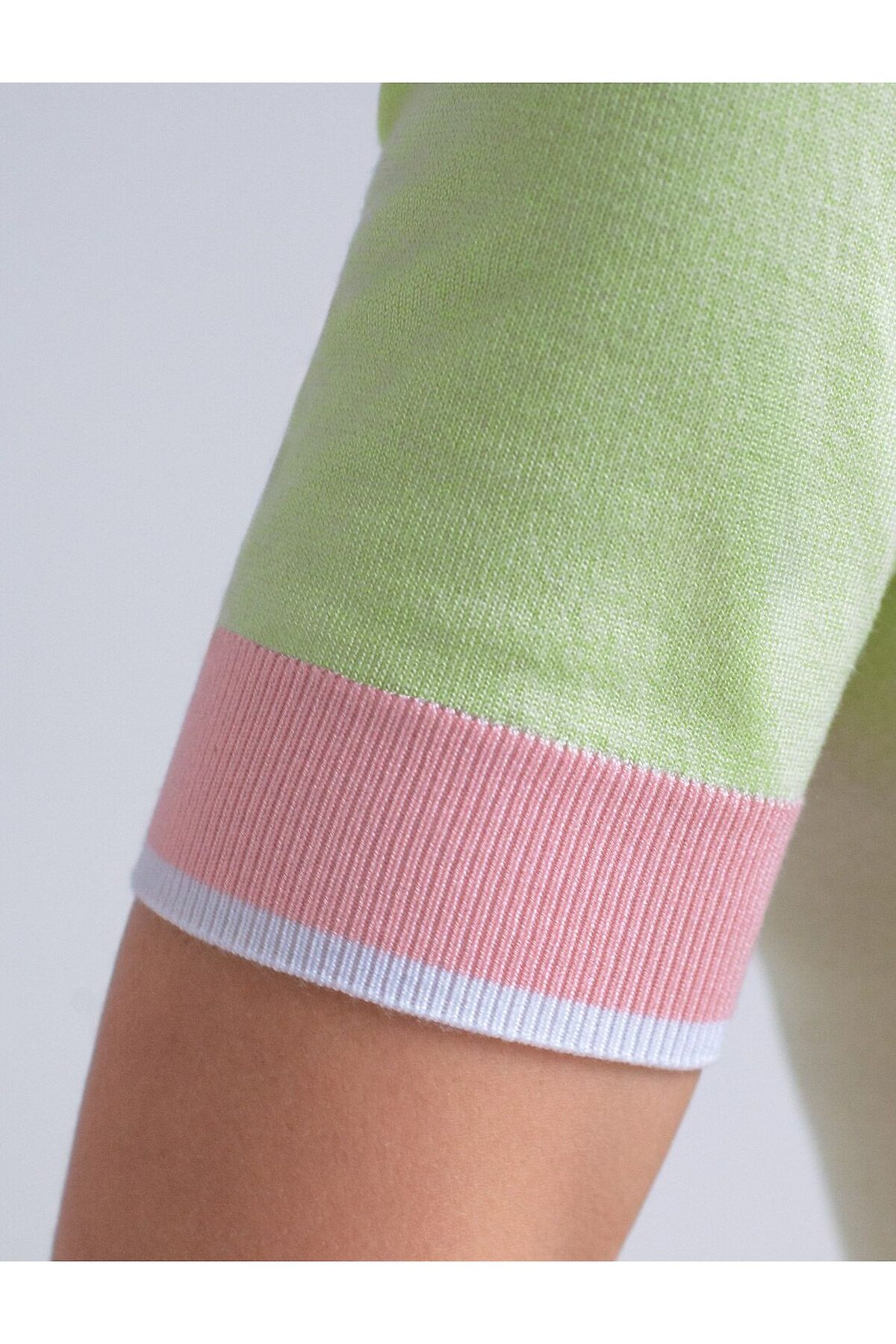 Легкий джемпер светло-зеленого цвета с V-вырезом идеально подходит на весну и лето. Тонкая вязка из вискозы дарит приятный комфорт и ощущение свежести в теплую погоду. Полуприлегающий крой подчеркивает силуэт, а универсальная длина позволяет сочетать джемпер с разными элементами гардероба. V-вырез с пуговицами подчеркивает зону декольте и визуально вытягивает шею, делая фигуру более изящной. Контрастная отделка добавляет стильный акцент, создавая выразительный образ. Джемпер отлично смотрится на больших размерах благодаря продуманному крою и полуприлегающему фасону. Этот джемпер с коротким рукавом станет незаменимой частью гардероба в сезоны, когда хочется легкости и элегантности одновременно. Лаконичный дизайн обеспечивает простоту комбинирования с другими вещами и будет универсальной базой для создания разнообразных комплектов — от офисного до непринужденного городского стиля.