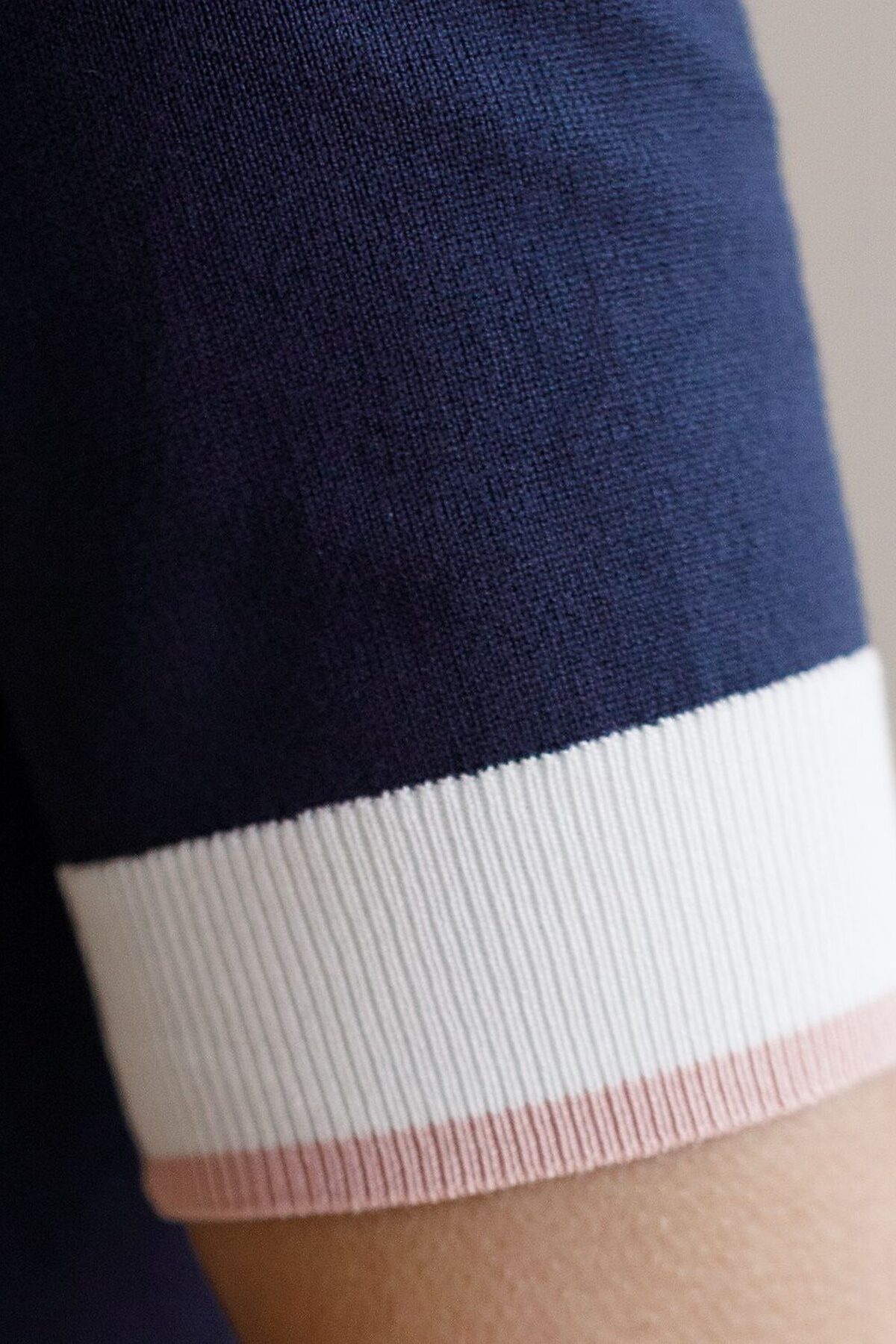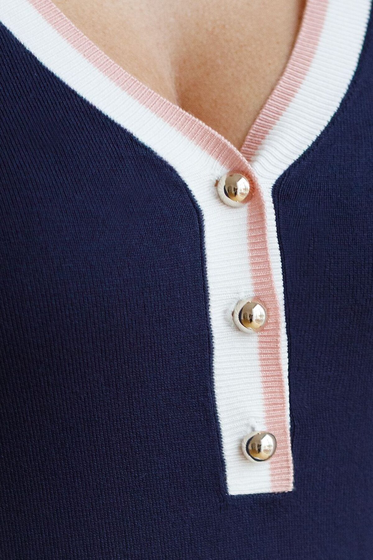 Легкий джемпер темно-синего цвета с V-вырезом идеально подходит на весну и лето. Тонкая вязка из вискозы дарит приятный комфорт и ощущение свежести в теплую погоду. Полуприлегающий крой подчеркивает силуэт, а универсальная длина позволяет сочетать джемпер с разными элементами гардероба. V-вырез с пуговицами подчеркивает зону декольте и визуально вытягивает шею, делая фигуру более изящной. Контрастная отделка добавляет стильный акцент, создавая выразительный образ. Джемпер отлично смотрится на больших размерах благодаря продуманному крою и полуприлегающему фасону. Этот джемпер с коротким рукавом станет незаменимой частью гардероба в сезоны, когда хочется легкости и элегантности одновременно. Лаконичный дизайн обеспечивает простоту комбинирования с другими вещами и будет универсальной базой для создания разнообразных комплектов — от офисного до непринужденного городского стиля.