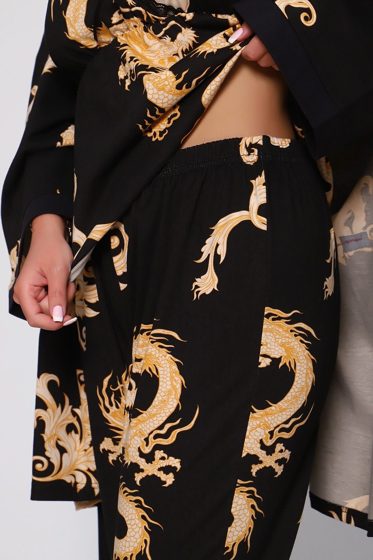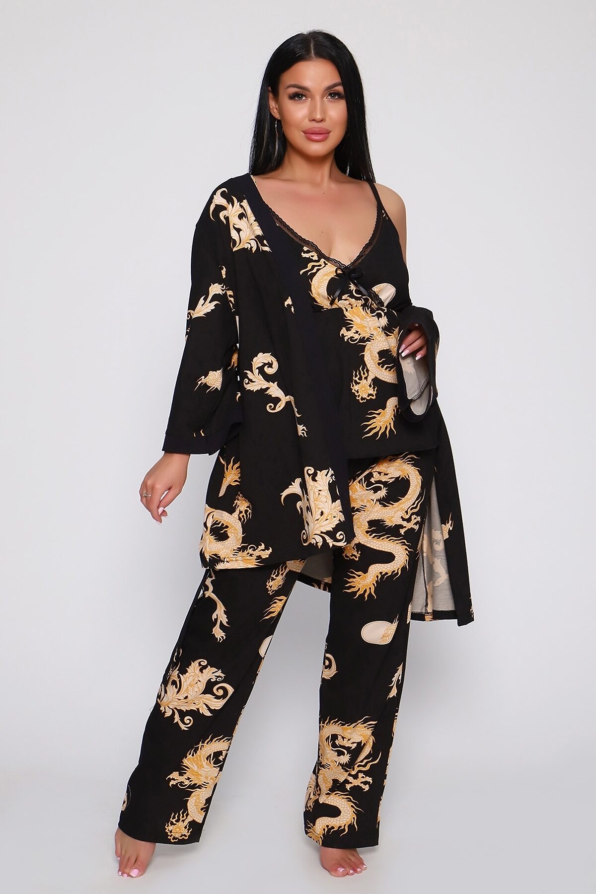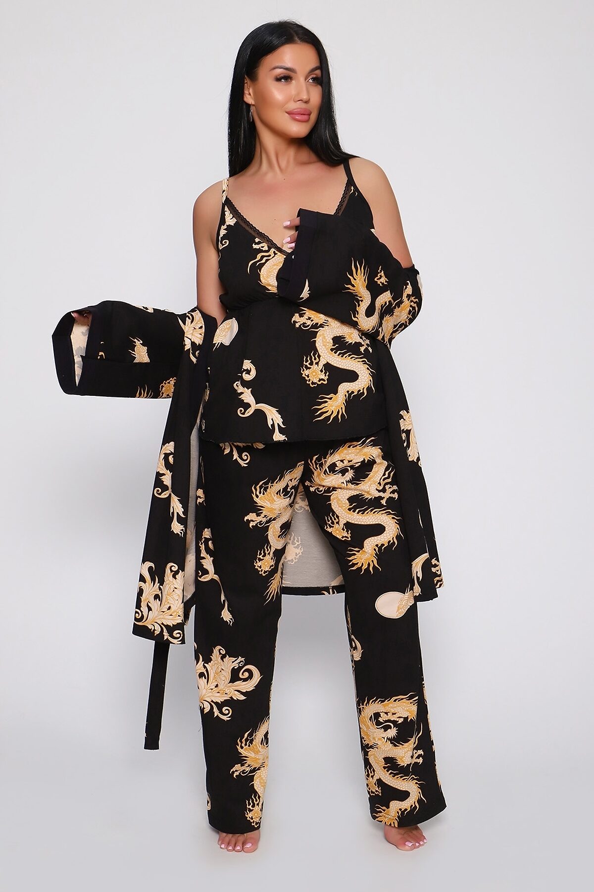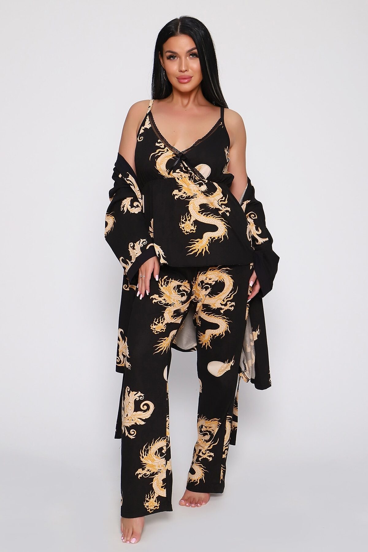 Роскошный комплект тройка с драконами в твоем доме. Состав и материал: Комплект выполнен из натурального хлопка, что обеспечивает комфорт, воздухопроницаемость и приятные тактильные ощущения. Элементы: Включает три предмета: топ на бретелях с кружевной отделкой, свободные брюки и халат с рукавом 3/4. Дизайн: Отличительная особенность принт драконы, который может быть выполнен в различных стилях, от минималистичных до ярких и детализированных. Размерный ряд: Изделие представлено в широком размерном ряде, что позволяет подобрать его для различных типов фигур.