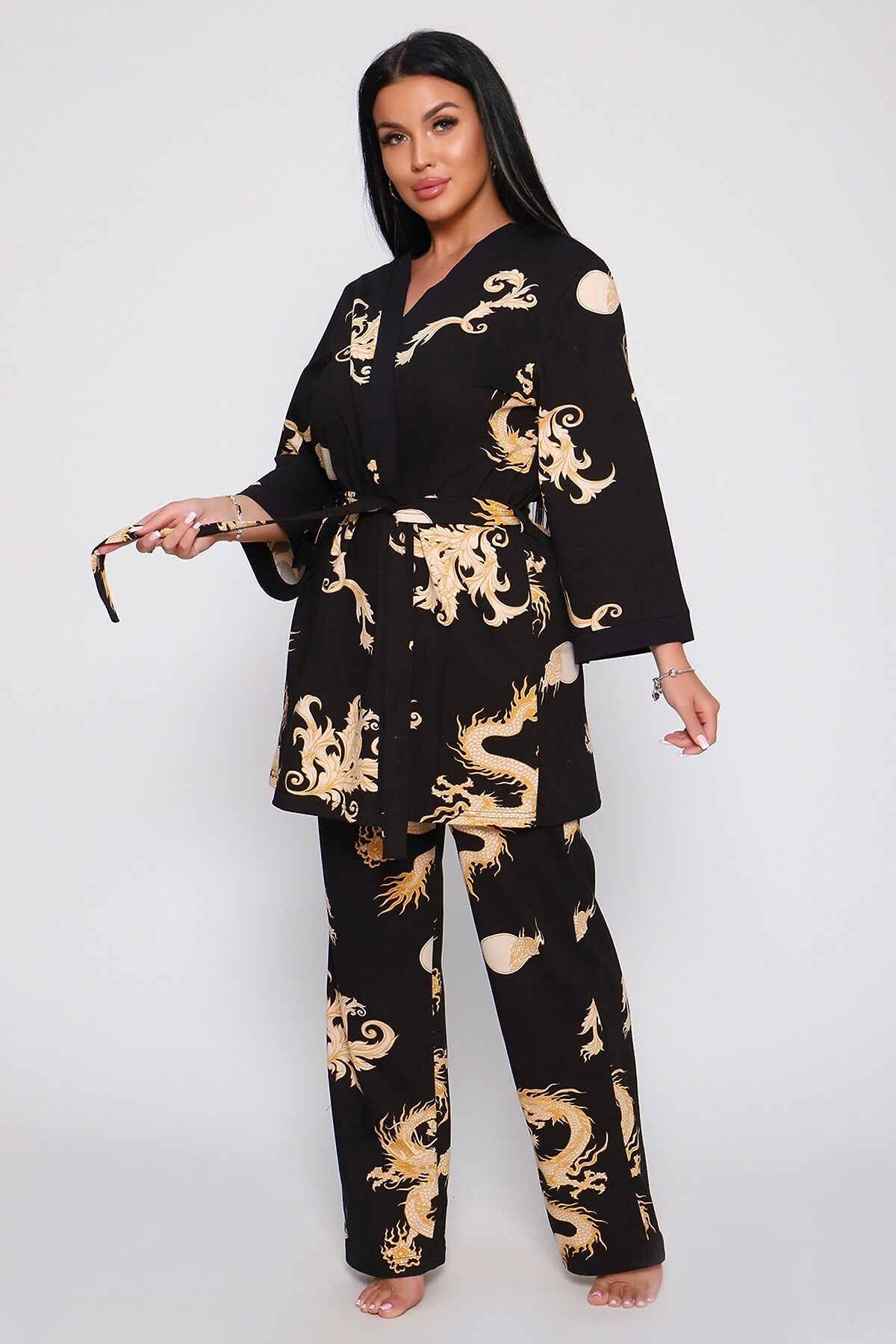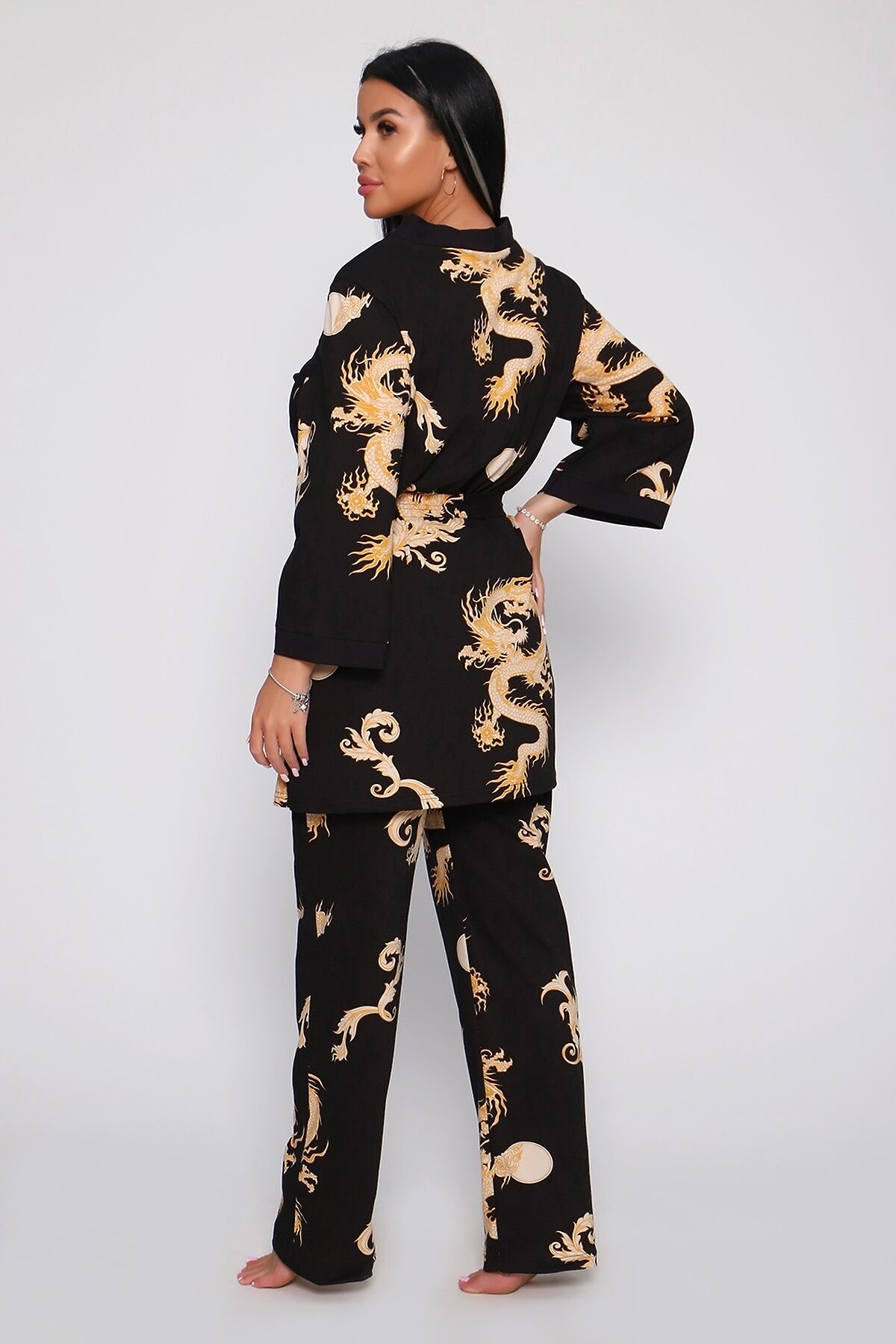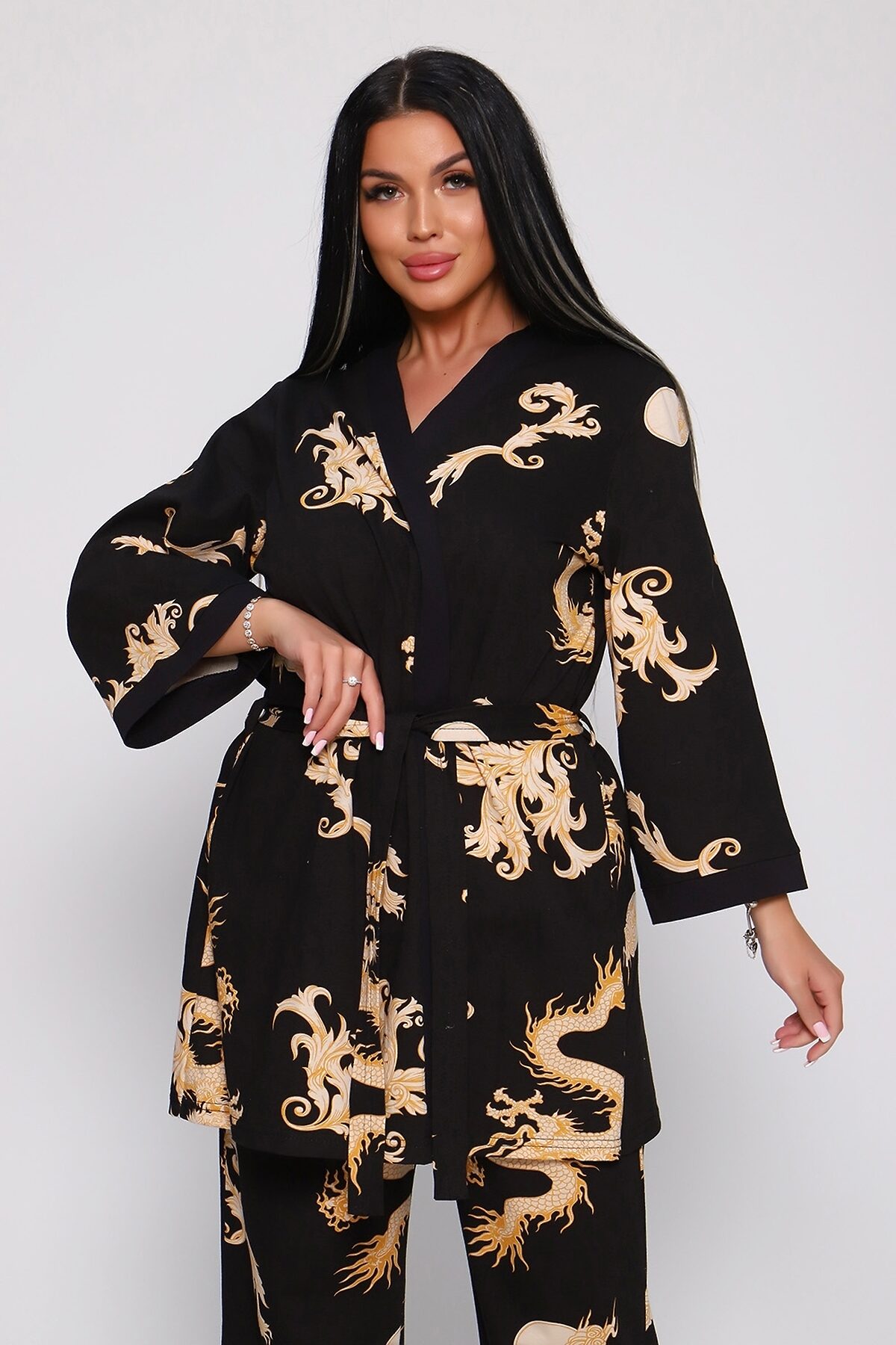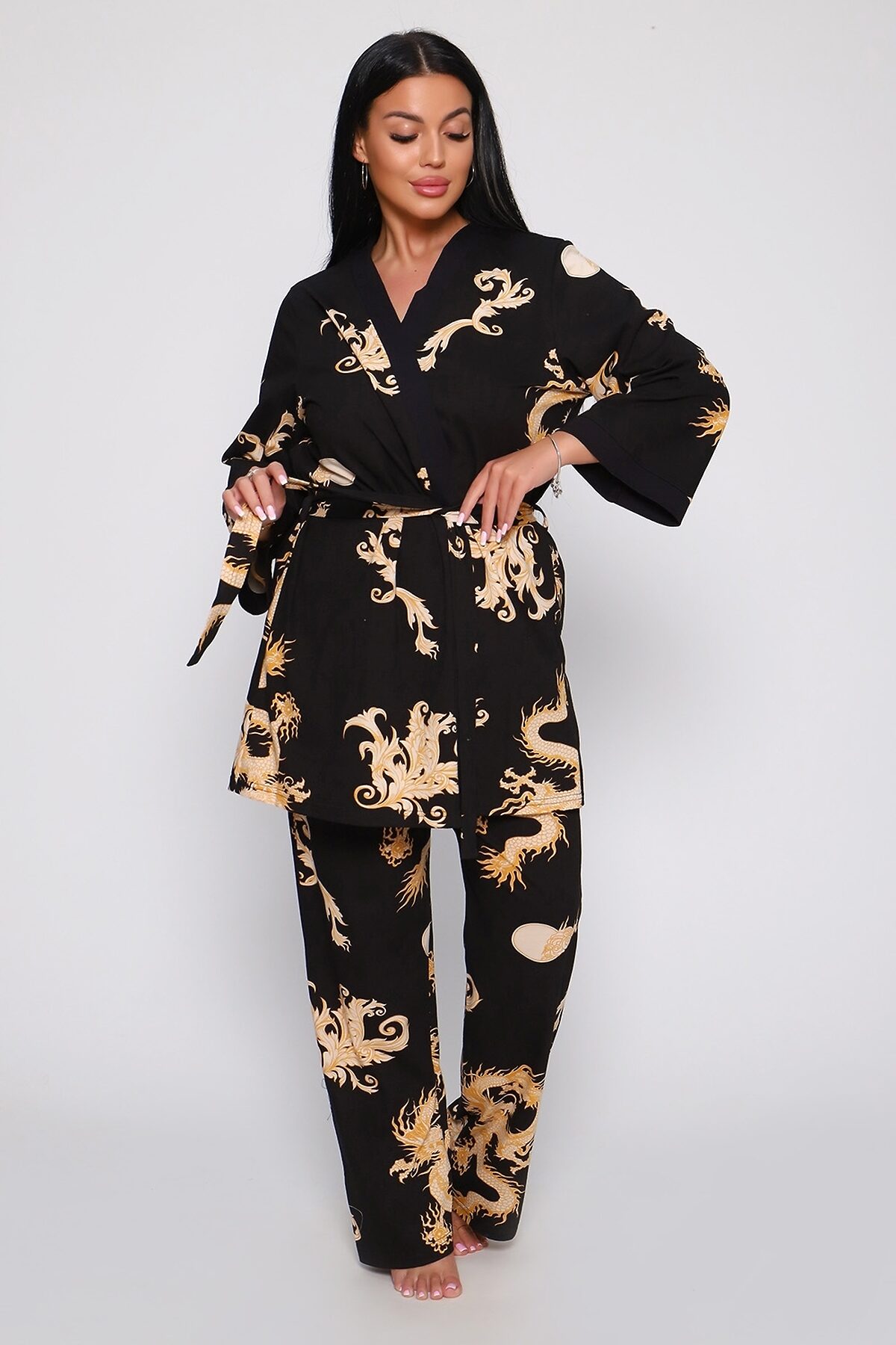 Роскошный комплект тройка с драконами в твоем доме. Состав и материал: Комплект выполнен из натурального хлопка, что обеспечивает комфорт, воздухопроницаемость и приятные тактильные ощущения. Элементы: Включает три предмета: топ на бретелях с кружевной отделкой, свободные брюки и халат с рукавом 3/4. Дизайн: Отличительная особенность принт драконы, который может быть выполнен в различных стилях, от минималистичных до ярких и детализированных. Размерный ряд: Изделие представлено в широком размерном ряде, что позволяет подобрать его для различных типов фигур.