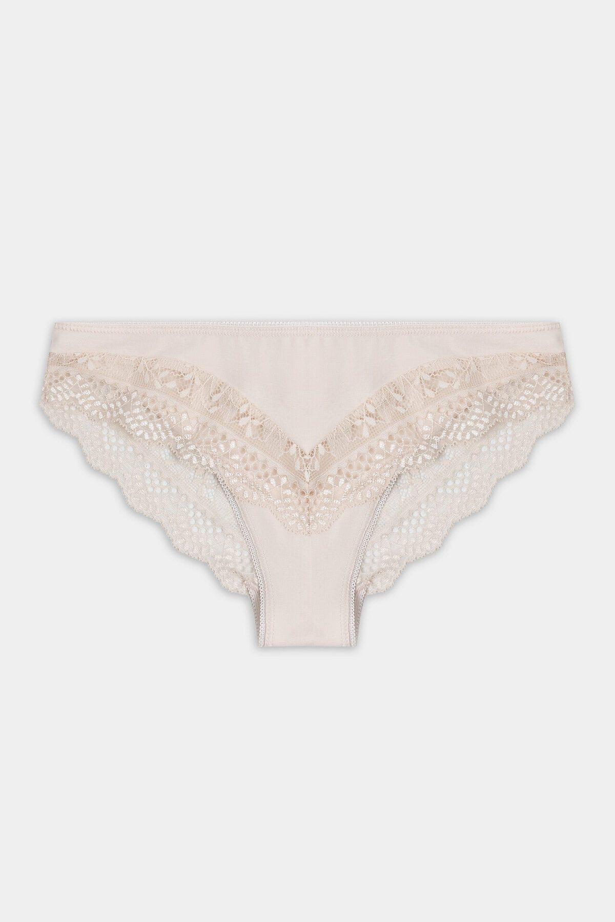 Слип-бикини базовой расцветки из хлопкового трикотажа и вставками из элегантного кружева по нижнему срезу. Линия талии чуть ниже классической. По поясу трусики окантованы эластичной тесьмой. Отличная модель со своей изюминкой!