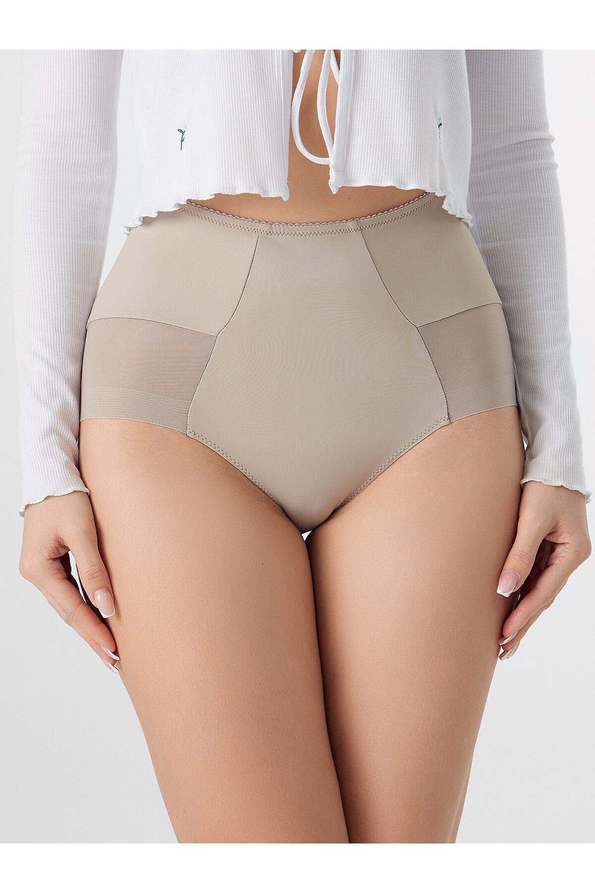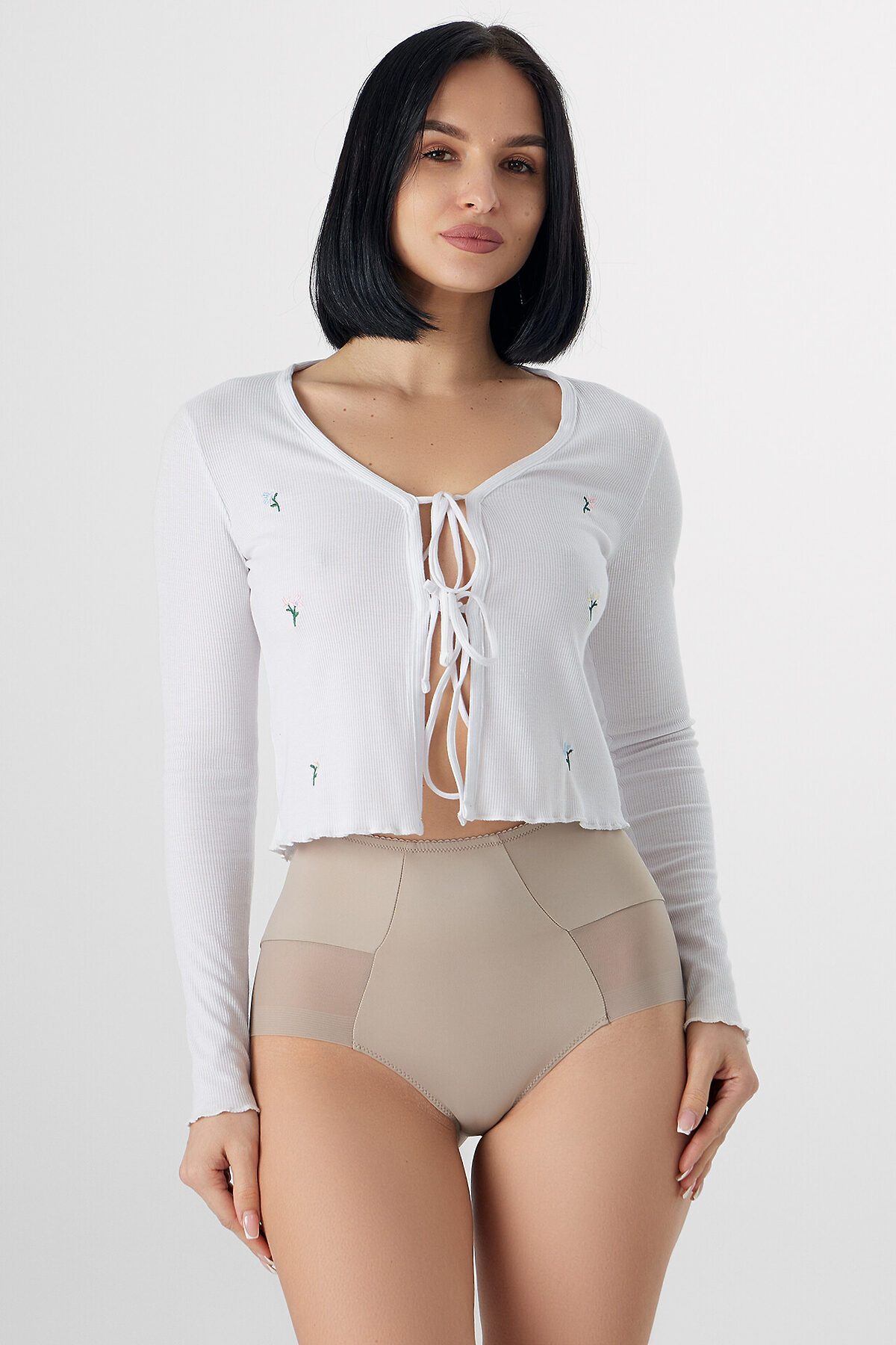 Трусы женские, силуэт макси, выполнены из трикотажного полотна микрофибра без боковых швов. По перед. половинке нижние части боковых деталей декорированы кружевом (сырой срез). Задняя деталь с центральным швом, декорирована кружевом (сырой срез). Подкладка ластовицы выполнена из кулирного полотна. Верхний срез обработан эл. тесьмой 12мм (жесткая с/з WTE1-12, devsel 558W). Срезы по ножкам и ластовице обработаны эл тесьмой 6мм. (жилка WT4-6, devsel 13460W).