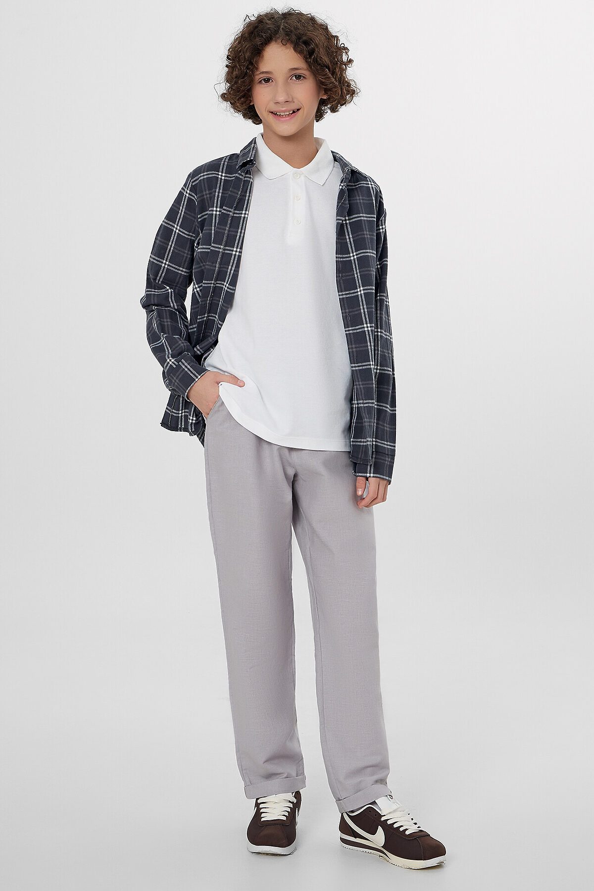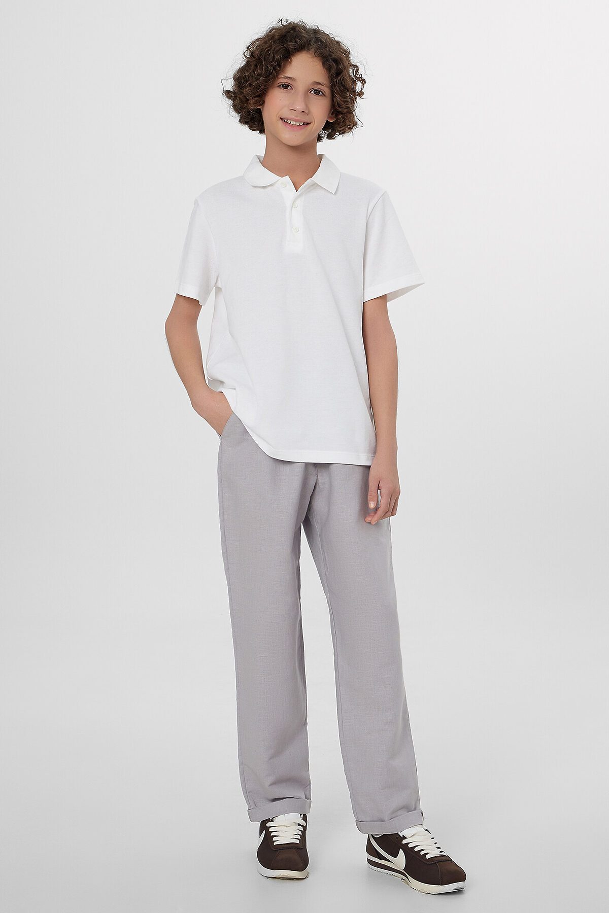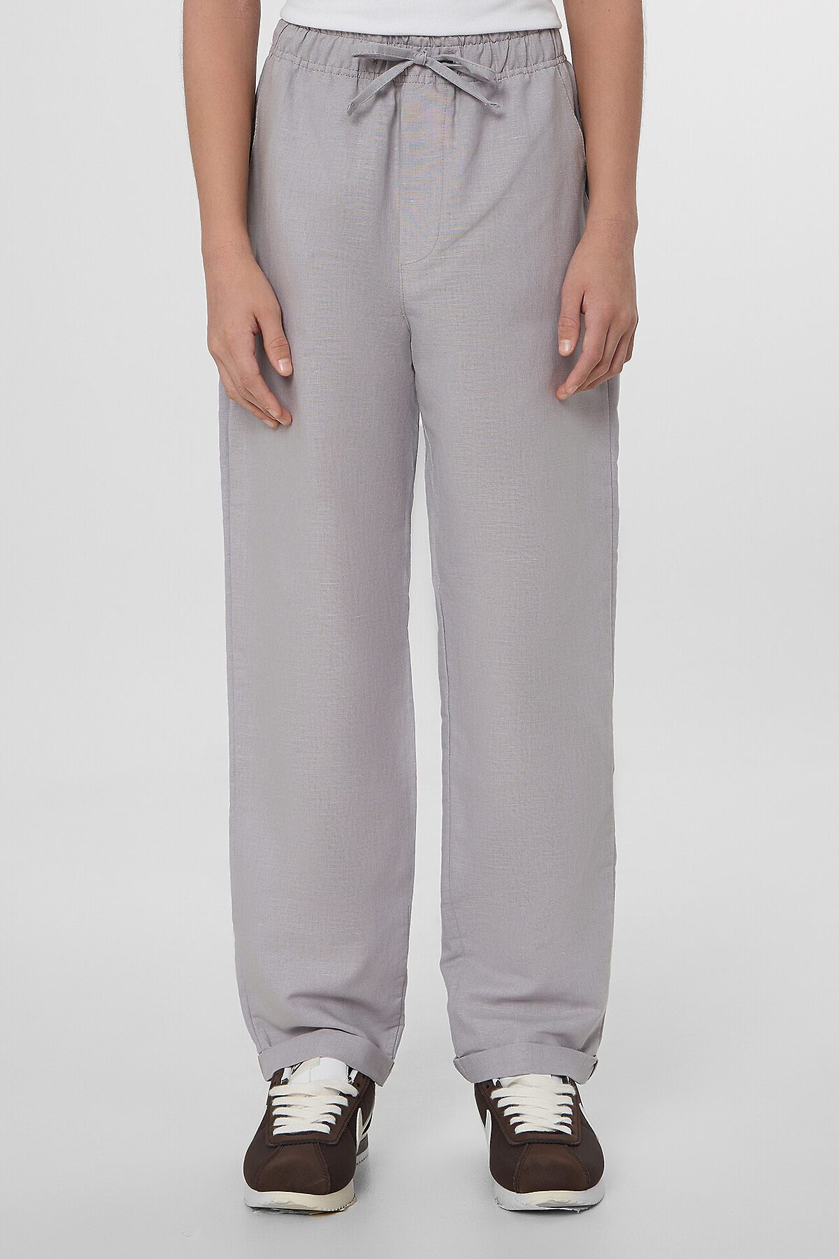 Брюки прямого силуэта. Посадка средняя. Пояс цельнокроеный с эластичной тесьмой внутри. На поясе пробиты петли, заправлен шнур из основного полотна. По переду имитация гульфика, обработаны карманы с наклонным входом от боковых швов. Низ изделия с отворотами.
