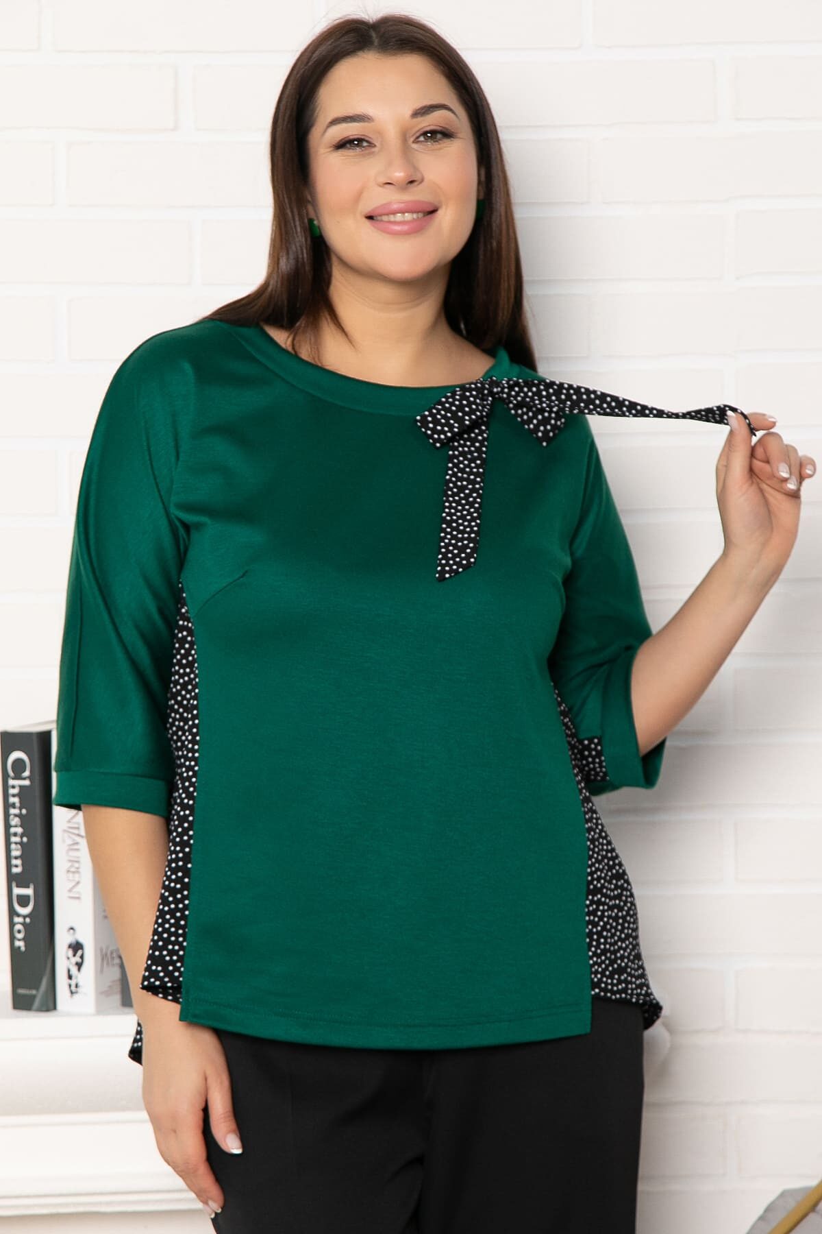 Изящная блуза в изумрудно-черном цвете и элегантном А-силуэте станет прекрасным дополнением вашего гардероба. Эта модель, созданная из двух видов ткани, сочетает комфорт и утонченность. Передняя часть выполнена из трикотажа, а спинка имеет трикотажную планку, которая переходит во второй вид ткани со встречной складкой, придавая блузе уникальный вид. Цельнокроеные рукава заканчиваются манжетом из основной ткани, что добавляет образу завершенности. Завершающим акцентом служит бант вдоль горловины, придающий блузе романтичный и женственный характер. Эта блуза идеально подходит как для повседневных, так и для более торжественных образов.